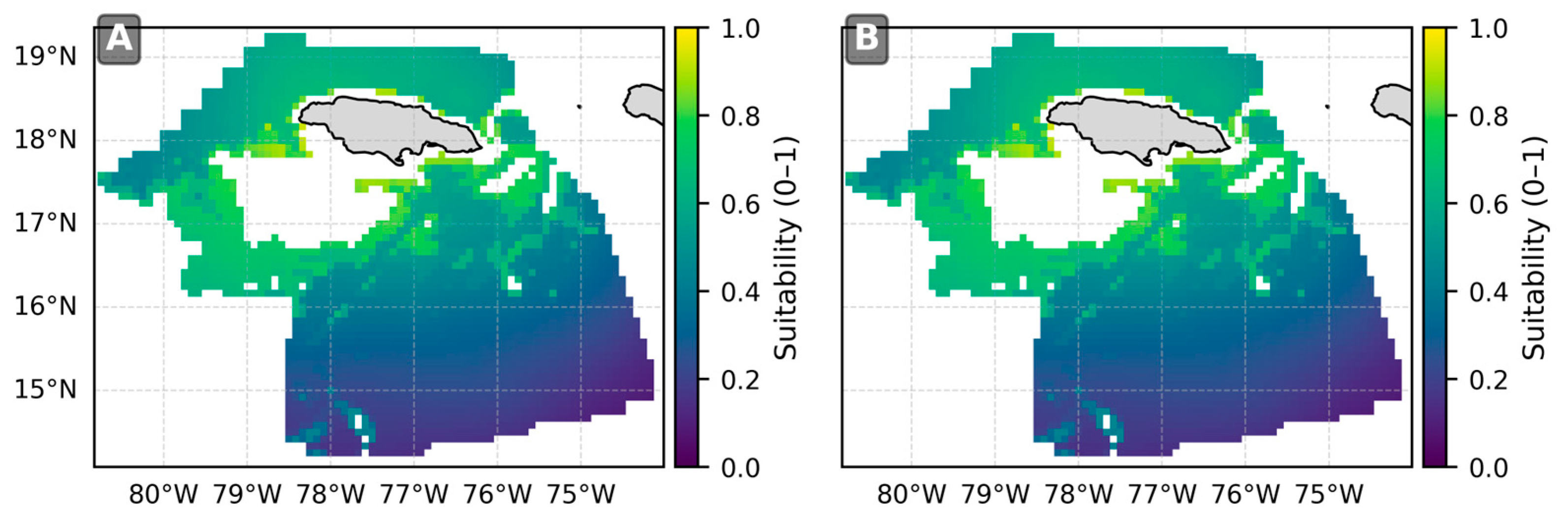 32]. All MPA polygons within and adjacent to Jamaica’s EEZ were merged and used to create an exclusion mask for the suitability analysis.