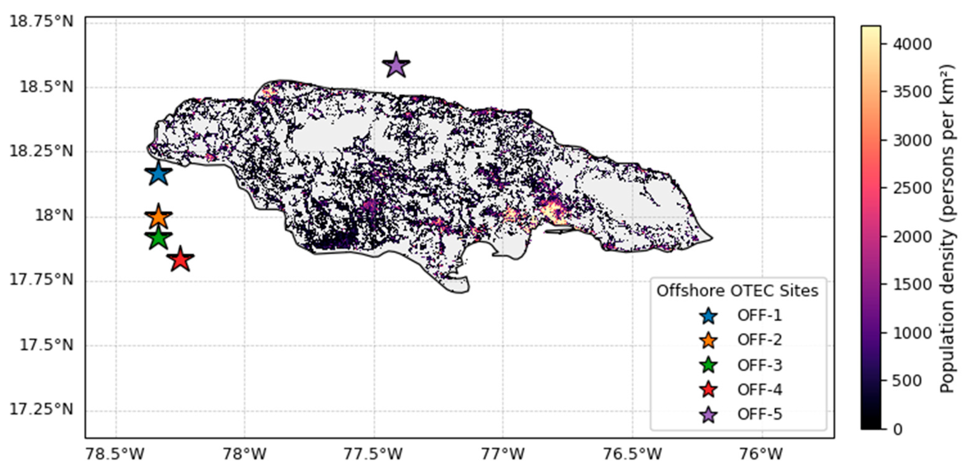 Spatial analysis reveals that high-ranking offshore sites (OFF-1: 34,552 people within 20 km; OFF-5: 37,186 people) align with moderate-to-high coastal population densities along Jamaica’s northern and western coasts, suggesting that OTEC deployment could directly serve nearby load centres while reducing transmission requirements.