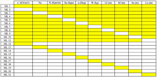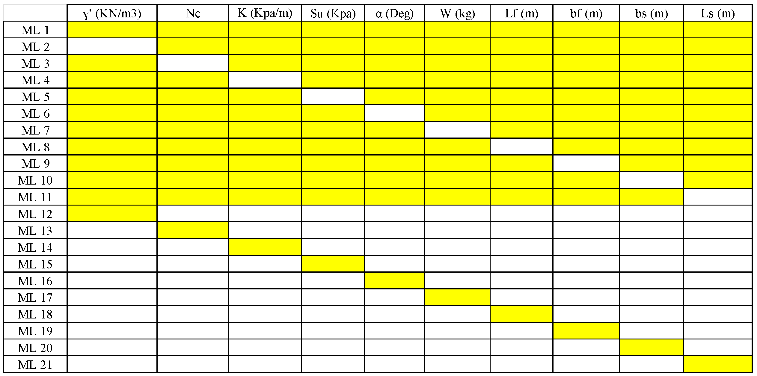 Figure 4 illustrates that the initial model (ML 1) included all eleven input parameters. However, for ML 2 to 11, a single input parameter was systematically removed in each iteration to identify the optimal model. Subsequently, ML 12 to 21 were analyzed with only one input parameter at a time, enabling the identification of the most influential parameters. In the present study, feature-dropping analysis was focused on, as the primary aim was to evaluate the relative contribution of geometry and soil parameters within the curated dataset. This method was considered appropriate for the dataset size and provided direct, model-agnostic insight into which variables most influenced the predictions.
