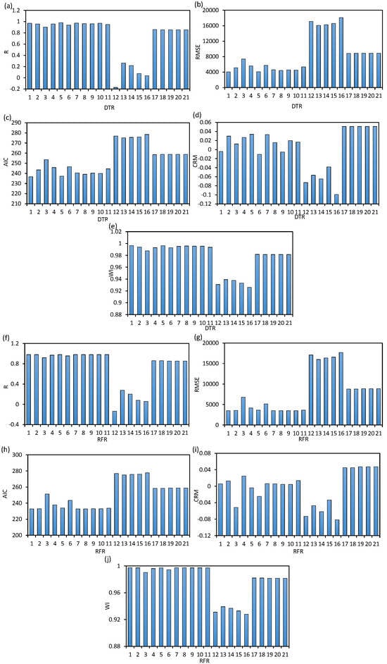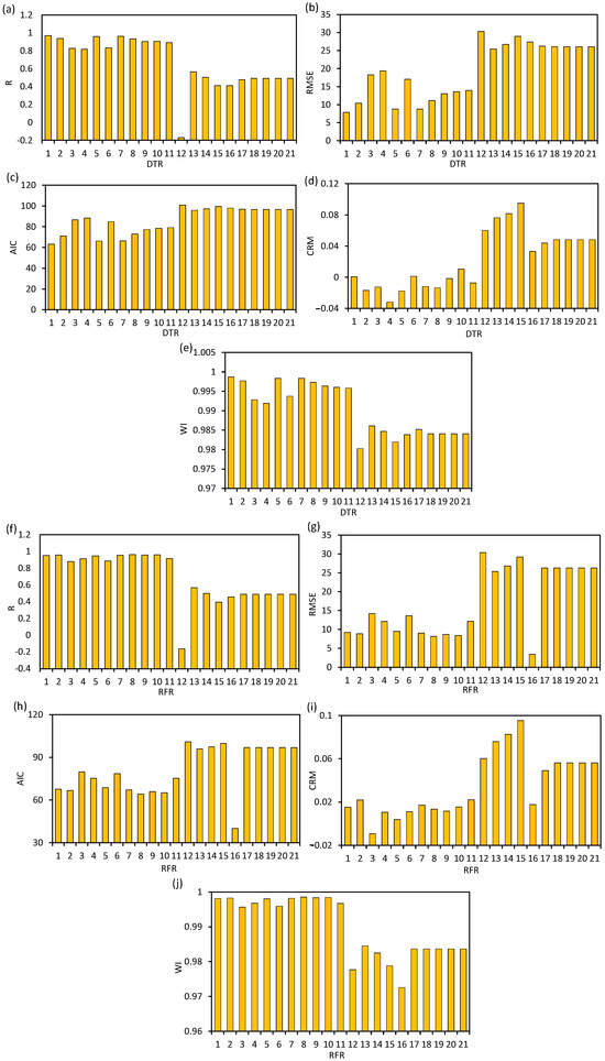Figure 6 demonstrates the results of the statistical criteria obtained for the efficiency of DEAs predicted by the DTR and RFR models.