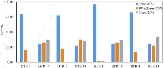 In terms of efficiency prediction, the RFR 8 model stood out, achieving 82% of predictions within the <10% error range and only 18% exceeding 10%, suggesting a high degree of precision. DTR 1 also performed reliably, with 77% accuracy within the 10% margin, though 23% of its predictions fell in the higher error band. On the other hand, DTR 13 and RFR 13 exhibited more distributed errors, with both models producing over one-third of predictions exceeding a 20% error. This behavior could be attributed to their inability to capture the complex interaction effects between input parameters under varying load and embedment scenarios.