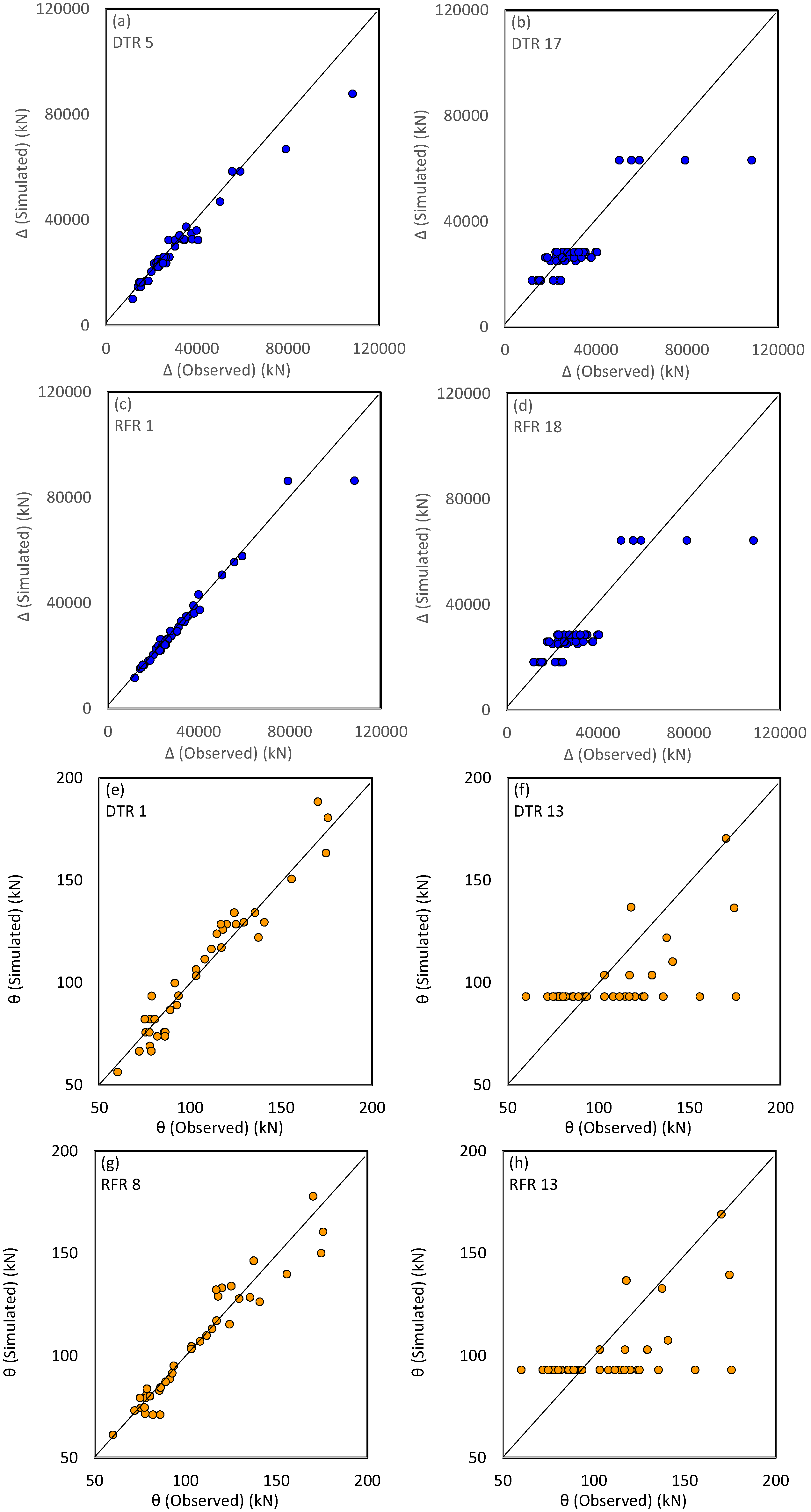 Extreme DR values in DTR 13 and RFR 13 (DR(max) = 1.550, DR(min) = 0.530) revealed limitations in predicting capacity for anchors with unconventional geometries (e.g., very high bf) or in highly heterogeneous soils. These outliers typically corresponded to cases where local soil variations or anchor installation effects dominated the capacity mechanism. However, their average DR values (0.977) still fell within acceptable engineering tolerances, suggesting the models remained useful for preliminary design despite occasional large errors.