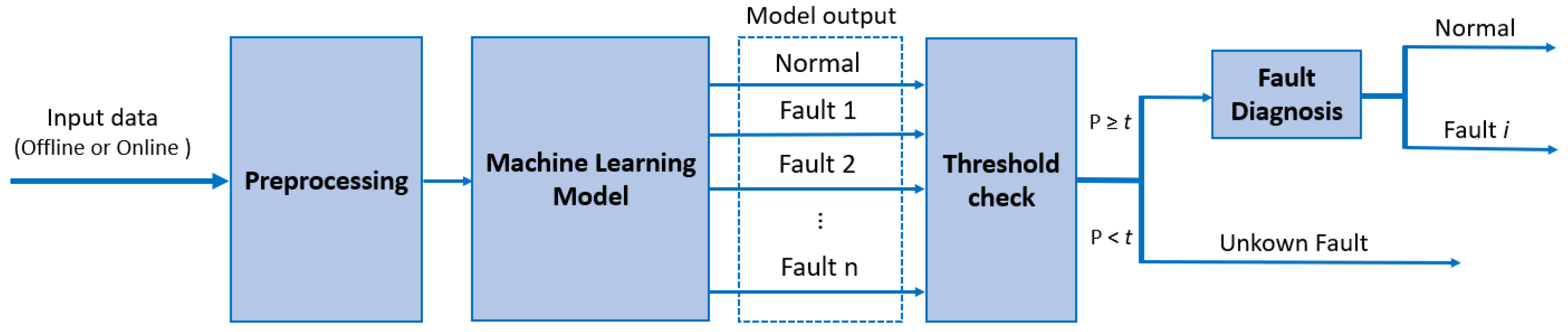 - The sixth component corresponds to the framework output. If P is greater than or equal to t, the system classifies the input signal as belonging to one of the known classes. Otherwise, the system classifies the input signal as an unknown fault, not represented within the model’s training data.