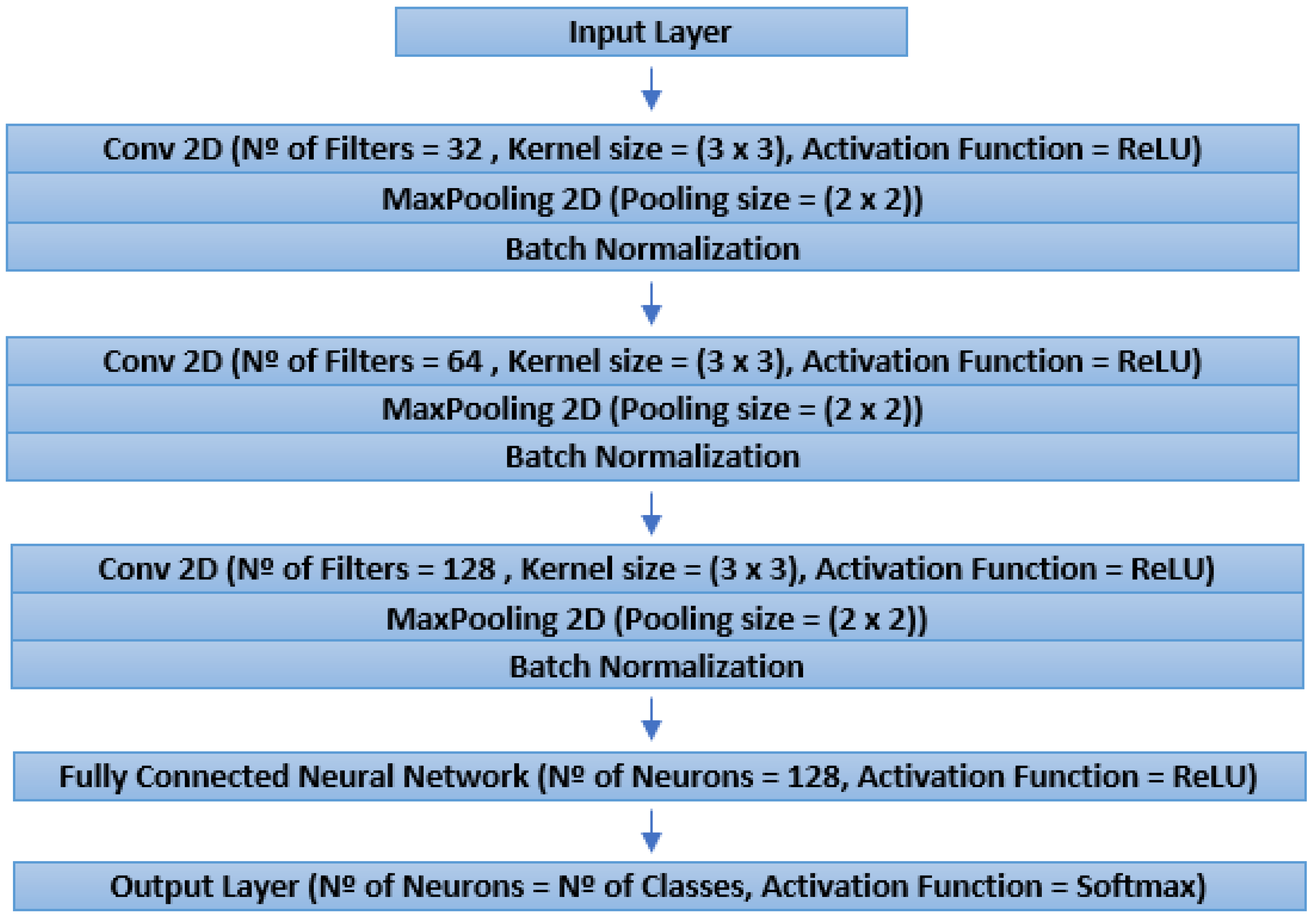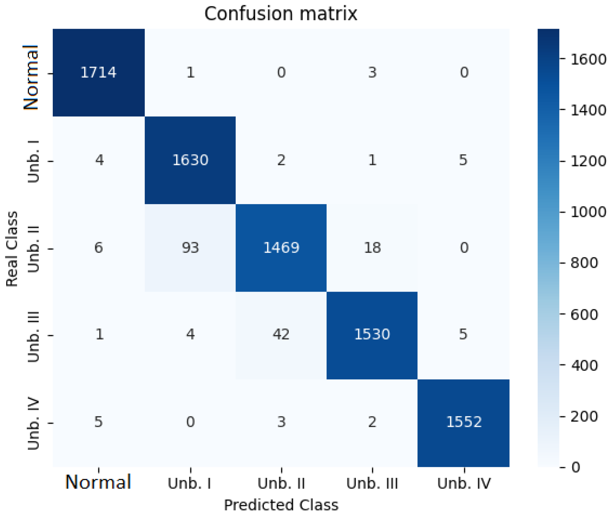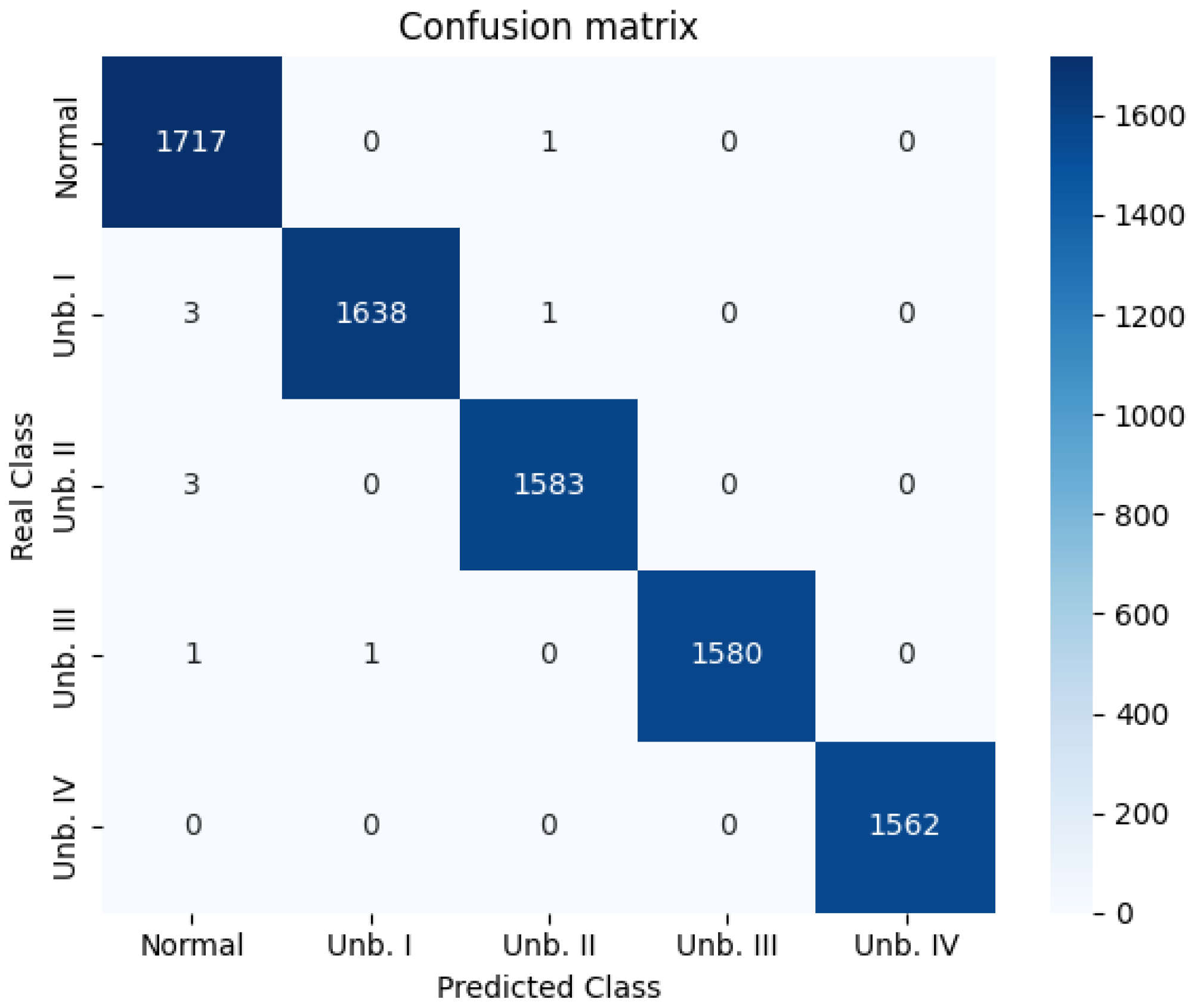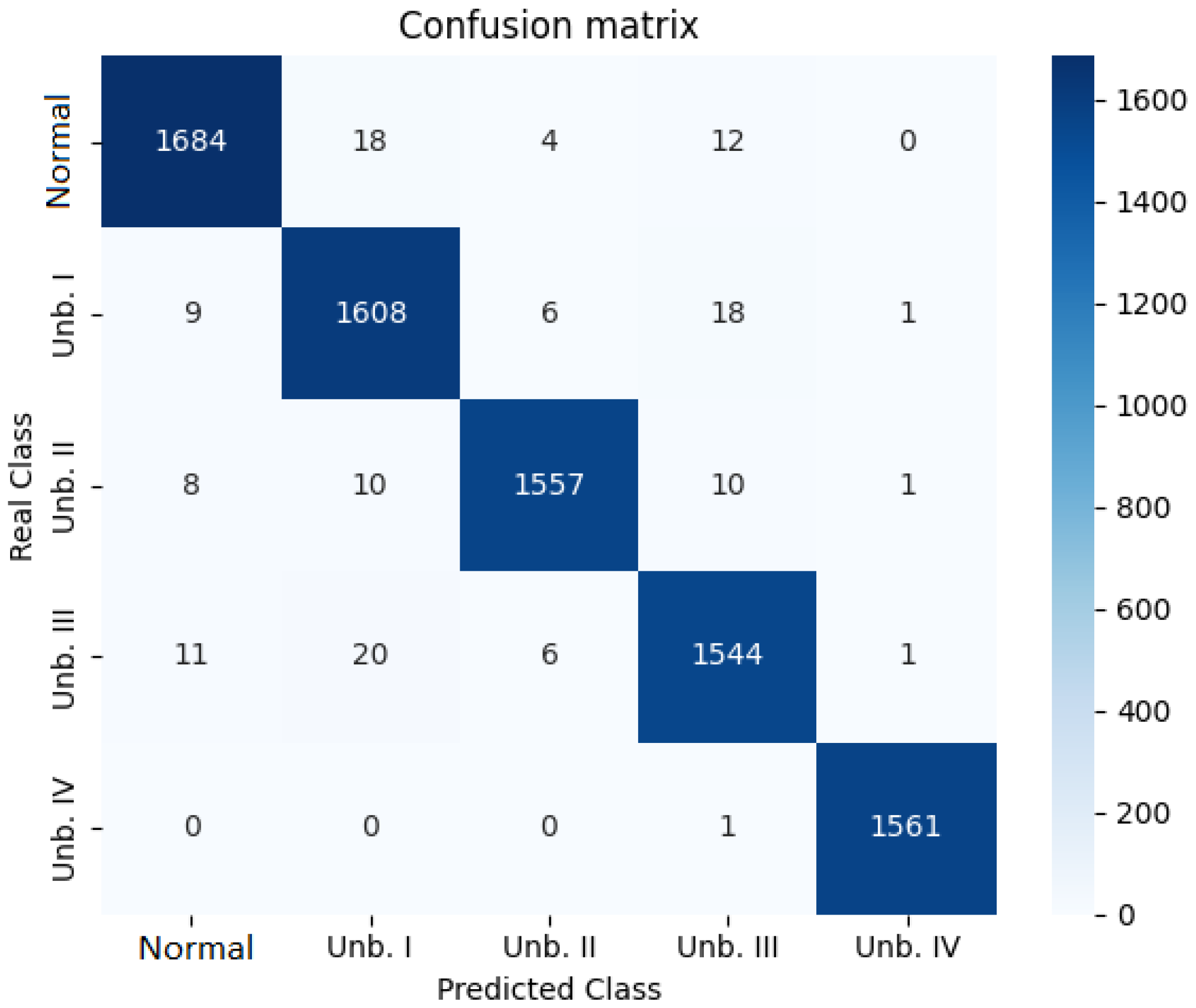 - The fourth component corresponds to the model’s output. The output consists of mutually exclusive classes, where the model assigns a score to the input sample across all possible classes, typically expressed as a probability distribution. The first class, Normal, indicates the absence of fault, confirming that the machine is operating under normal conditions. The remaining classes, from Fault 1 to Fault n, correspond to the different fault types or, alternatively, to varying severity levels of a particular fault if such gradation was included during model training. For example, Fault 1 and Fault 2 may both indicate unbalance, with Fault 2 corresponding to a higher severity level than Fault 1. The total of n + 1 output classes enables the proposed framework to perform automatic multi-fault diagnosis.