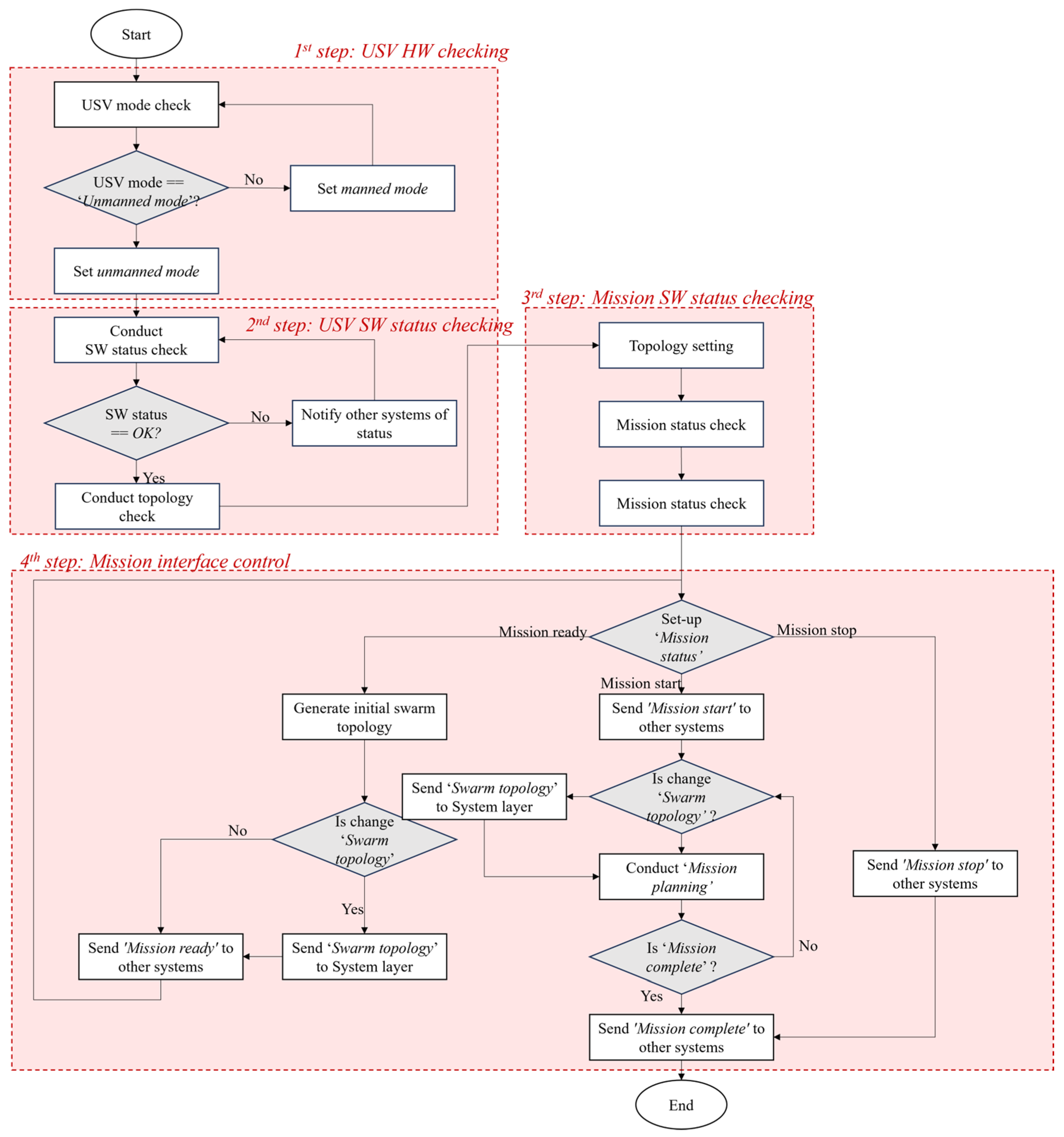 Chicago/Turabian StylePark, Hee-Mun, Jin-Hyeon Sung, Hong-Sun Park, Yeong-Hyun Lim, Joono Sur, and Kyung-Min Seo. 2026. "A Hierarchical, Modular Interface and Verification Architecture for Mission Planning in Swarm Unmanned Surface Vehicles: Simulation and Sea-Trial Validation" Journal of Marine Science and Engineering 14, no. 3: 302. https://doi.org/10.3390/jmse14030302