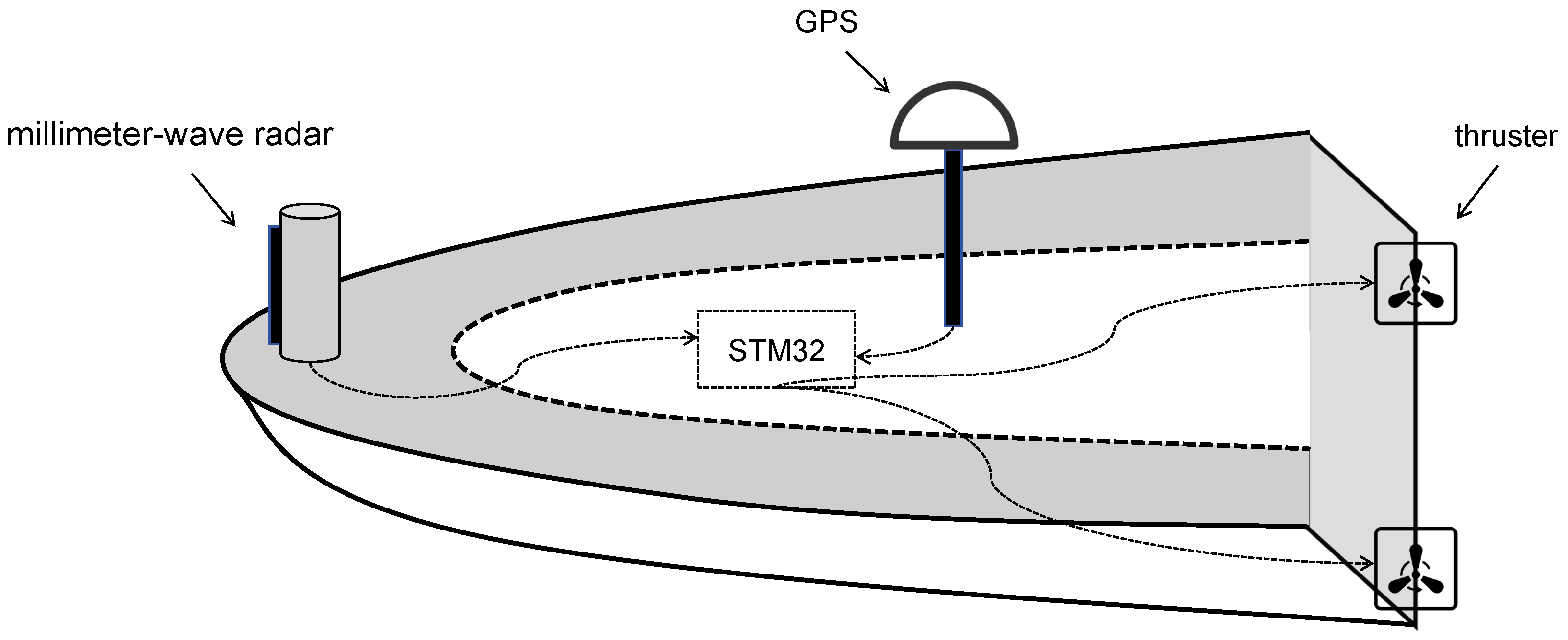 In this paper, we also designed an experimental platform for an unmanned vessel driven by dual thrusters, as shown in Figure 14. The primary equipment installed on the unmanned vessel includes a millimeter-wave radar and two thrusters, along with a GPS (Global Positioning System) system to determine its current position, as illustrated in Figure 15. The primary parameters of the unmanned vessel and equipment are shown in Table 2. In safe and open-water areas, the unmanned vessel maintains straight-line navigation directly ahead, with the millimeter-wave radar installation angle aligned with the vessel’s heading. During experiments, static obstacle scenarios were constructed by deploying stationary floating objects, while moving floating objects simulated dynamic obstacles.