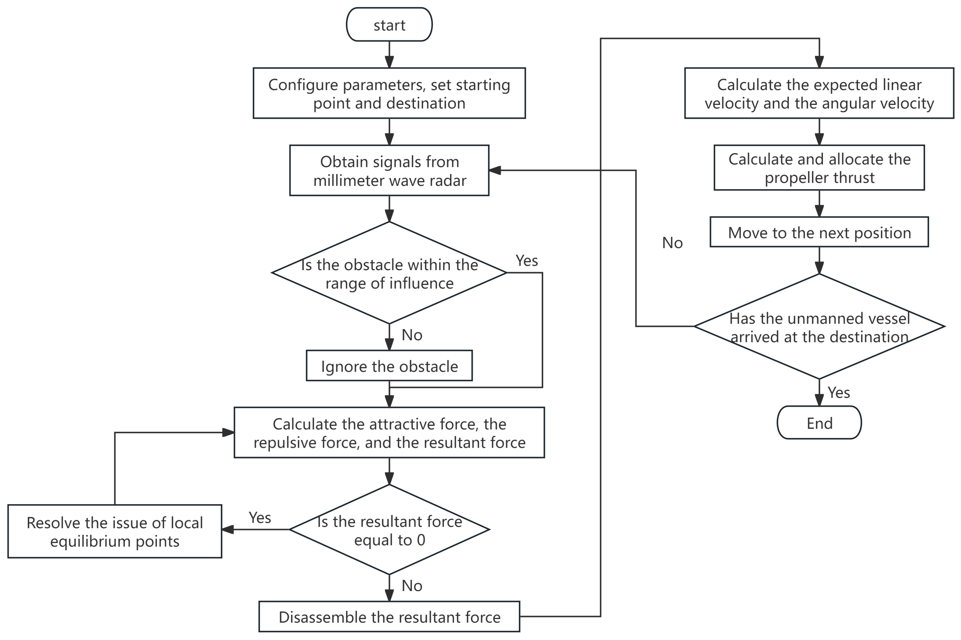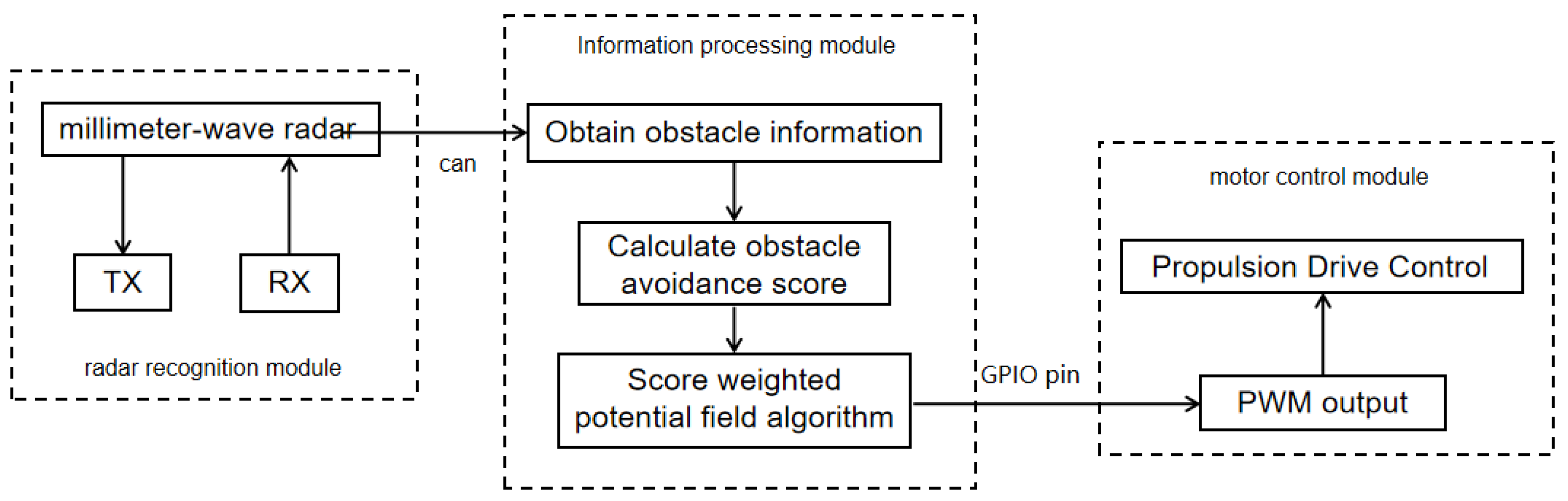 The overall architecture of the unmanned vessel is shown in Figure 1. The millimeter-wave radar-based obstacle avoidance system for the unmanned vessel consists of a radar recognition module, an information-processing module, and a motor control module, as illustrated in Figure 2. A millimeter-wave radar mounted at the bow forms the radar recognition module, acquiring obstacle information through the radar’s antenna principle. The information-processing module serves as the core of the entire obstacle avoidance system. The overall obstacle avoidance control and motion execution process, as illustrated in Figure 3, primarily involves receiving and processing radar data to generate obstacle avoidance scores. Based on the improved artificial potential field method, it calculates the thrust required for the unmanned vessel’s propellers, converts this thrust into control signals, and transmits them to the drive control module to regulate the vessel’s speed and direction.