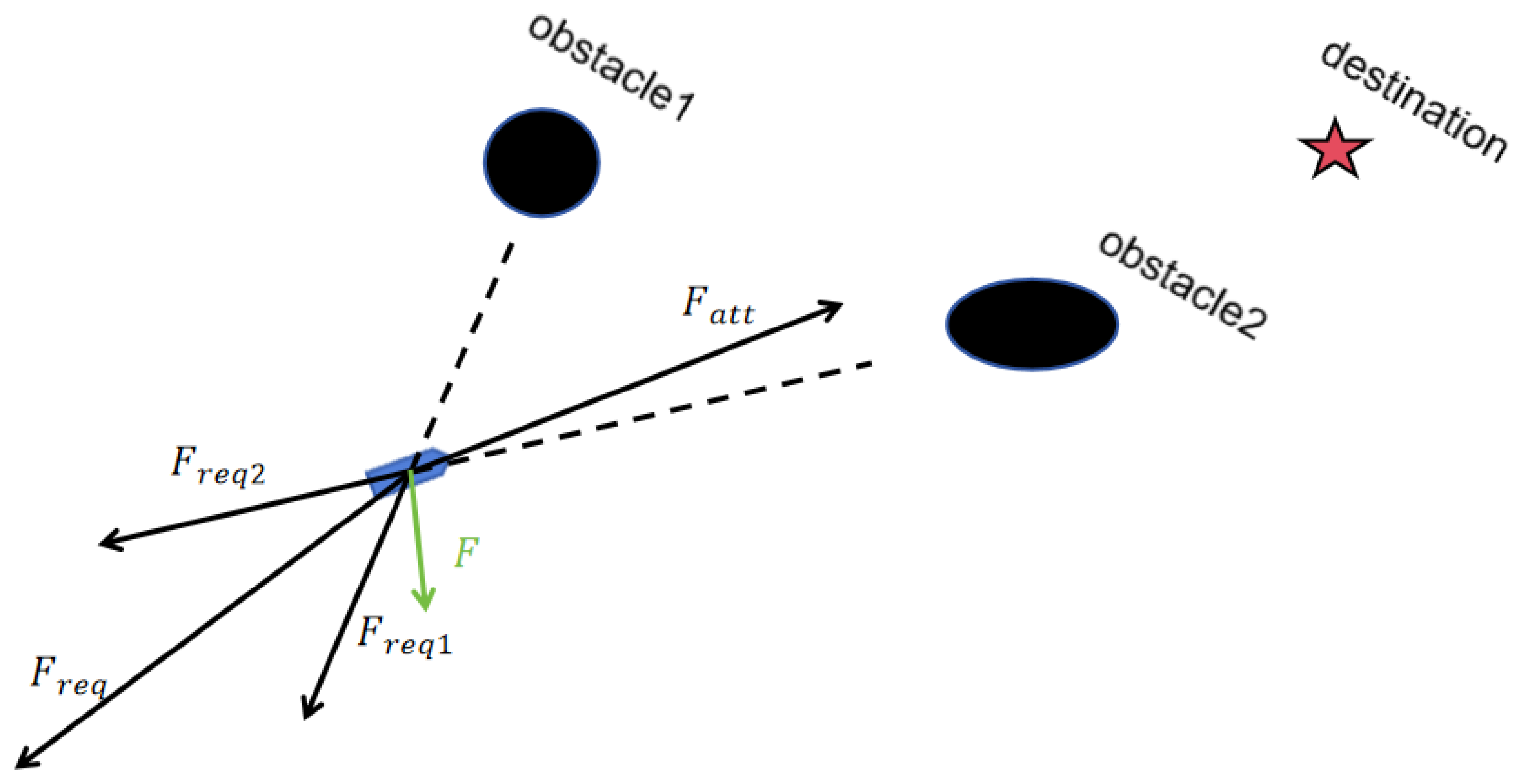 The total potential field U and resultant force F for the unmanned vessel can then be expressed by the following formula: