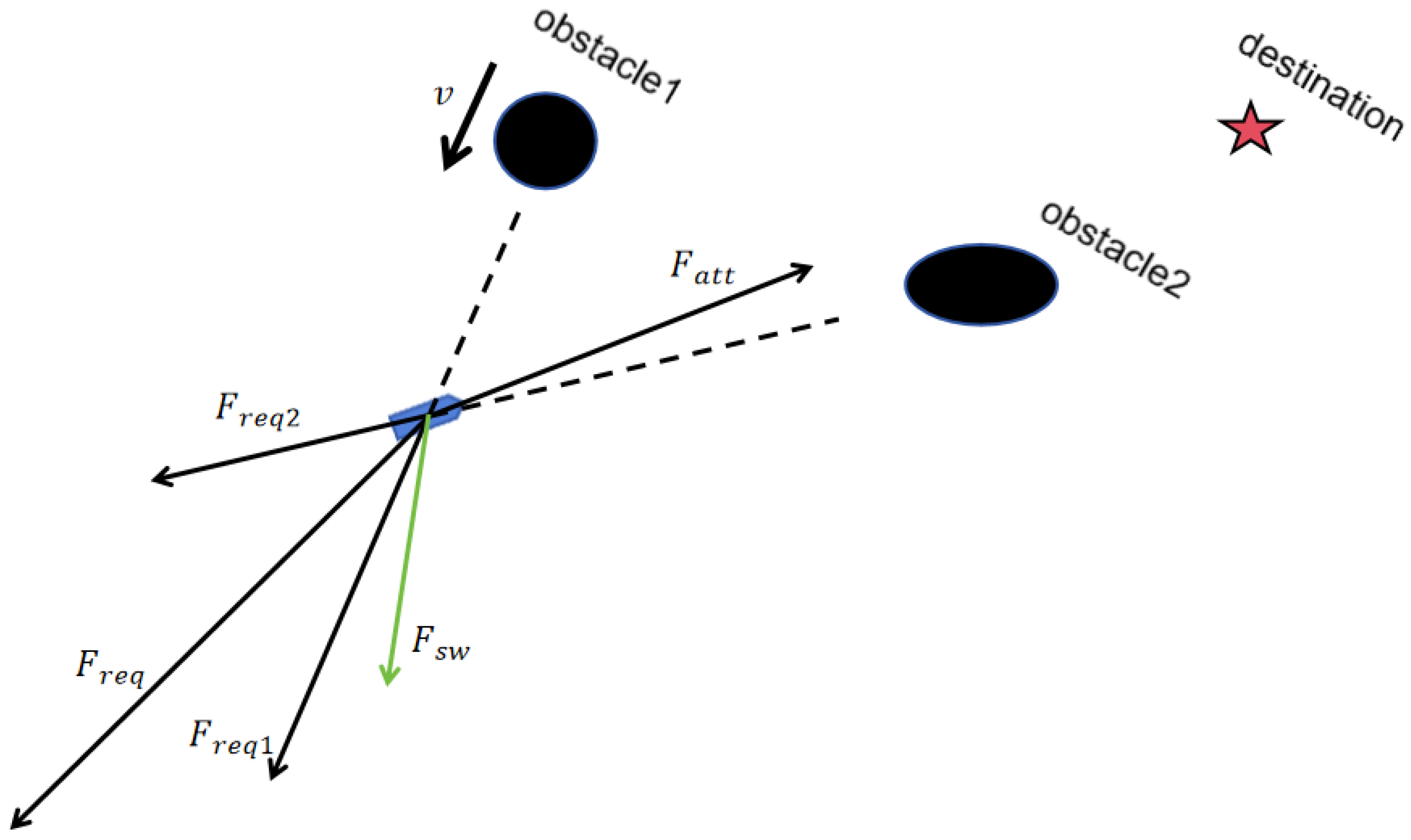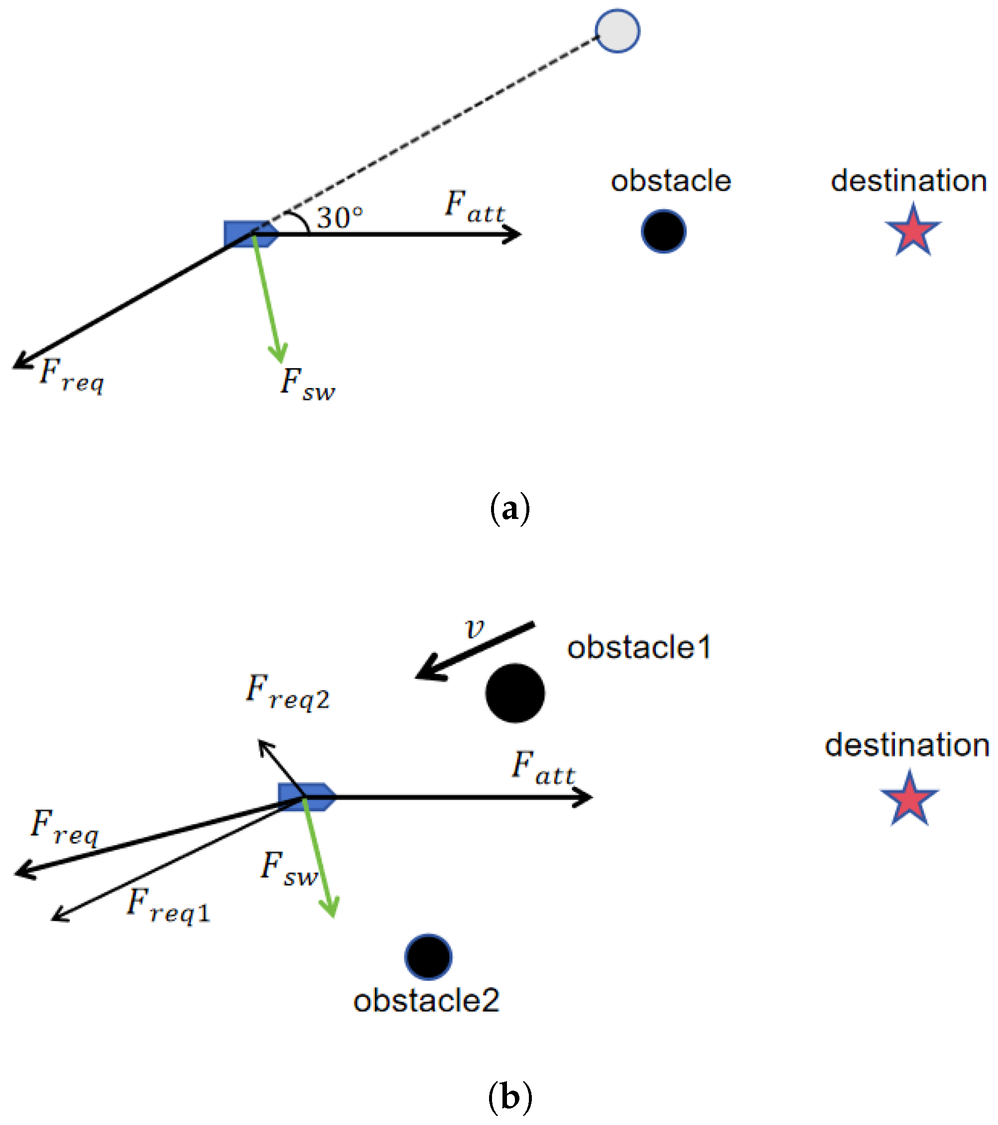 Substituting η s w l into Equation (12) allows for the adjustment of the repulsive force exerted by each obstacle on the unmanned vessel. Based on this repulsive force, the resultant force F s w is recalculated to enable the vessel to escape the local equilibrium point.
