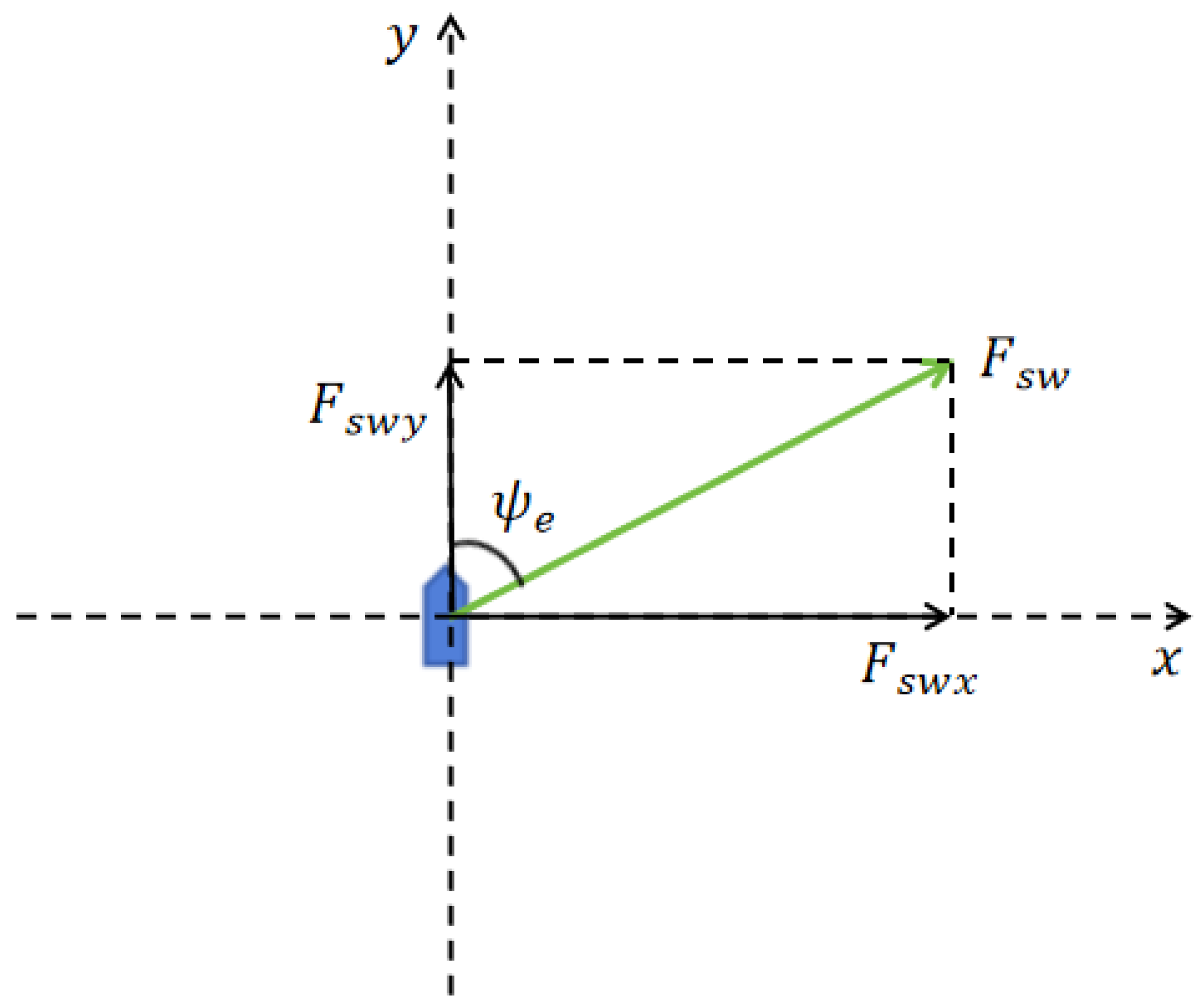 Following the calculation of the resultant force using an improved artificial potential field model, the unmanned vessel’s motion control system determines the actual propulsion and steering commands based on this resultant force, thereby achieving continuous obstacle avoidance and target tracking. As illustrated in Figure 8, using the unmanned vessel itself as the coordinate system, the resultant force and repulsive force are decomposed into lateral and longitudinal components, respectively. These components are then superimposed to yield the resultant force F s w , its lateral component F s w x , and its longitudinal component F s w y . Through F s w x and F s w y , the desired heading ψ e and the magnitude of the resultant force F s w m can be obtained: