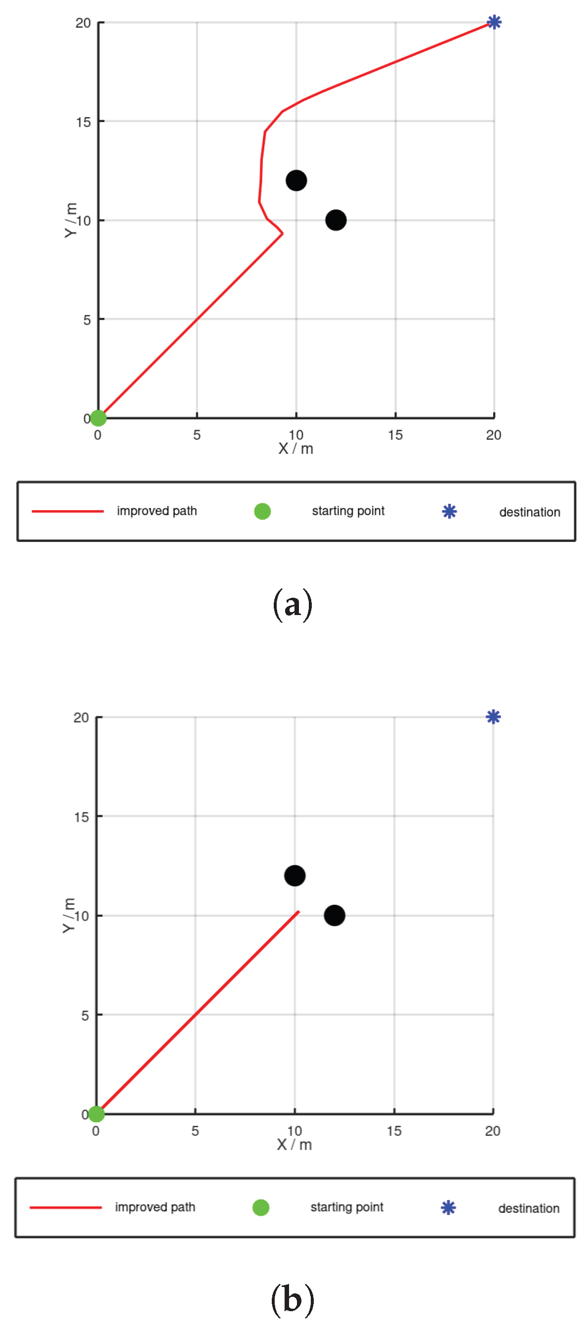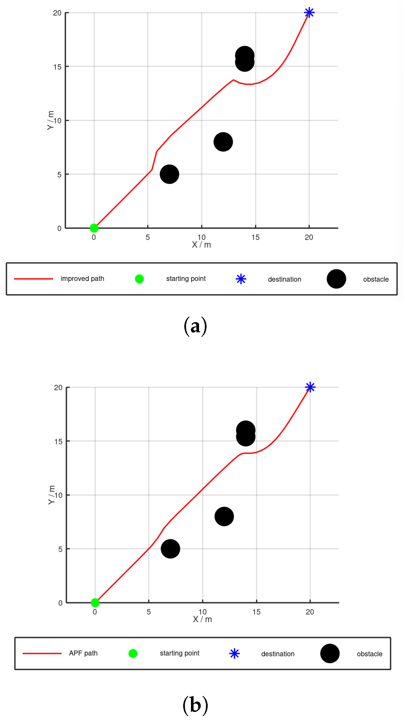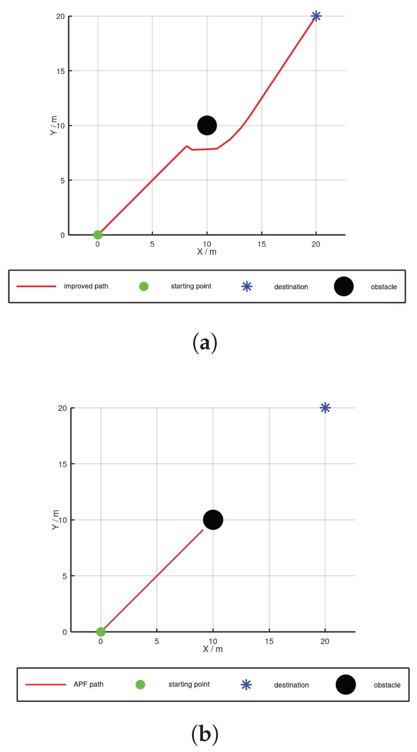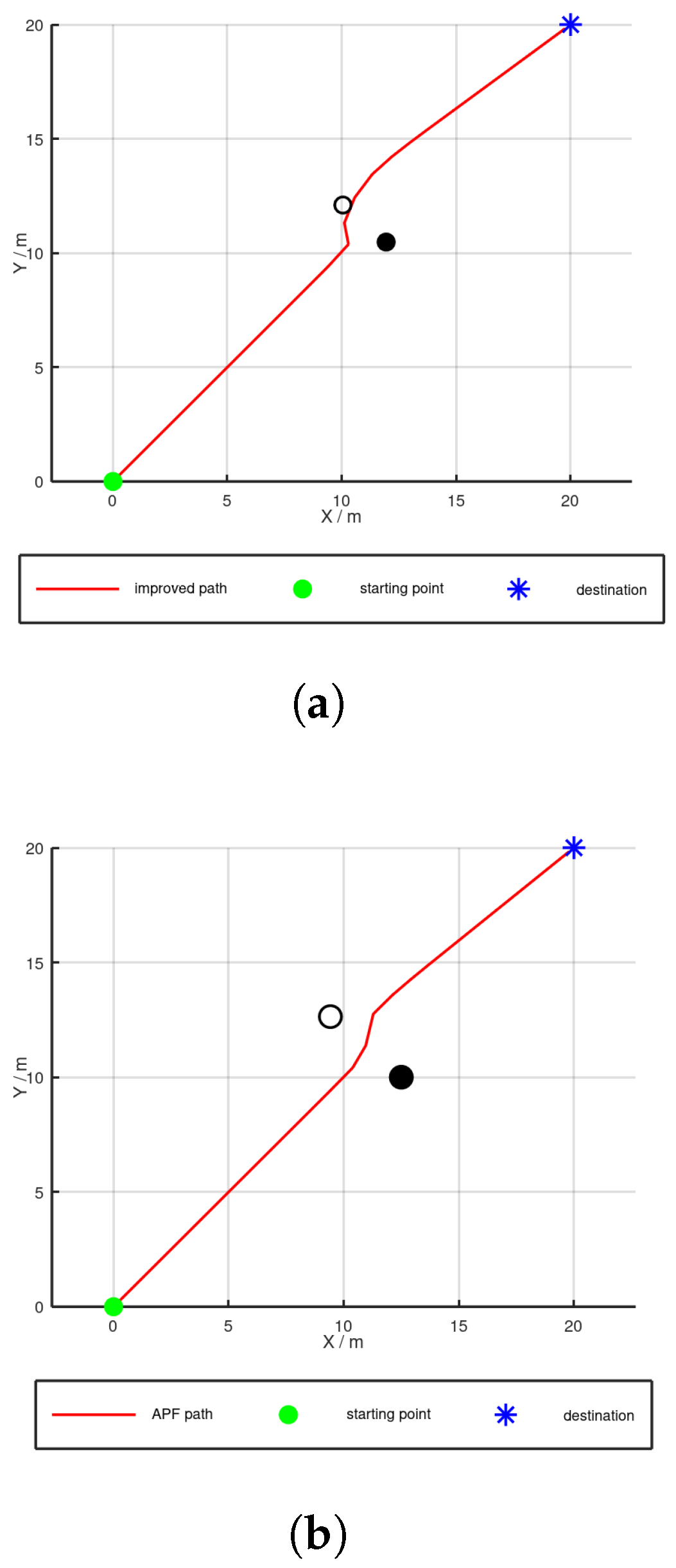 Figure 10. Static obstacle simulation scenario comparison: (a) Improved APF. (b) Traditional APF.
