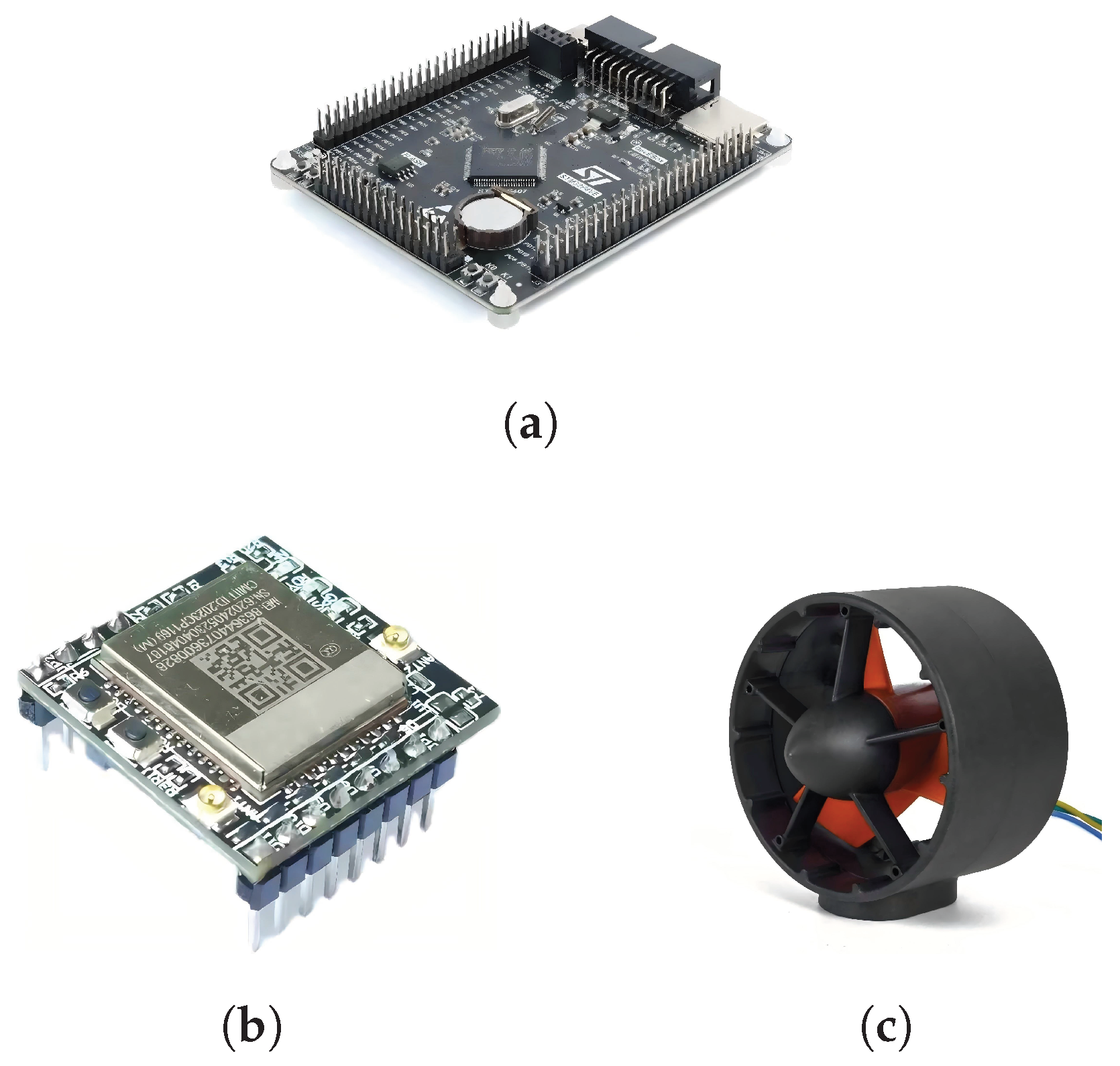 Figure 15. Experimental Equipment: (a) STM32F407 (YouXin Electronic, Shenzhen, China). (b) GPS Module (Xiao Yi Intelligence, Guangzhou, China). (c) Thruster (Xuzhou Yuxin Electromechanical Co., Ltd., Xuzhou, China).