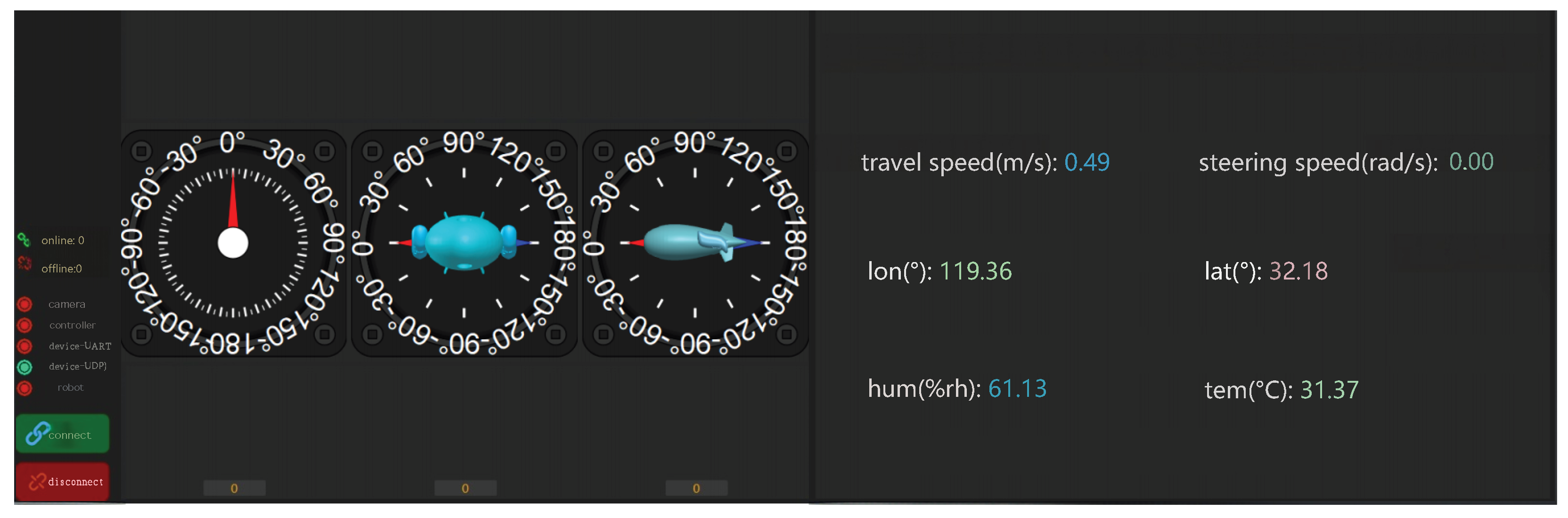 Throughout the experiment, the unmanned vessel equipped with a millimeter-wave radar system continuously gathered obstacle data. This information was integrated with an enhanced artificial potential field method to control obstacle avoidance. The vessel’s current navigation data were transmitted to the host computer software at 0.5 s intervals, as illustrated in Figure 16. The host computer also displayed real-time maps and operational views of the unmanned vessel via GPS.