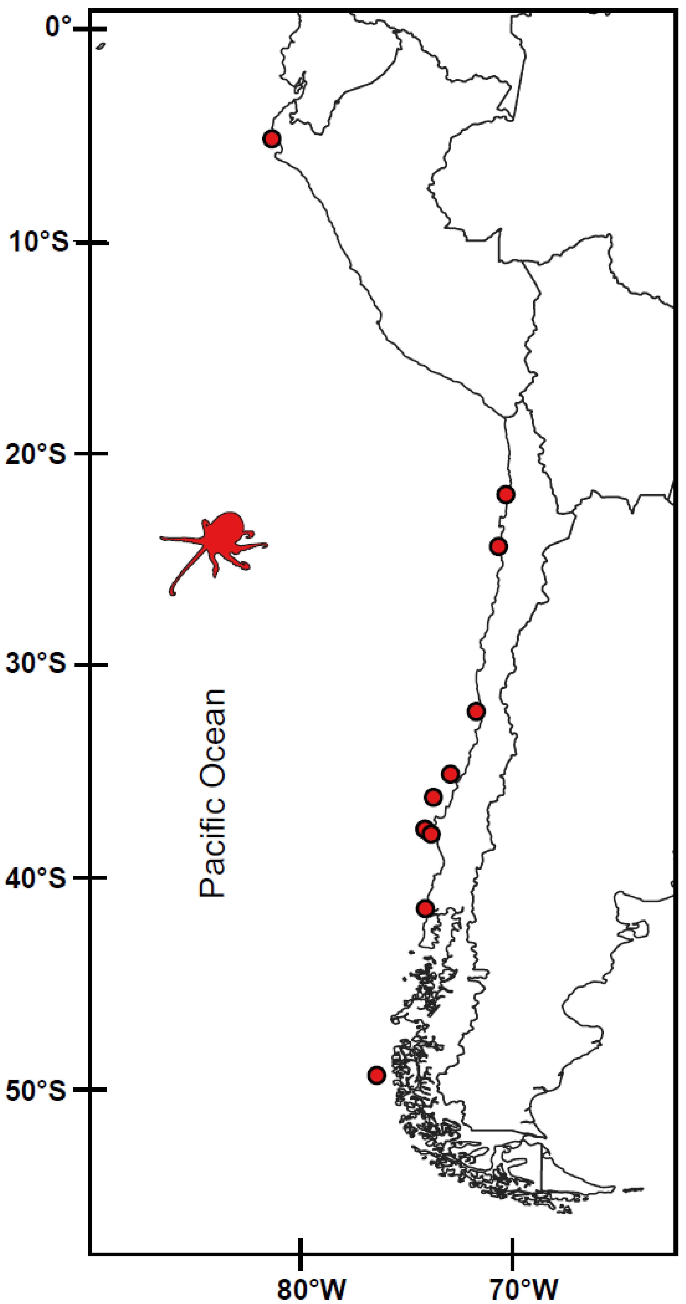 - Pardo-Gandarillas, M.C.; Carrasco, S.A.; Varela, A.I.; Ibáñez, C.M. Systematic and biogeography of two sympatric octopuses from the remote Juan Fernández Archipelago, South Pacific Ocean. Rev. Fish Biol. Fish. 2024, 34, 1685–1706. [Google Scholar] [CrossRef]
