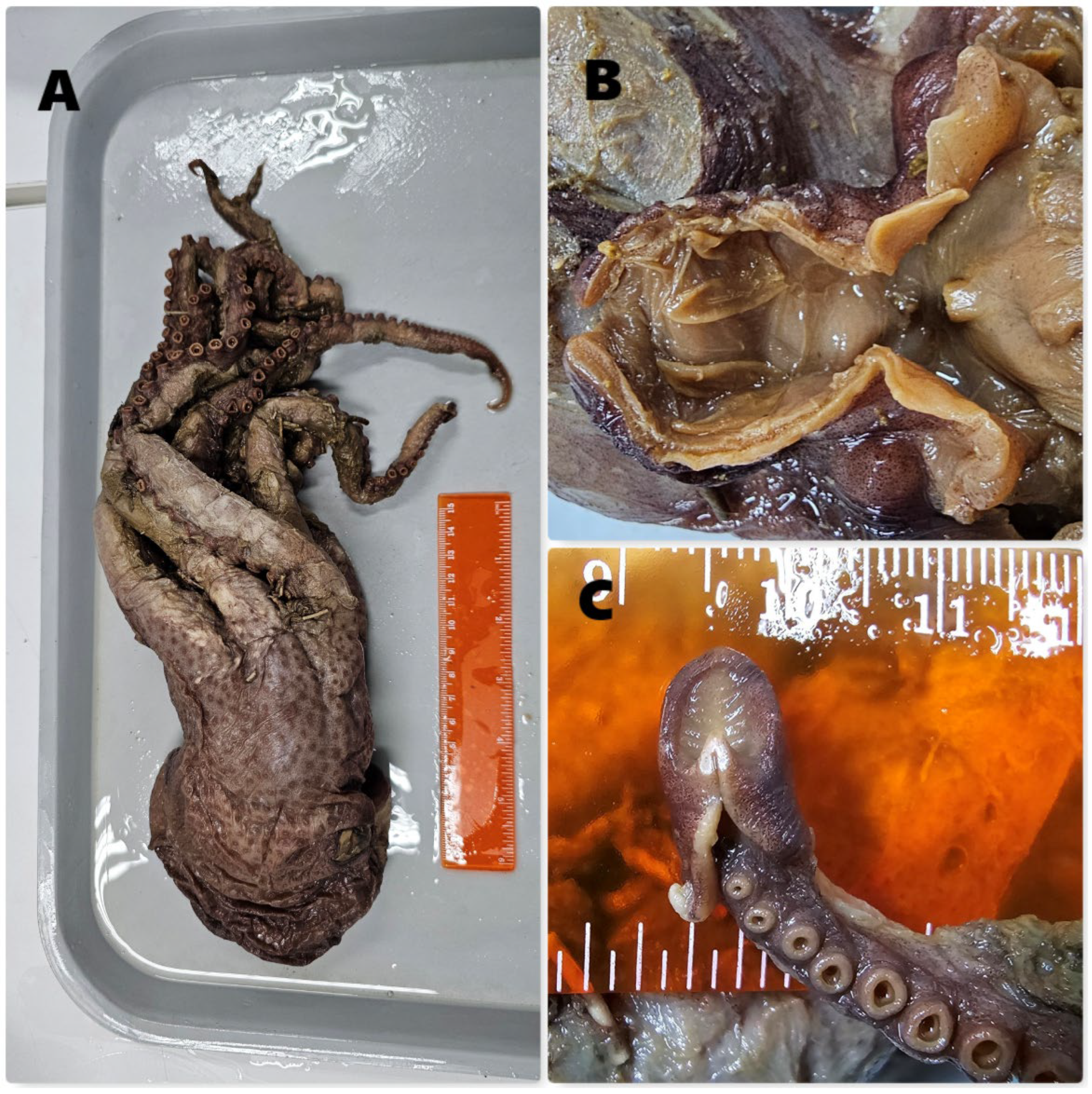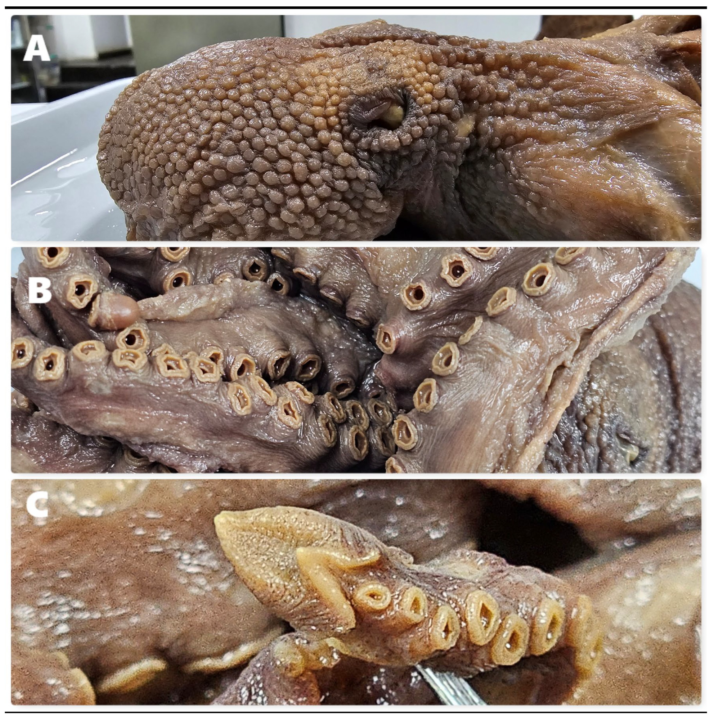 - O’Shea, S. The Marine Fauna of New Zealand: Octopoda (Mollusca: Cephalopoda). In NIWA Biodiversity Memoir; National Institute of Water and Atmospheric Research: Wellington, New Zealand, 1999. [Google Scholar]