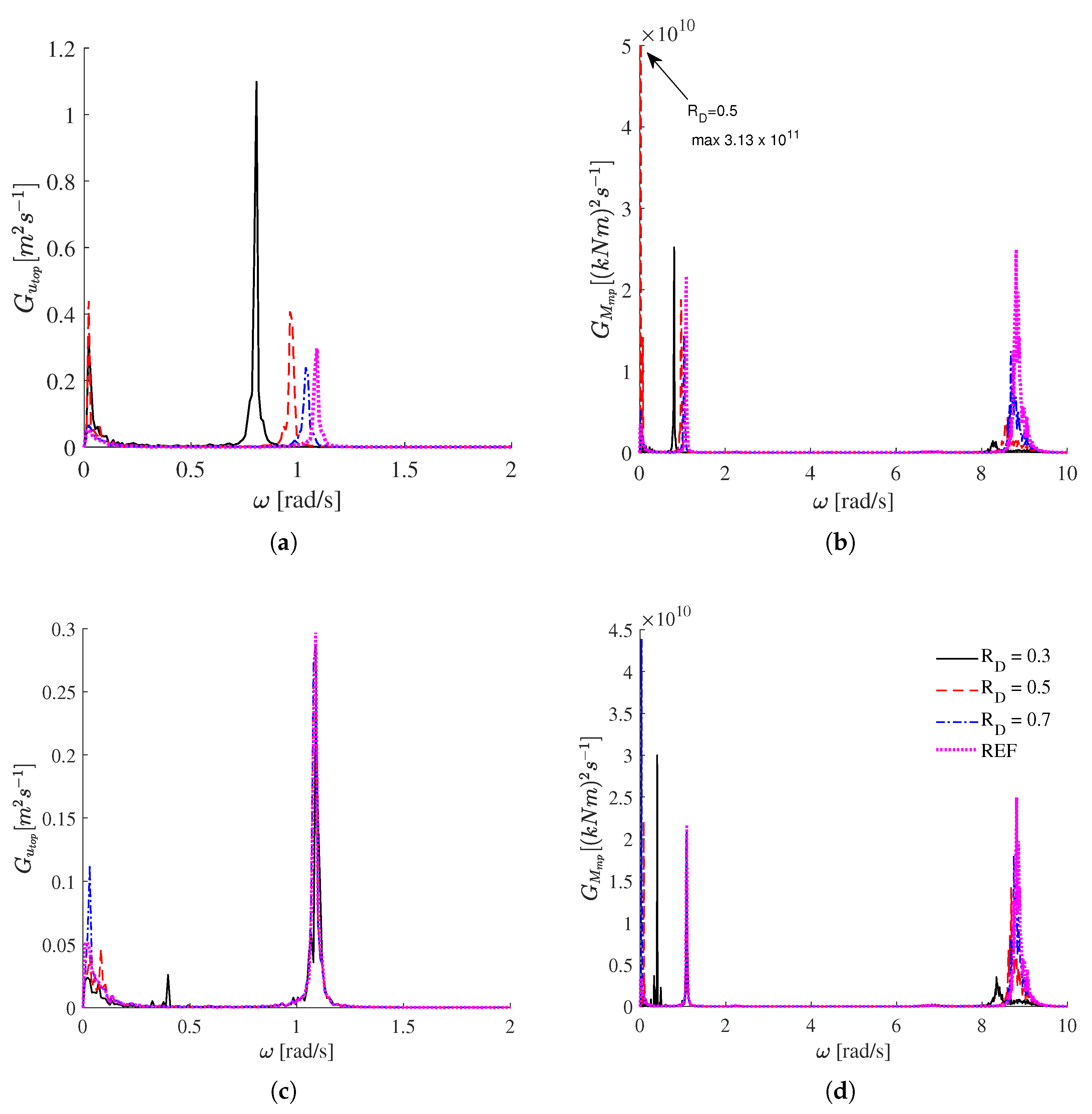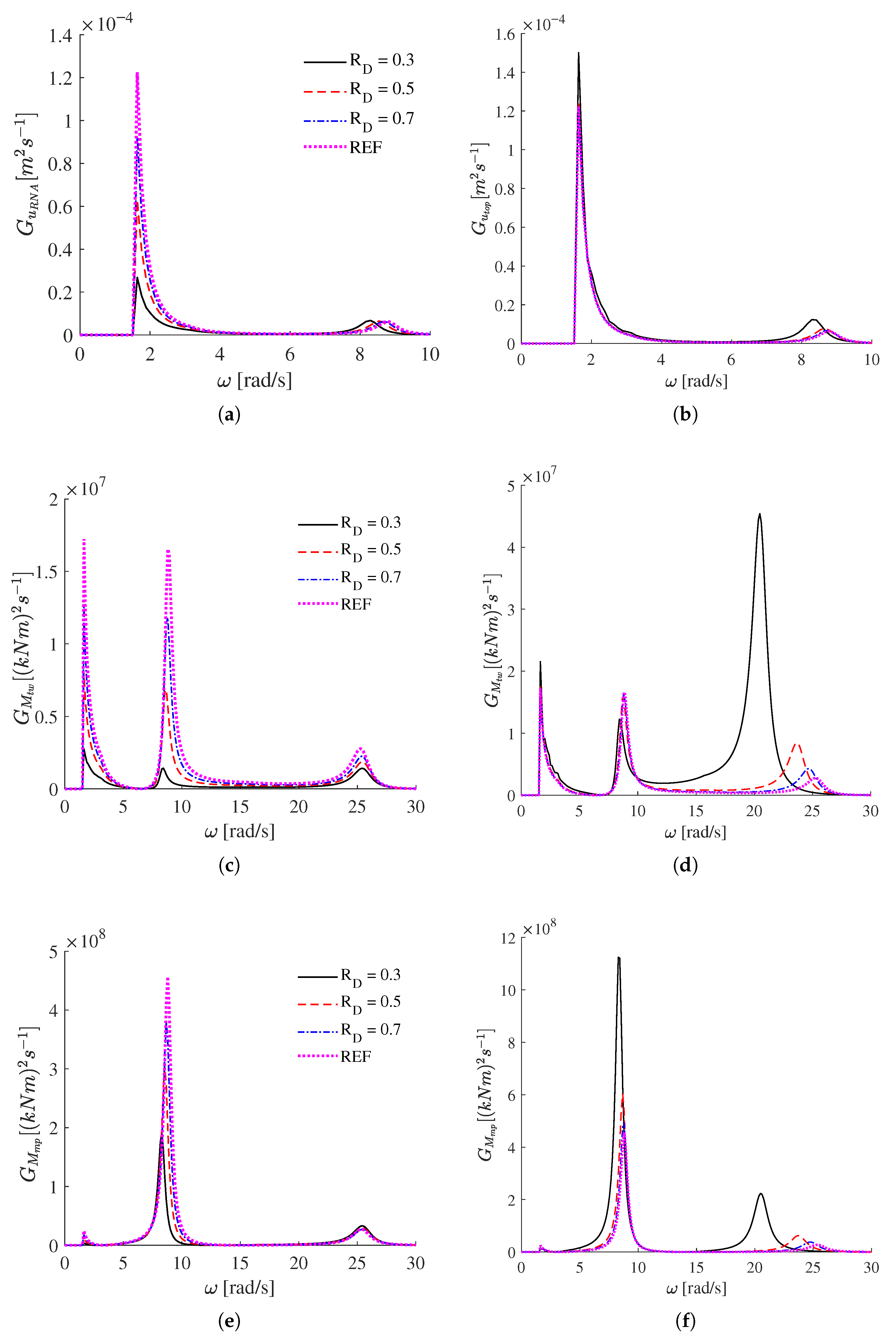 Figure 13c–f correspond to the PSD in terms of bending moment on the tower and on the monopile, for SET 1 and SET 2, respectively. In these cases, the higher modes are strongly contributing to the overall response. Generally, a reduction in the peaks and the overall energy expressed by the area underlining the curves can be observed, for decreasing values of the reduction factor, i.e., from