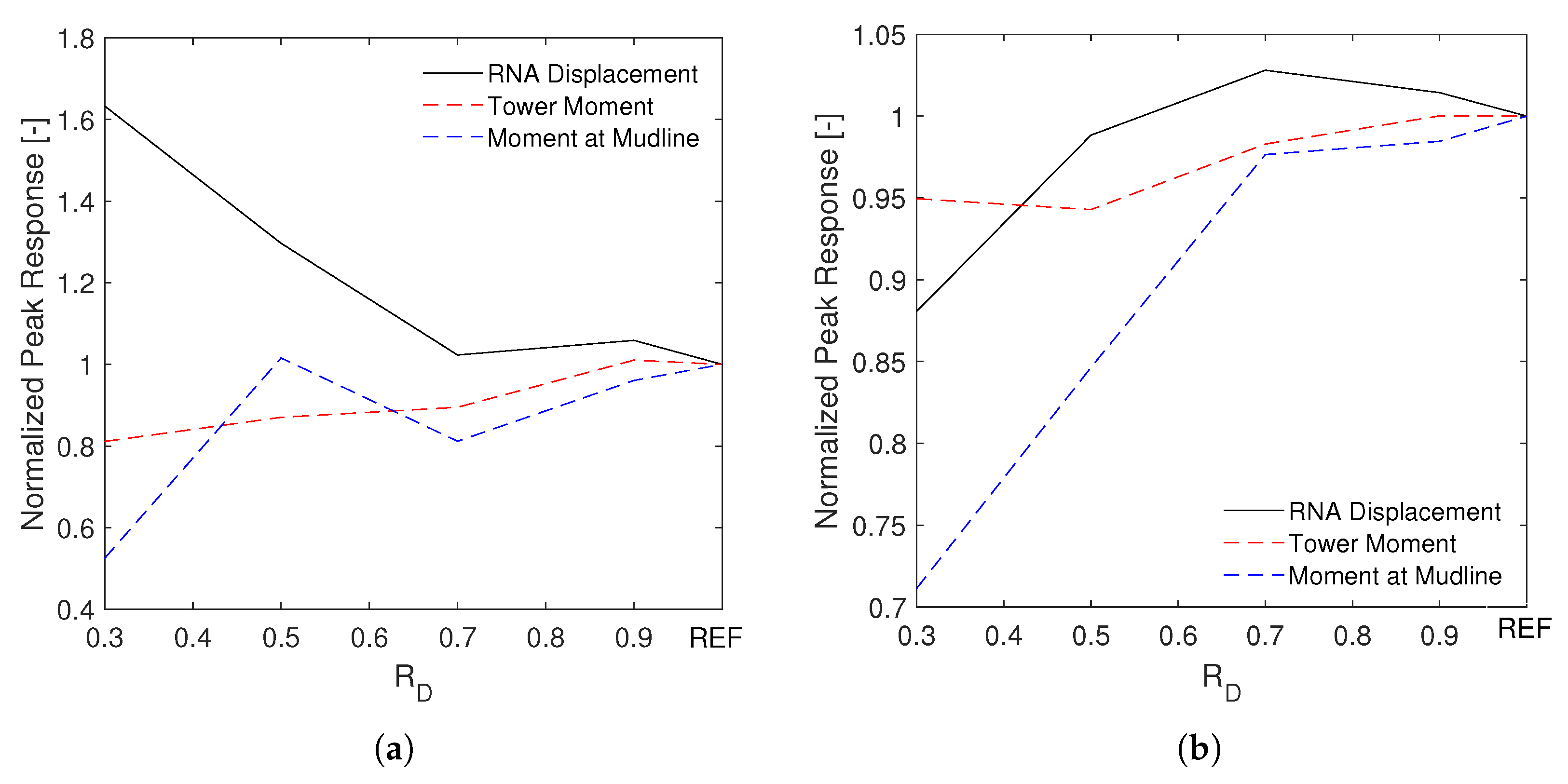 Figure 11a shows the curves in terms of mean peak RNA displacement and bending moment on the tower and on the monopile, normalised by the mean peak response of the reference wind turbine. The mean of the peak bending moment decreases with the increase of the reduction of the section of HGTP, i.e., from