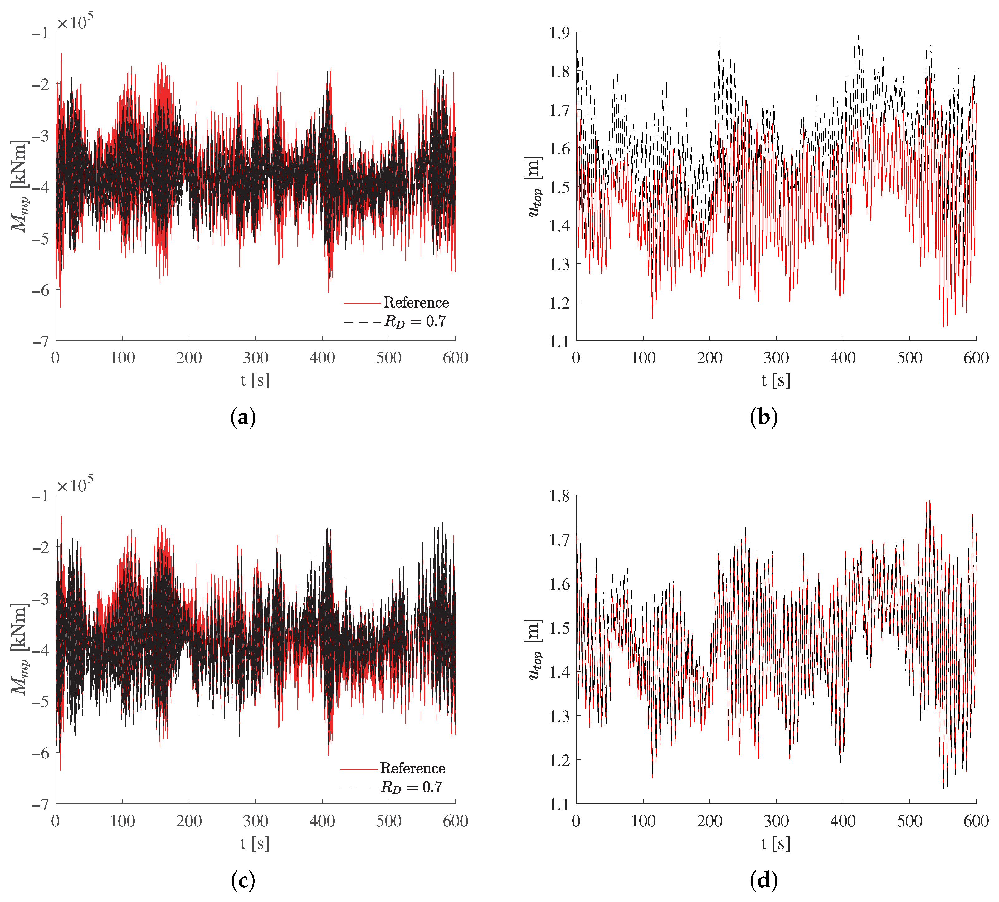 are depicted and compared to the reference response. The maximum values of the PSD functions of the RNA displacement in