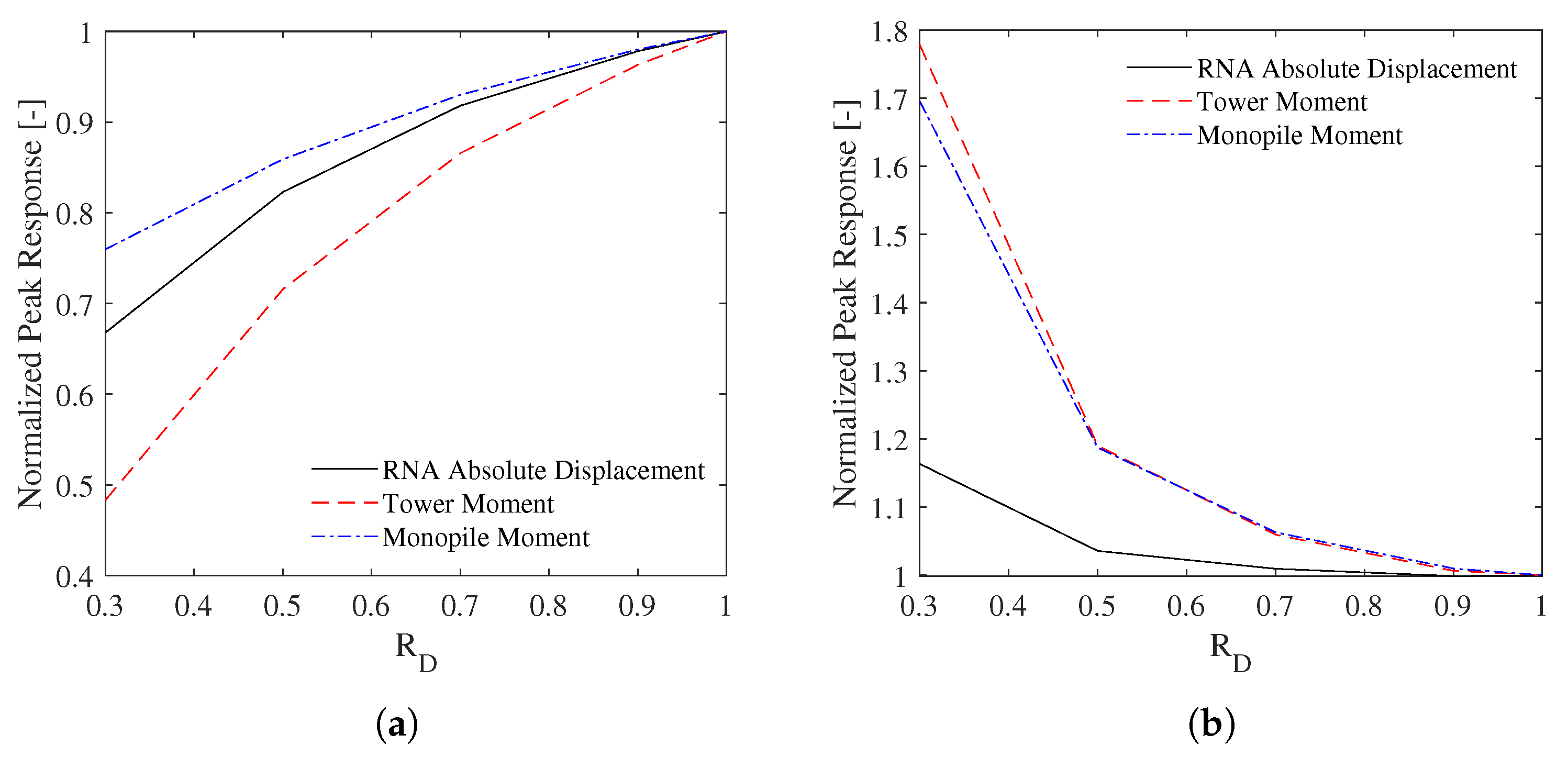 Positive mitigation effects are also observed under wind loading, although the optimal calibration requires balancing two competing objectives: shifting the fundamental period (favoured by lower ) and limiting the maximum RNA displacement (favoured by higher ). Consequently, the final design becomes site-specific, depending on the relative importance of seismic loading compared with wind–wave actions. In regions with negligible seismicity, the HGTP provides limited advantages in reducing the bending moment. Conversely, the results suggest that the two different hazards, i.e., wind and seismic, could be addressed simultaneously by combining two vibration-control technologies, such as tuned mass dampers for wind loading and the HGTP for seismic loading.