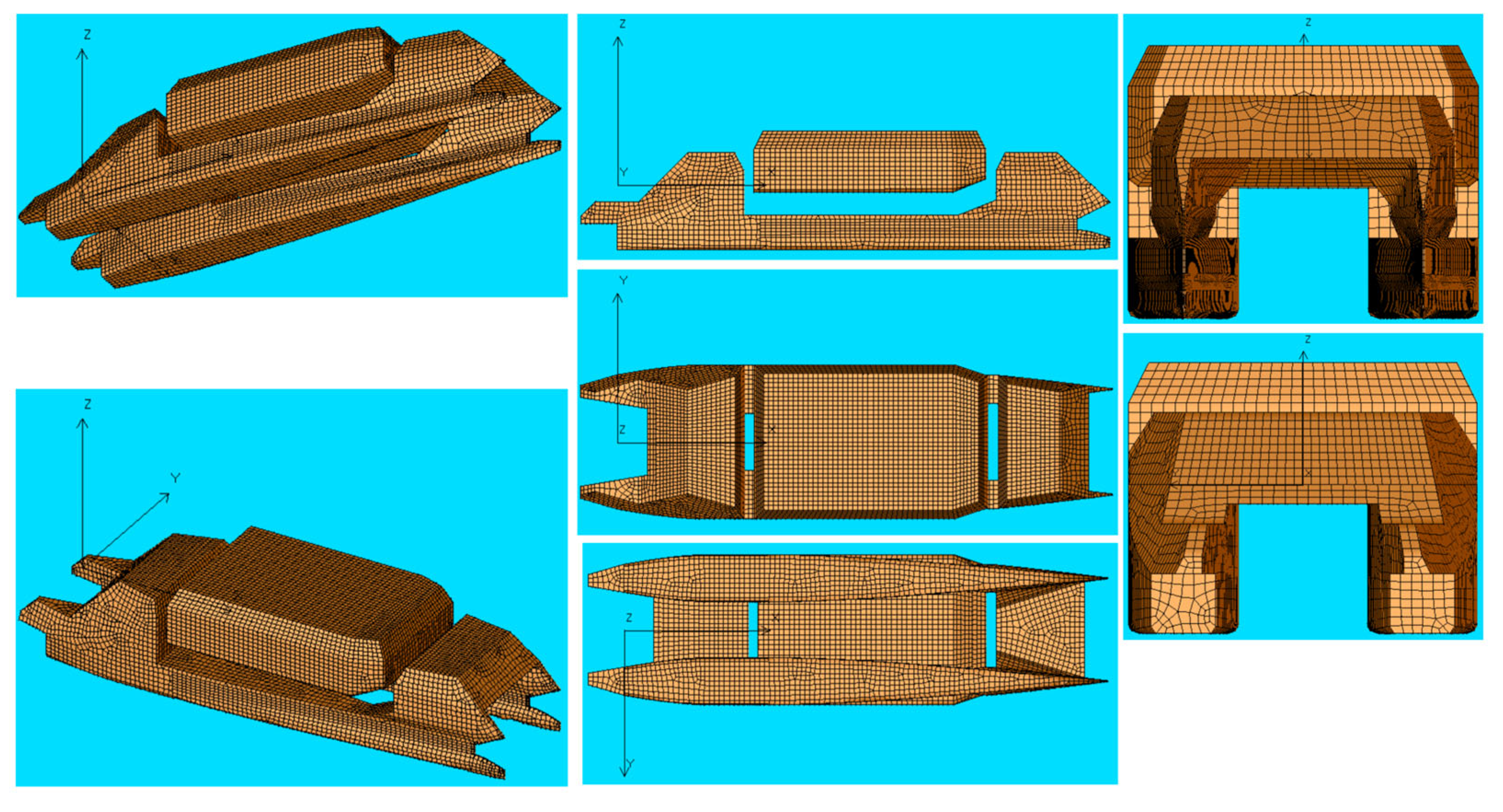 Figure 19 presents views of the AQWA model with the mesh. The direction of each view is clear according to the global system of coordinates of AQWA, with x on the still water plane along centerline, y positive to port, and z vertical positive upward, with zero at the still water plane.