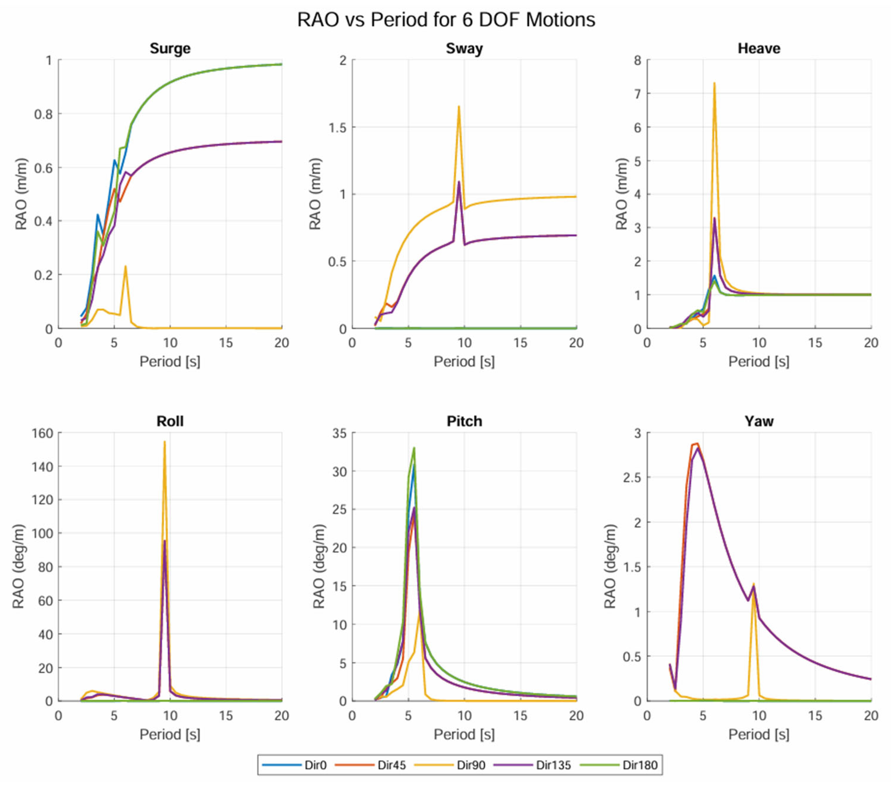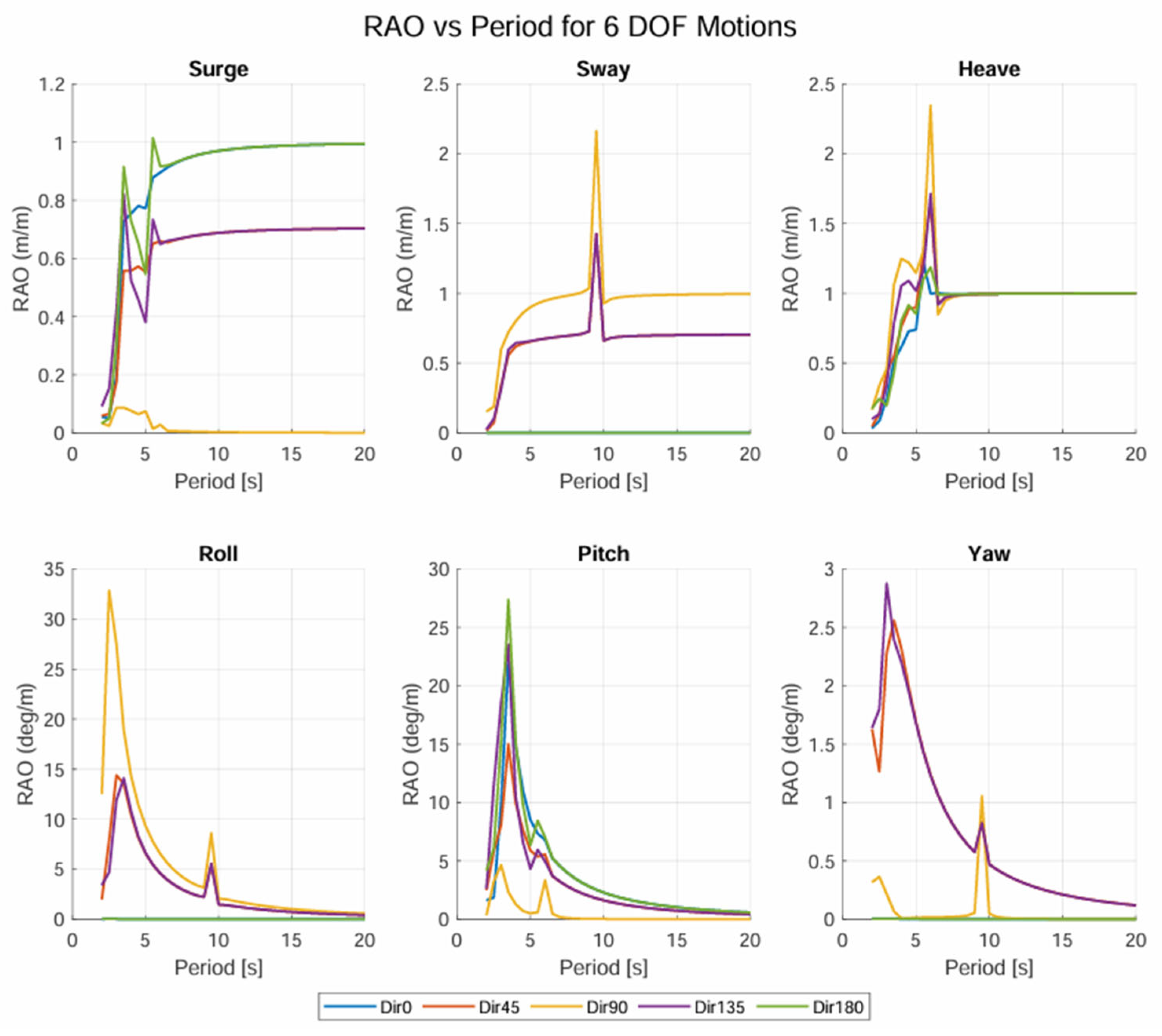 Figure 21 present the RAOs of the transporter and the lander, respectively. Each of the figures presents RAOs in six DOF for the range of input wave periods and the five input wave directions under loaded conditions. The input wave directions for the RAOs are 0° (head seas), 45°, 90° (beam seas), 135° and 180° (following seas). The wave periods are equally spaced at intervals of 0.5 s, from 20 s down to 2 s, for a total of 37 periods. Since the DOF of vertical motion (heave, roll and pitch) has hydrostatic restoring forces (represented as spring coefficients), these DOFs presents sharp resonance periods.