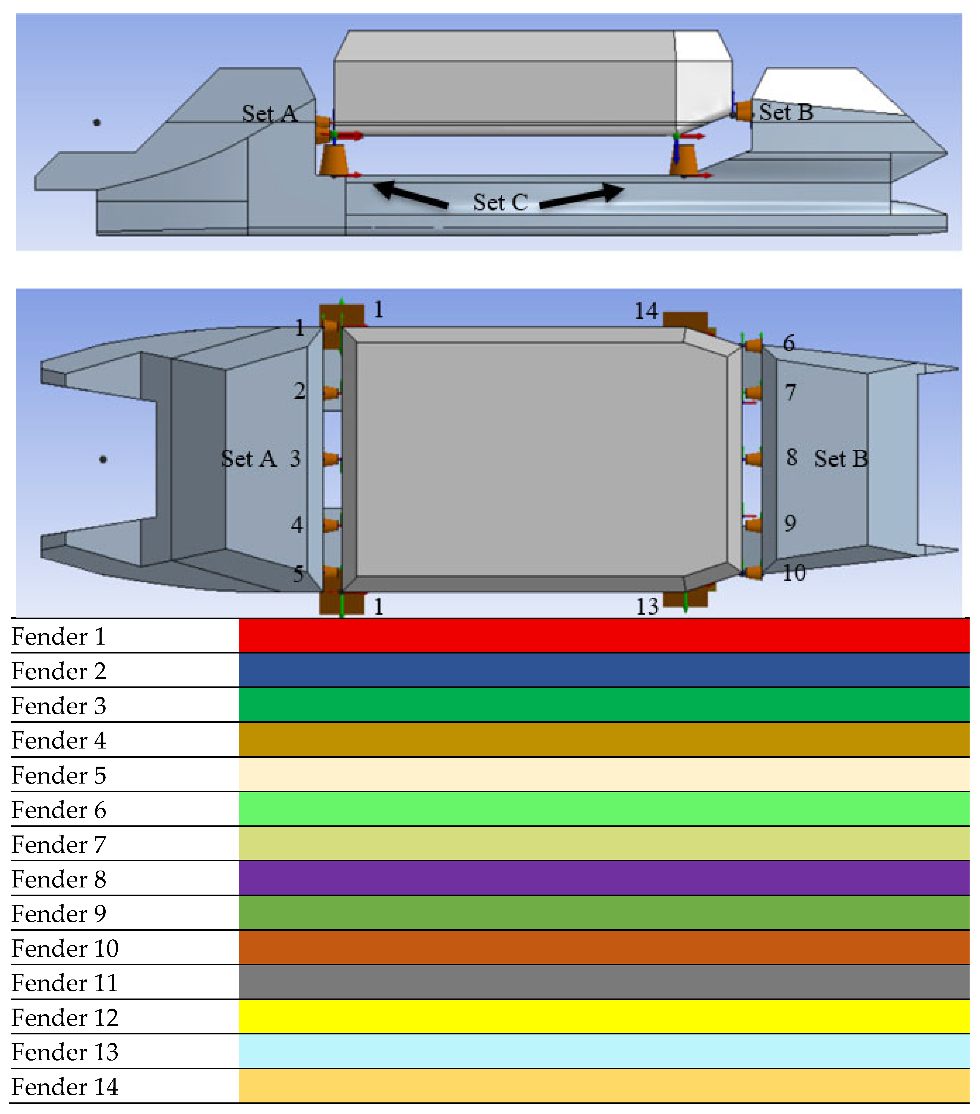 X-axis). Since fenders 11–14 are inflated to 800 mm and fenders 1–10 are inflated to 300 mm for the docking procedure, the clearance reduces to 240 mm and 200 mm, respectively. About 60% fender deflection is considered reasonable by ISO [
