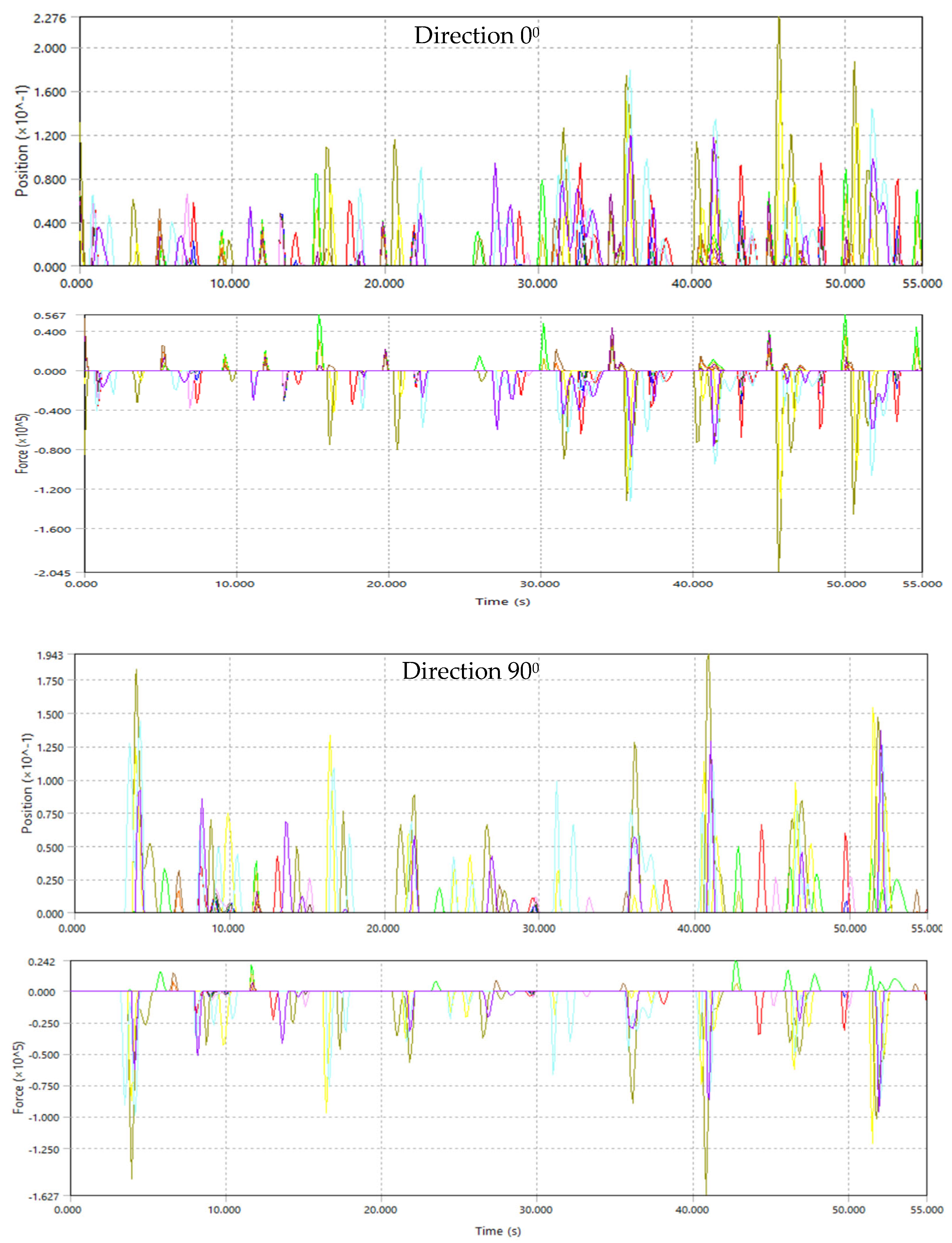 Section 3.2). Two wave directions (0° and 90°) and three wave heights (0.5 m, 1.0 m, 1.5 m) are analyzed to assess the applicability of the launching or docking operations under varying sea conditions. Practically, in terms of seamanship, it is expected that, in oblique seas, it will be more difficult to perform the operation. Therefore, we checked heading seas and beam seas. The wave heights are increased at reasonable steps to find the operability limit sea state. The resulting time series of position and compression-force present the system’s capacity to maintain structural integrity and minimize excessive loading during docking, launching or operations.