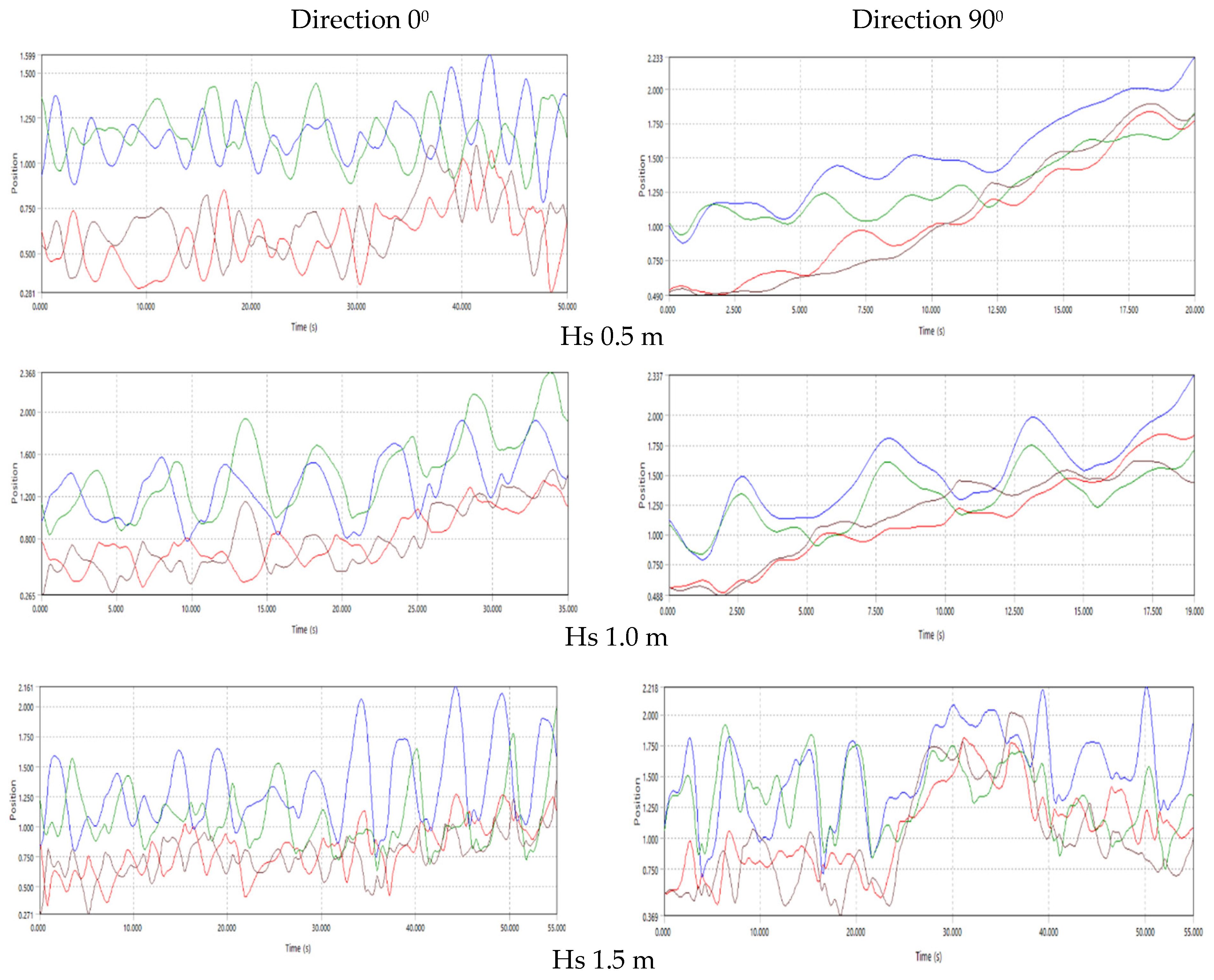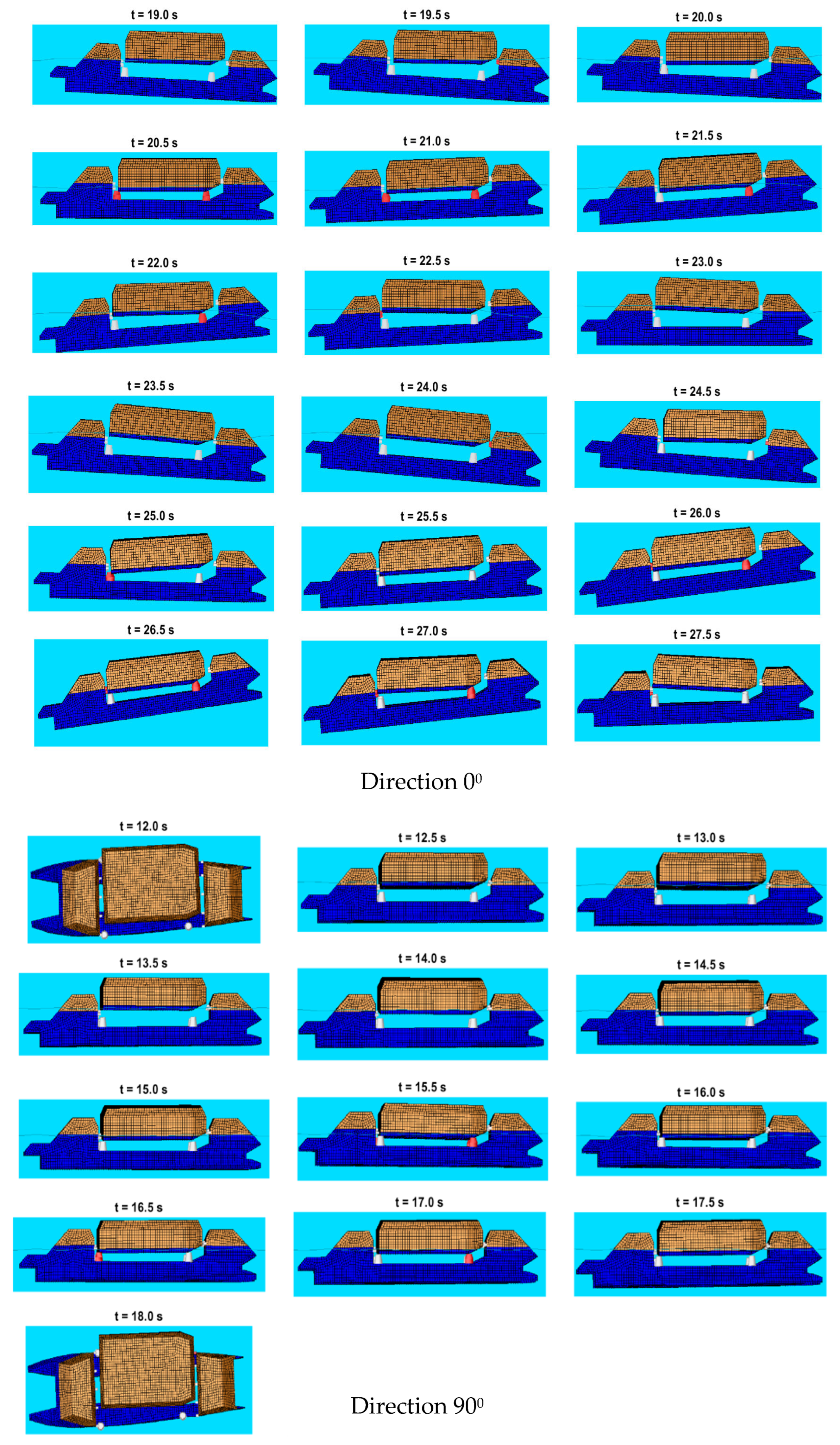 To demonstrate the applicability of launching or docking in open sea, we present results for wave directions of 0° and 90° at significant wave heights of 0.5, 1.0 and 1.5 m.