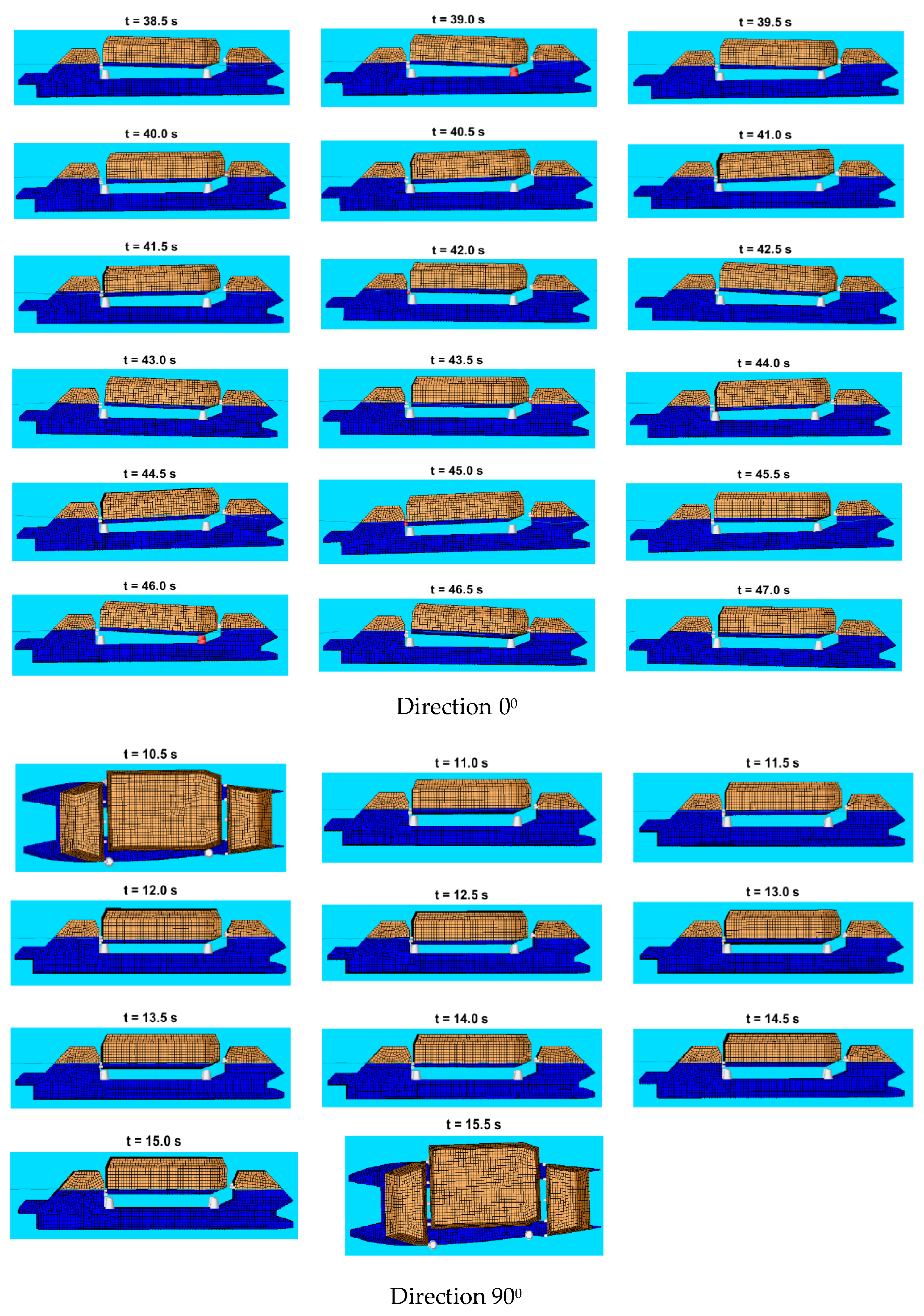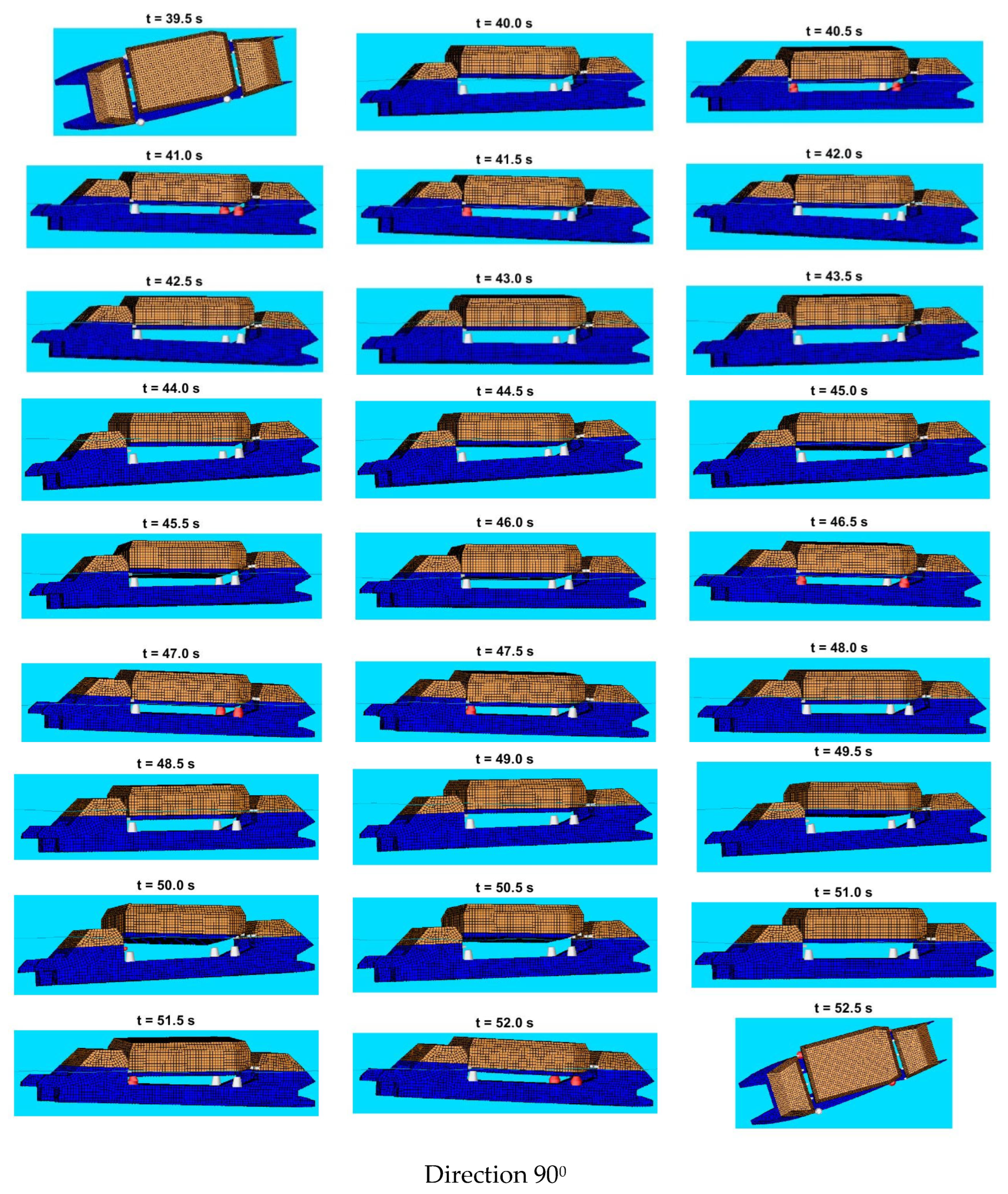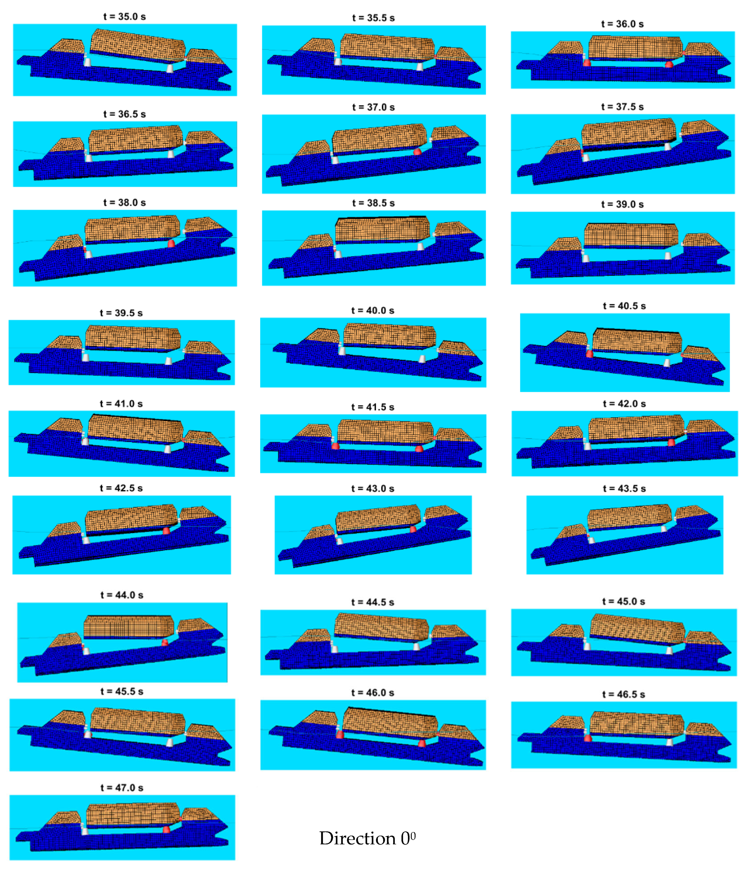 To illustrate the dynamic interaction between the transporter and the lander, status frames are extracted every 0.5 s at representative time intervals for each situation of the simulation. This interval captures key phases of the docking process. The plots also present the wave profile (waterline) and highlight the status of engagement for each fender, where red indicates active contact and white denotes no contact. The time-sequenced frames offer qualitative insights that complement the quantitative results.