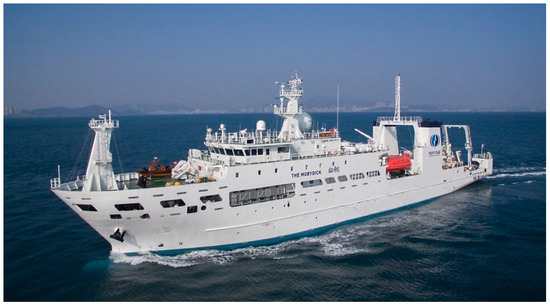 The experiments were conducted on the training vessel T/S Baek-Kyung, which served as the test platform for full-scale sea-trial measurements. The vessel particulars are summarized in Table 1, and an overall view is provided in Figure 1. These characteristics ensure that the recorded performance and emissions reflect representative full-scale operation rather than laboratory or simplified test conditions.