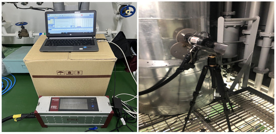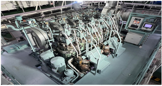 The experimental study was conducted on the main propulsion engine of the training vessel T/S Baek-Kyung, operated by Pukyong National University. An overview of the main engine installation is shown in Figure 2.