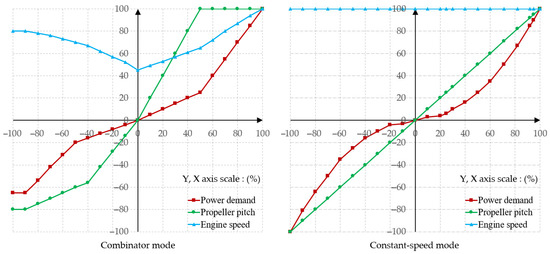 During routine navigation, propulsion commands are issued from the bridge, and the CPP plant is typically operated in combinator control. In this strategy, propeller pitch and engine speed are coordinated along a predefined schedule (Figure 3) to satisfy thrust demand over the operating range. At low demanded power, pitch is increased quickly to secure thrust while the engine remains at relatively low rpm, which is advantageous for low-speed propulsion efficiency. As the demanded power rises, pitch change becomes less dominant and the required output is achieved mainly by increasing rotational speed, supporting stable power delivery toward higher loads.