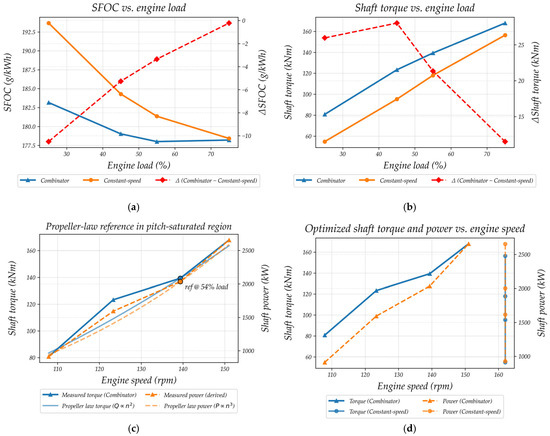 Propulsion and fuel performance characteristics under different CPP operating modes. Comparison between constant-speed and combinator CPP operating modes: (a) specific fuel oil consumption (SFOC) and corresponding ΔSFOC (combinator − constant-speed) as a function of engine load; (b) shaft torque and corresponding ΔShaft torque (combinator − constant-speed) as a function of engine load; (c) propeller-law reference comparison in the pitch-saturated region (pitch = 100%), showing measured shaft torque and derived shaft power in the combinator mode together with theoretical propeller-law references and , normalized at 54% load; (d) shaft torque and power versus engine speed for constant-speed and combinator CPP modes, illustrating distinct operating trajectories and engine–propeller matching characteristics. Note: The combinator mid-load points stabilized at 47% and 54% (Table 6) and are discussed/plotted against the nominal 45% and 55% targets for readability.