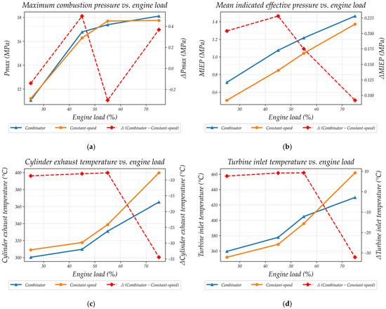 In-cylinder combustion and thermal characteristics. Variations in in-cylinder combustion and thermal parameters with engine load under constant-speed and combinator CPP operating modes: (a) maximum combustion pressure (Pmax) and corresponding ΔPmax, (b) mean indicated effective pressure (MIEP) and corresponding ΔMIEP, (c) cylinder exhaust gas temperature and corresponding ΔCylinder exhaust gas temperature, (d) turbine inlet temperature and corresponding ΔTurbine inlet temperature.