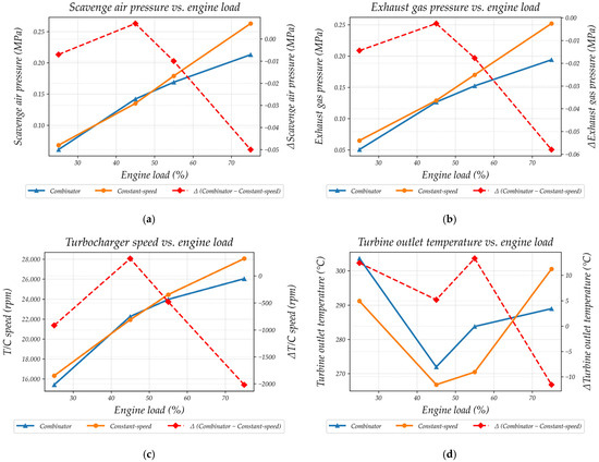 Figure 8 summarizes the boosting and exhaust-system response under the two CPP modes. The scavenge air pressure showed relatively small differences at low and medium loads but diverged at high load. The scavenge air pressure decreased from 0.068 to 0.061 MPa at 25% load (Δ = −0.007 MPa, −10.3%) and from 0.179 to 0.169 MPa at 55% load (Δ = −0.010 MPa, −5.6%), while it increased slightly at 45% load (from 0.135 to 0.142 MPa, Δ = +0.007 MPa, +5.2%). At 75% load, the combinator mode produced a much lower scavenge air pressure of 0.213 MPa compared to 0.263 MPa in constant-speed operation (Δ = −0.050 MPa, −19.0%).