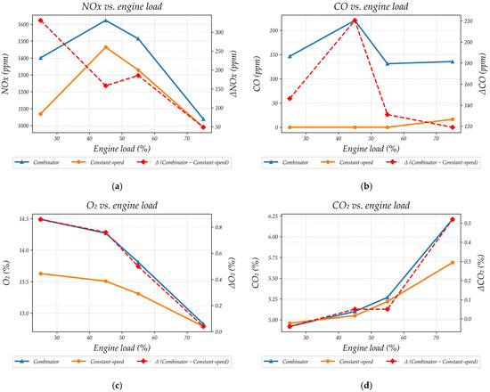 Exhaust emission characteristics and performance–emission trade-off. Load-dependent variations in exhaust gas emissions under constant-speed and combinator CPP operating modes: (a) nitrogen oxides (NOx) and corresponding ΔNOx, (b) carbon monoxide (CO) and corresponding ΔCO, (c) oxygen (O2) and corresponding ΔO2, (d) carbon dioxide (CO2) and corresponding ΔCO2.