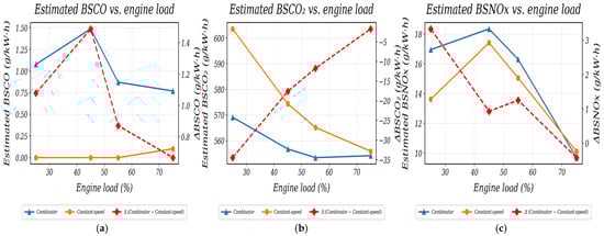 For CO2 (Figure 10c and Table 8), the estimated BSCO2 is consistently lower in the combinator mode at partial load, with the largest reduction observed at 25% load (Δ ≈ −34.5 g/kWh, −5.7%). The magnitude of this reduction decreases with increasing load and becomes negligible at 75% load. This behavior is consistent with the fuel-efficiency improvement identified under combinator operation at partial loads, as reduced fuel consumption per unit work directly translates into lower CO2 emissions per kWh.