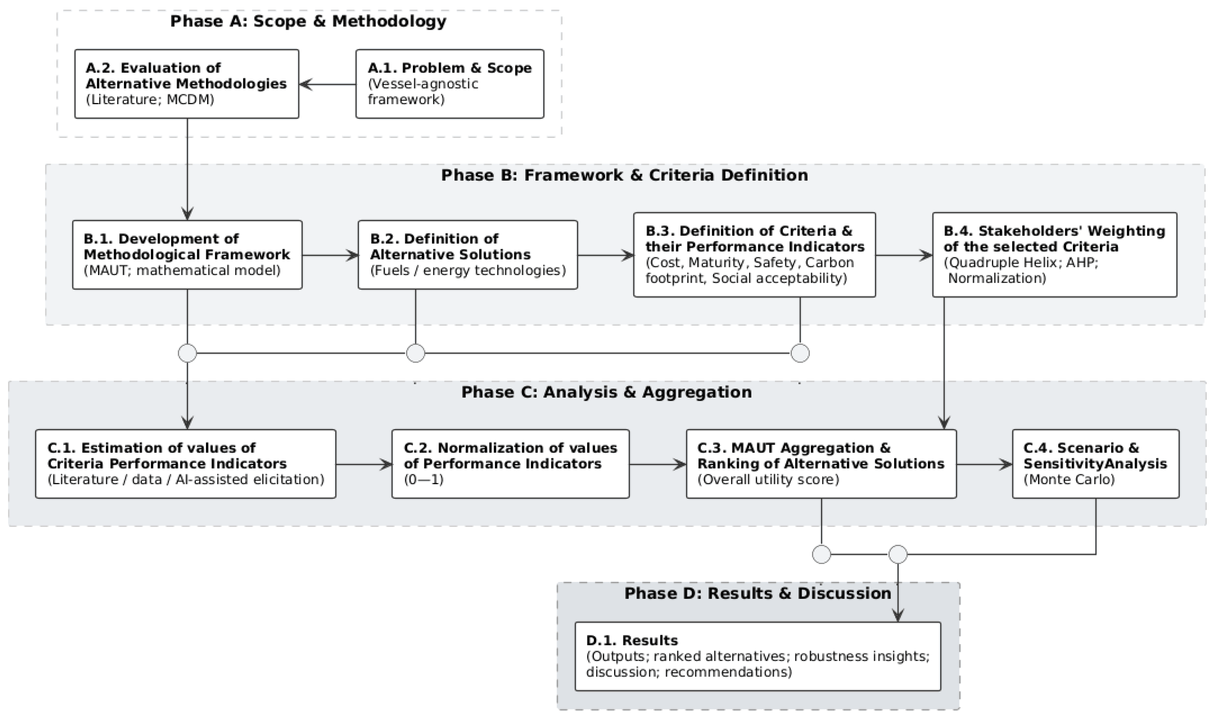 - Adaptability to AI-enhanced modeling: The structure of MAUT readily accommodates the integration of AI-generated estimates for performance indicators, especially in cases where empirical data are sparse or uncertain.