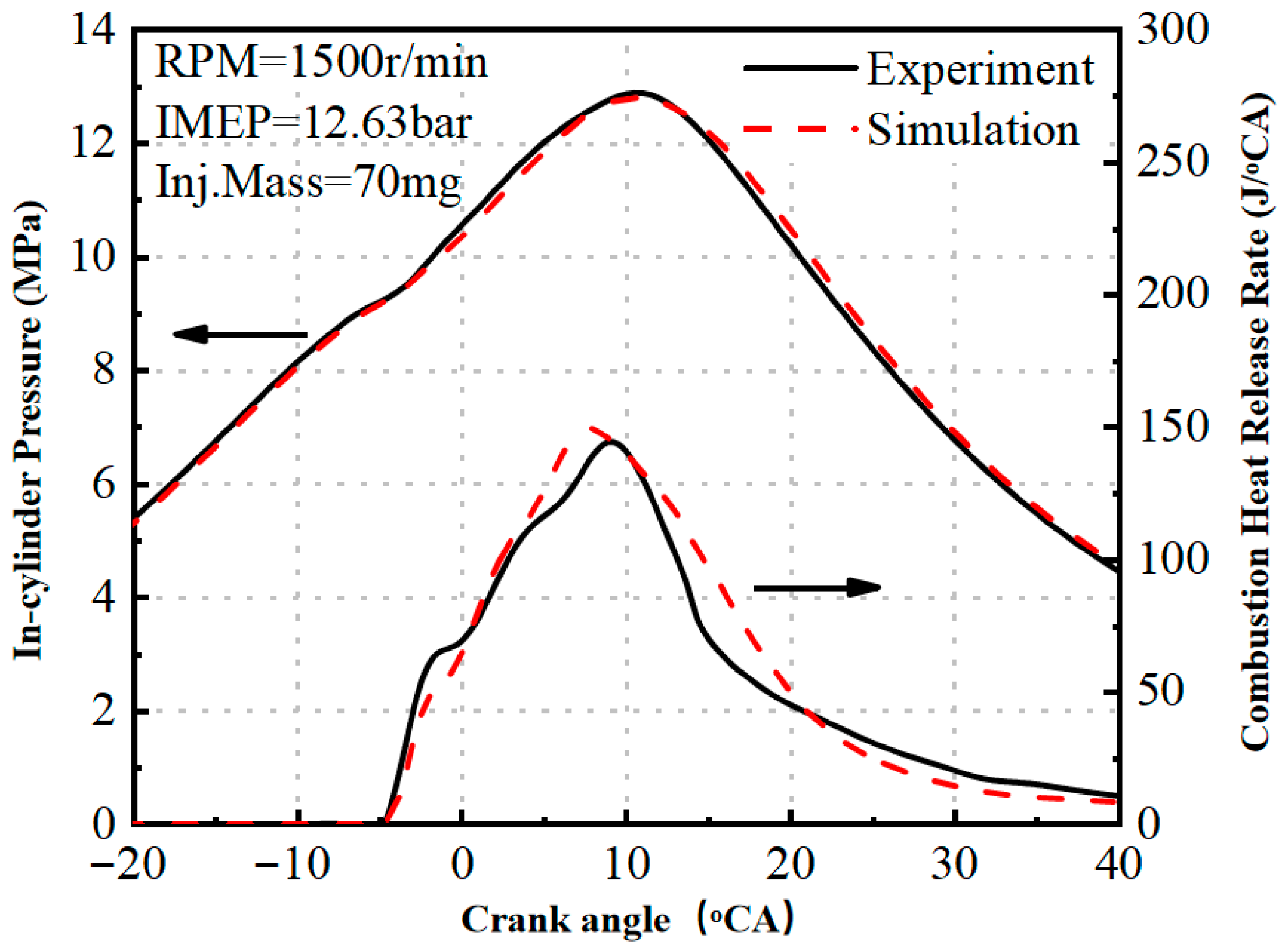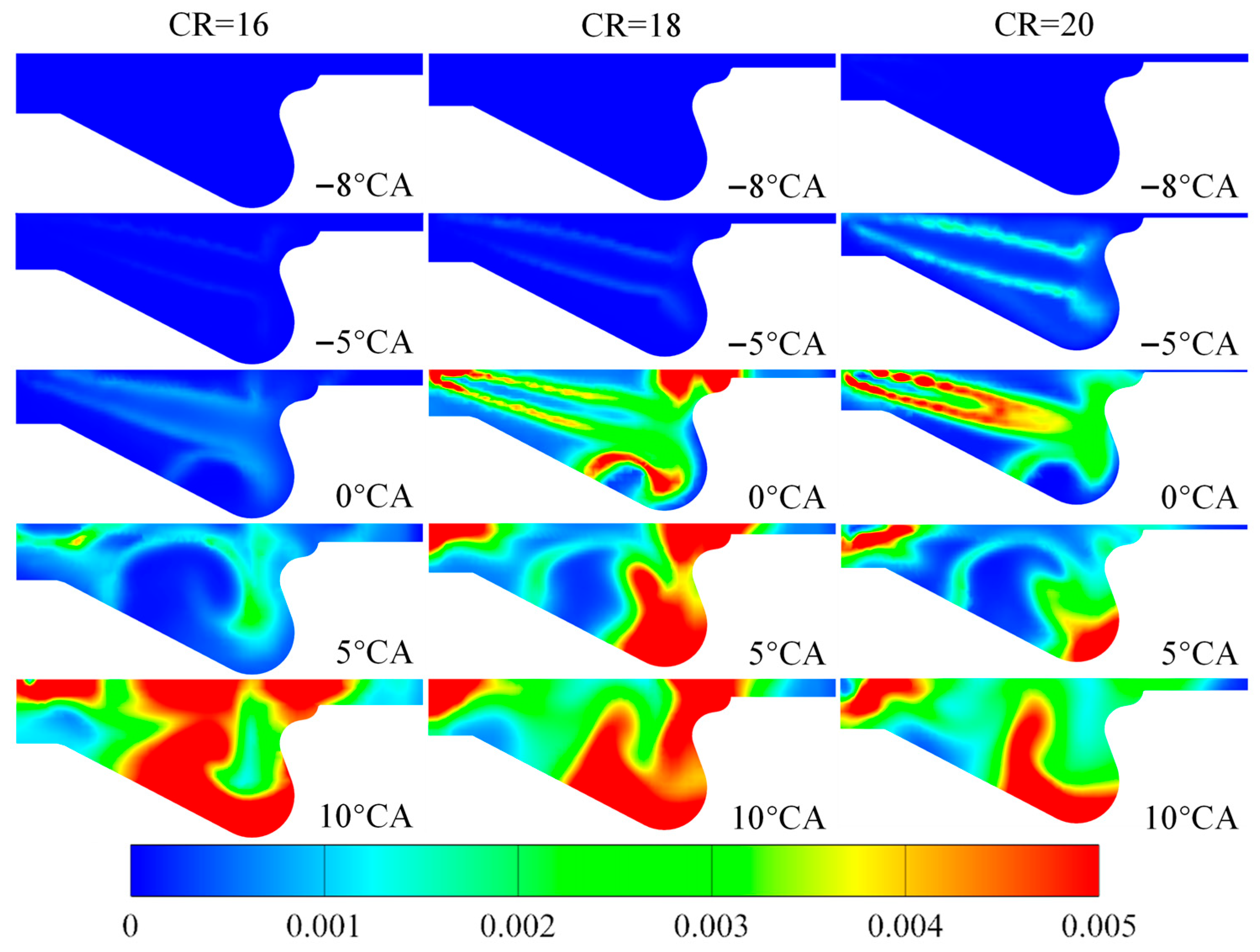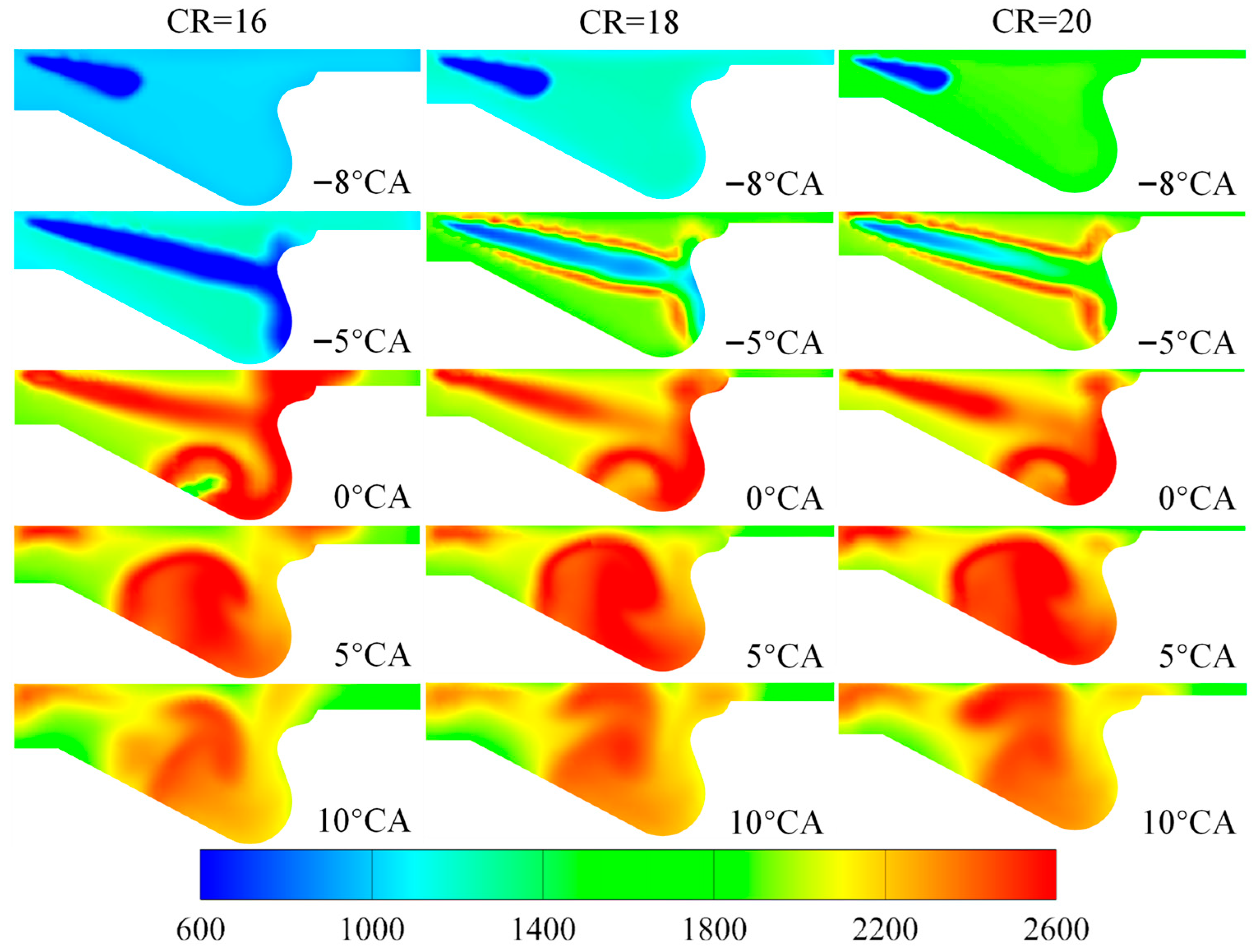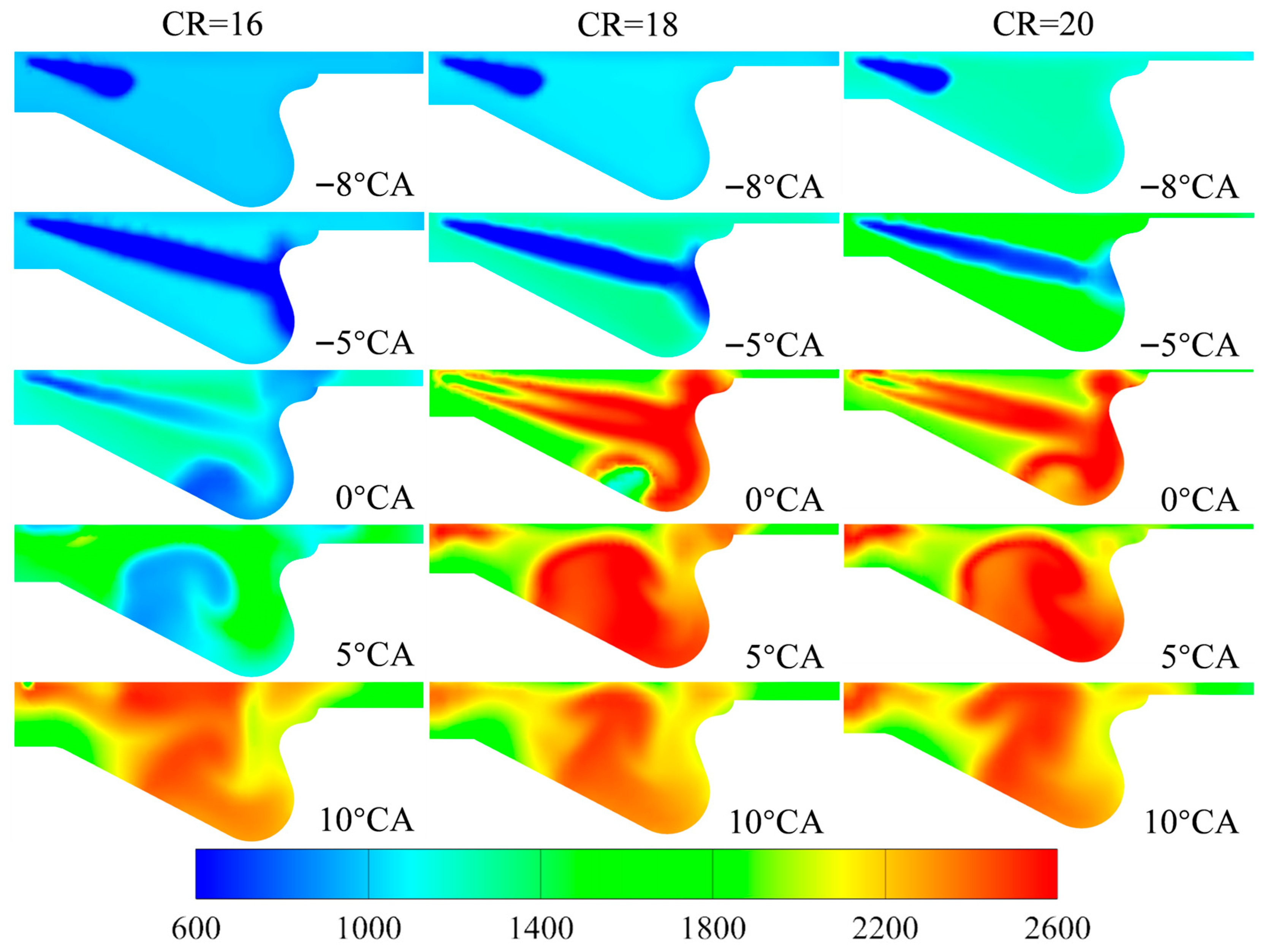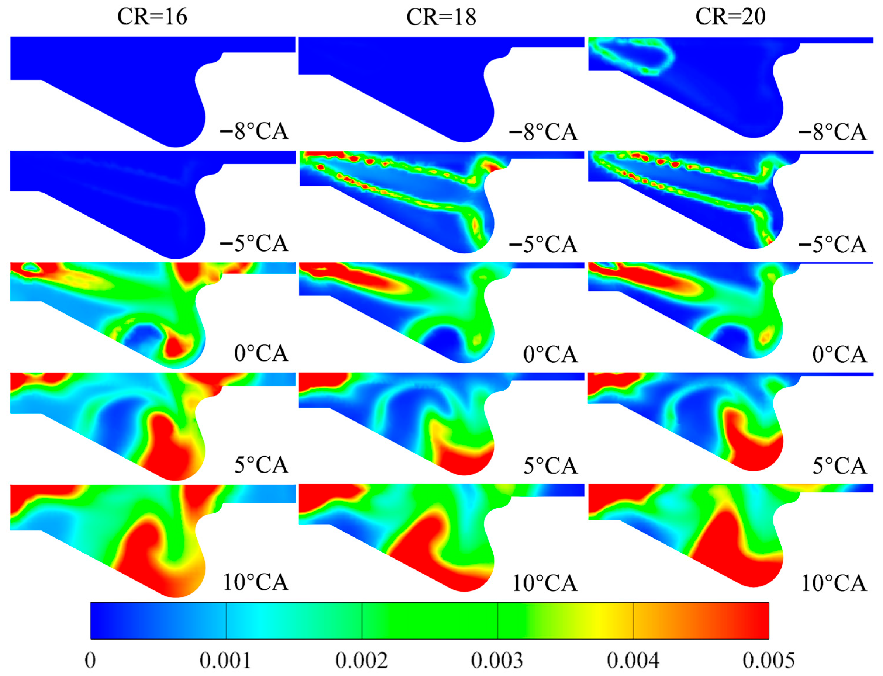 - Elevating the compression ratio has a profound effect on ammonia ignition and combustion performance, with notable changes in ammonia’s combustion characteristics and heat release patterns observed across different CRs. Increasing the compression ratio effectively raises the proportion of ammonia fuel; at a compression ratio of 20, a 70% ammonia fuel ratio can achieve stable ignition and efficient combustion.