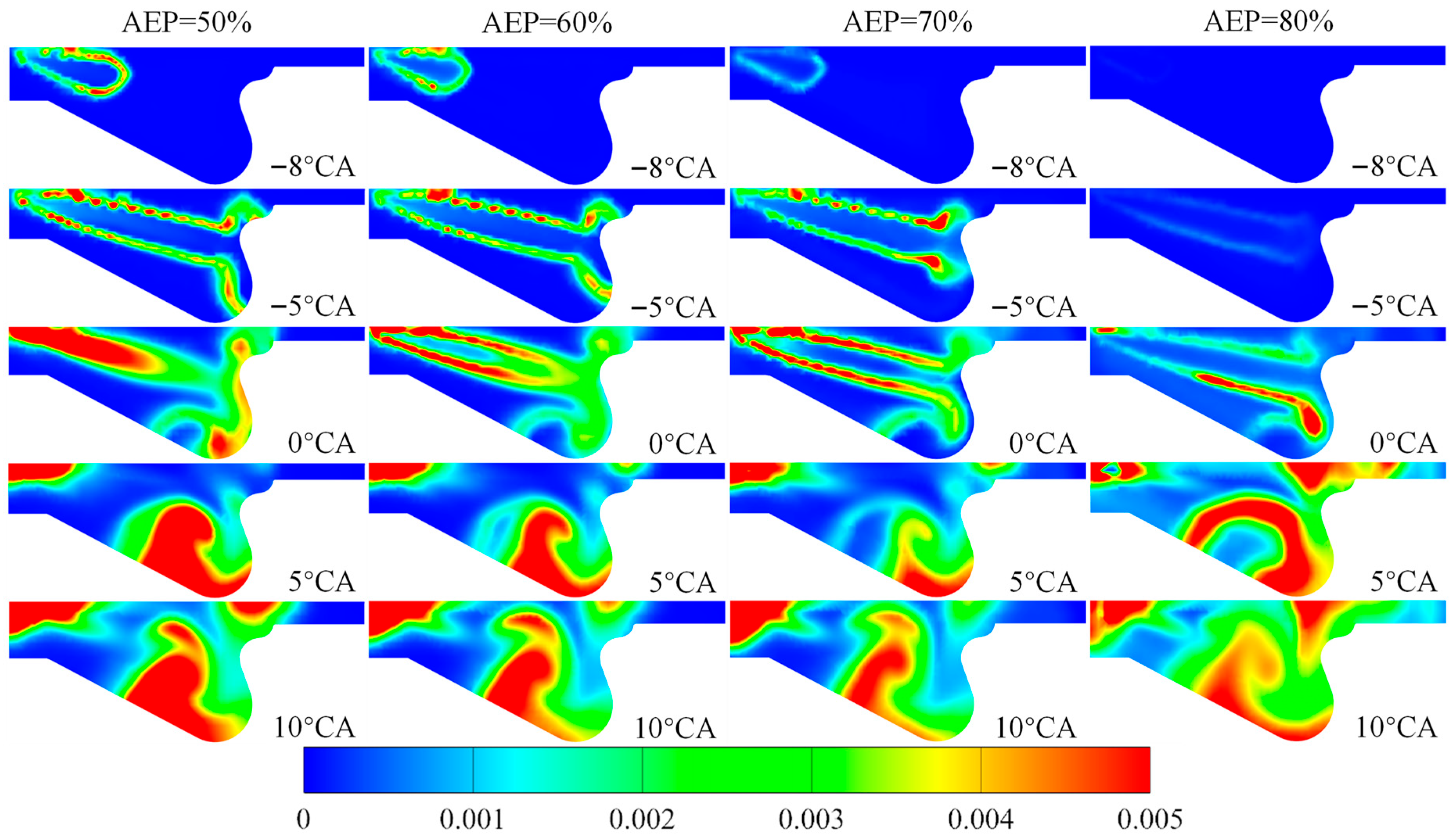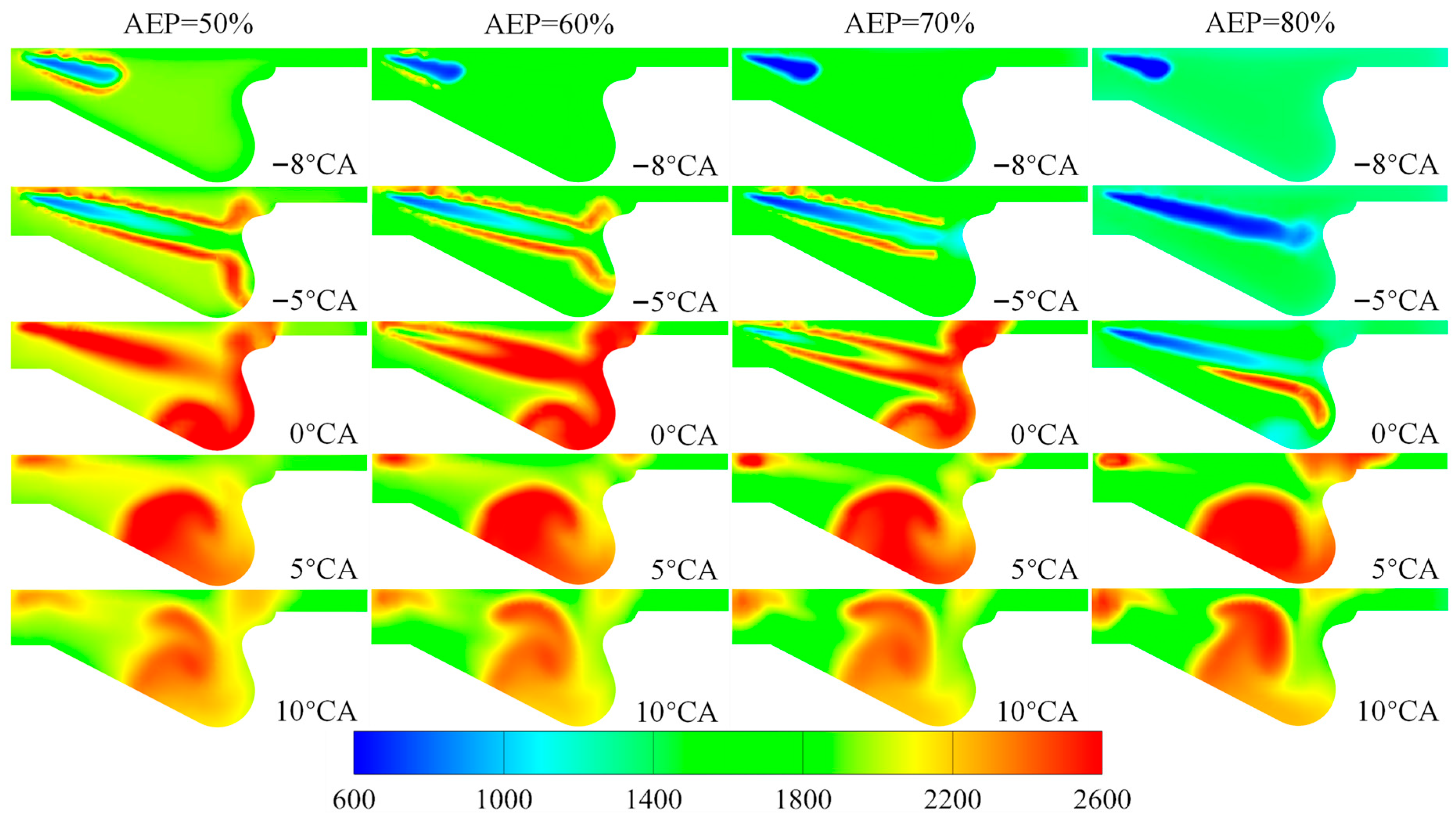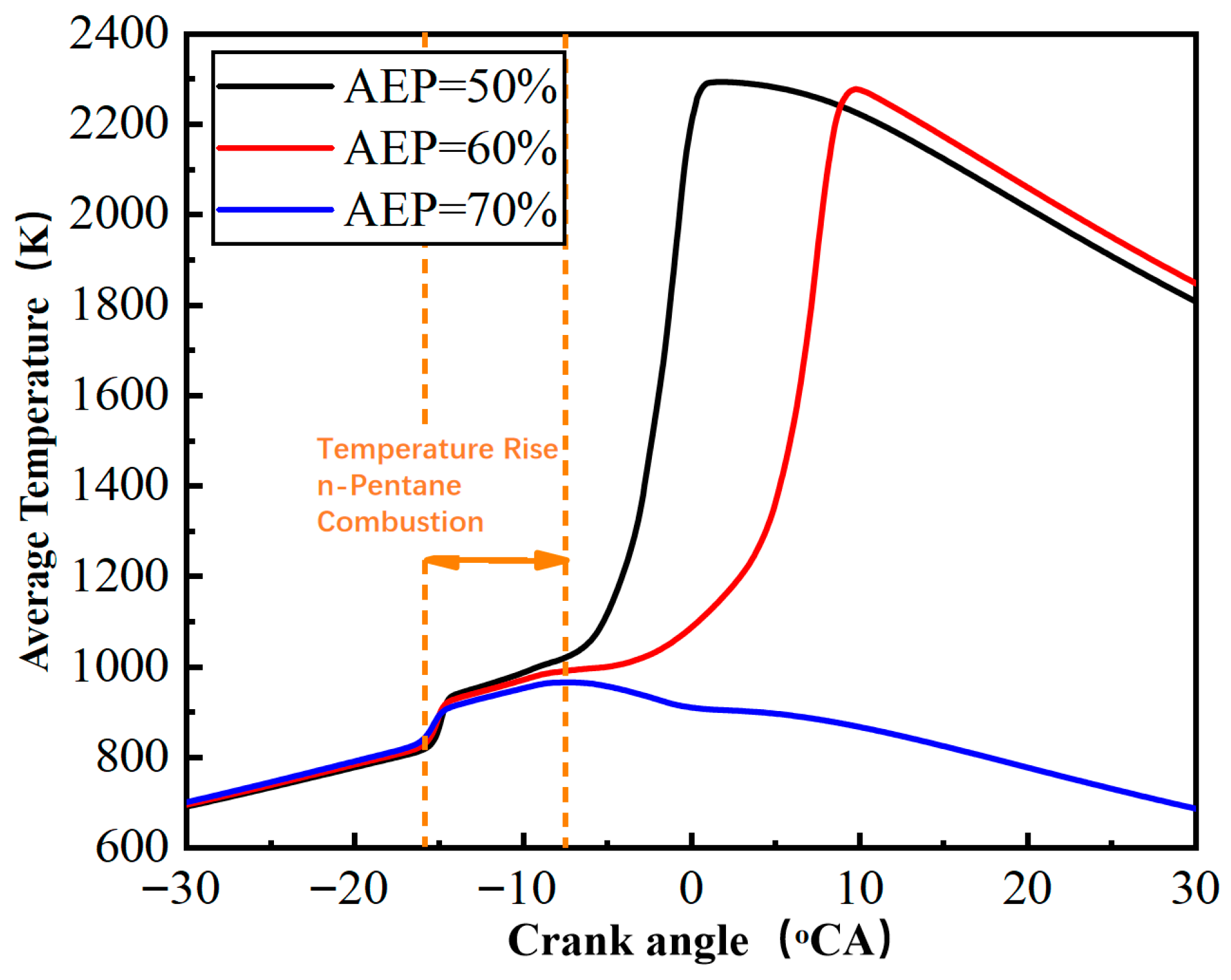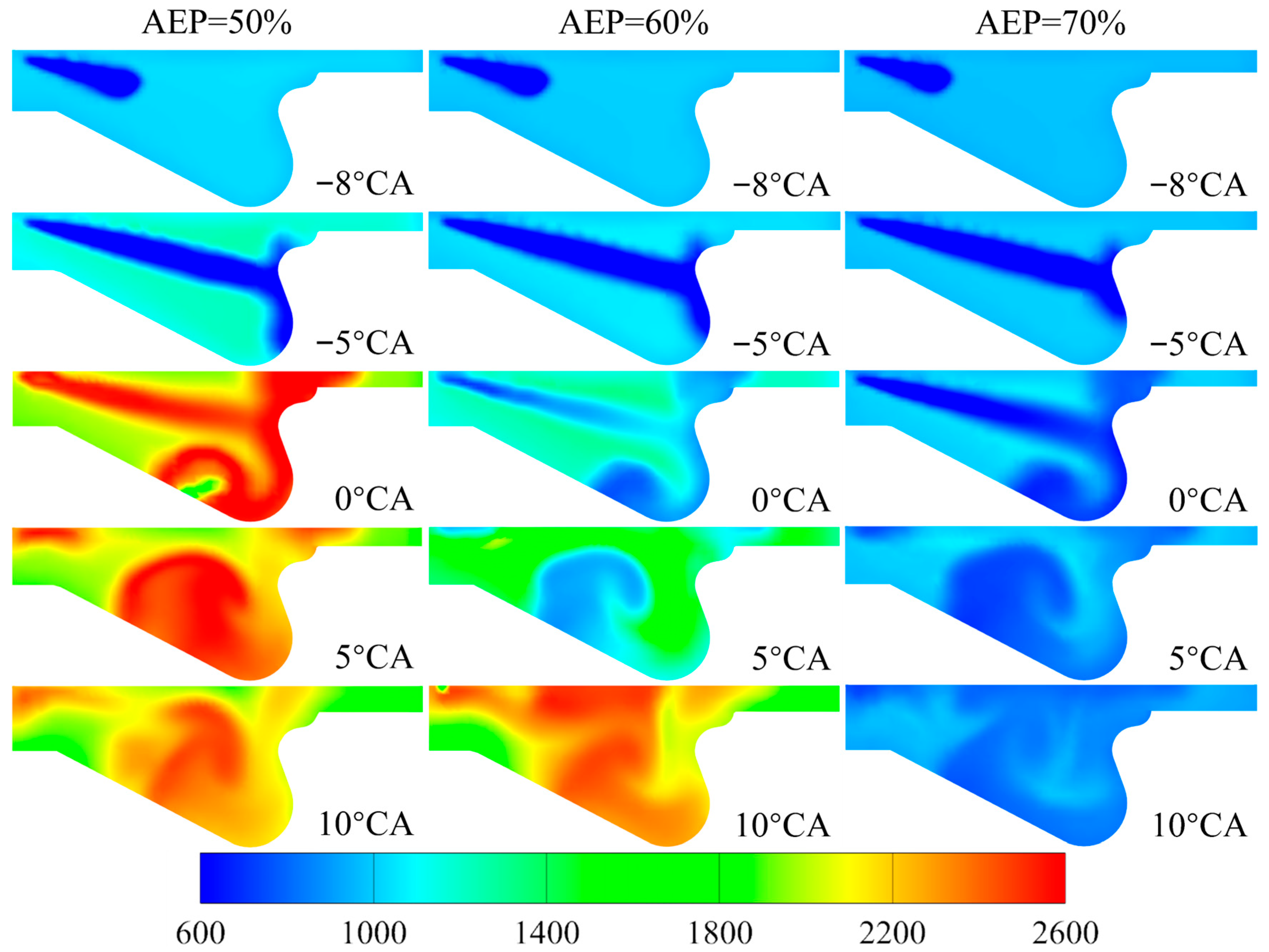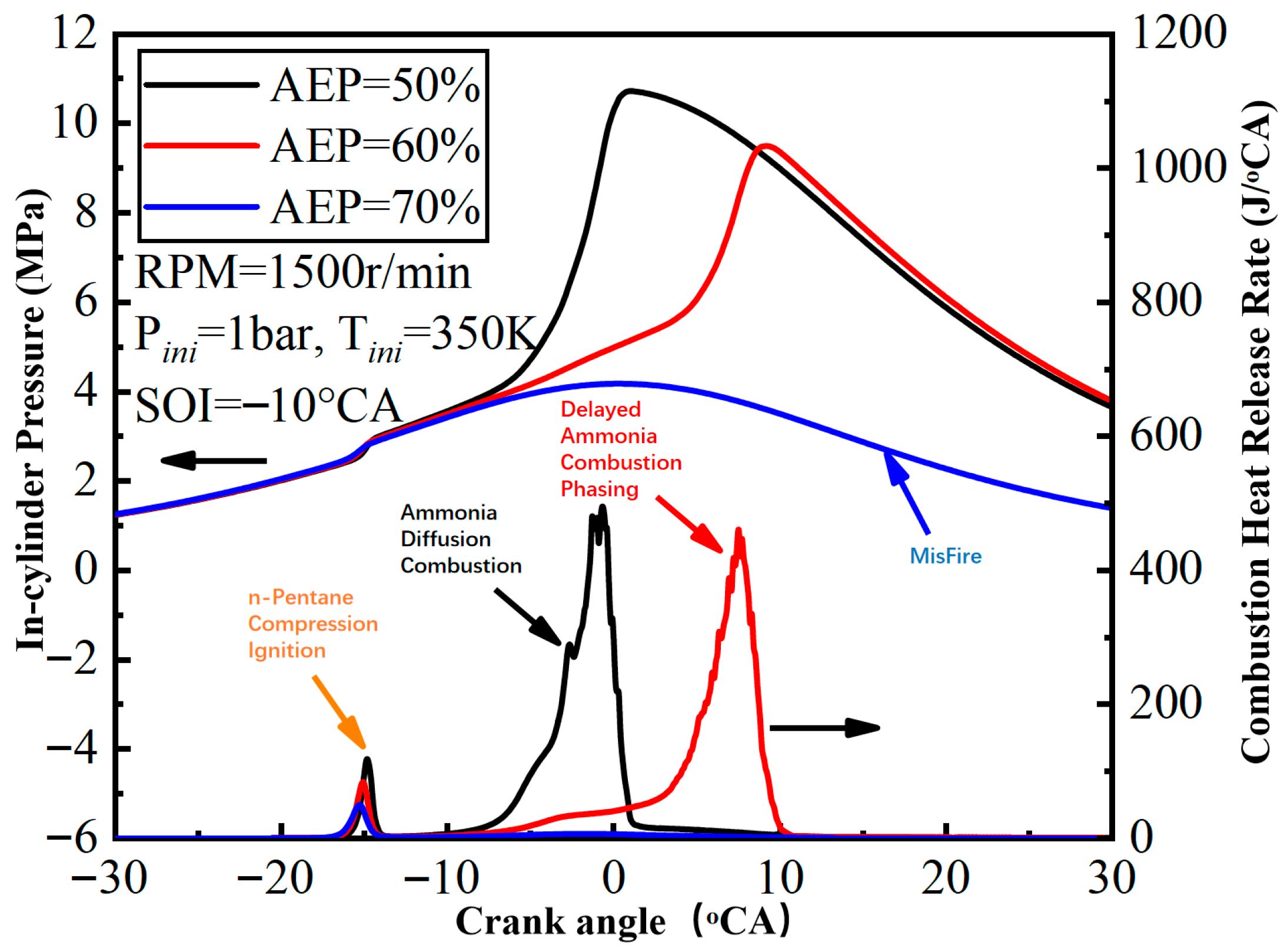 - An analysis of the impact of AEPs on combustion characteristics reveals that as the AEP increases, the ammonia ignition and combustion characteristics are markedly affected. At an AEP of 70%, significant misfire occurs, attributed to ammonia’s strong resistance to auto-ignition and its high evaporation latent heat.