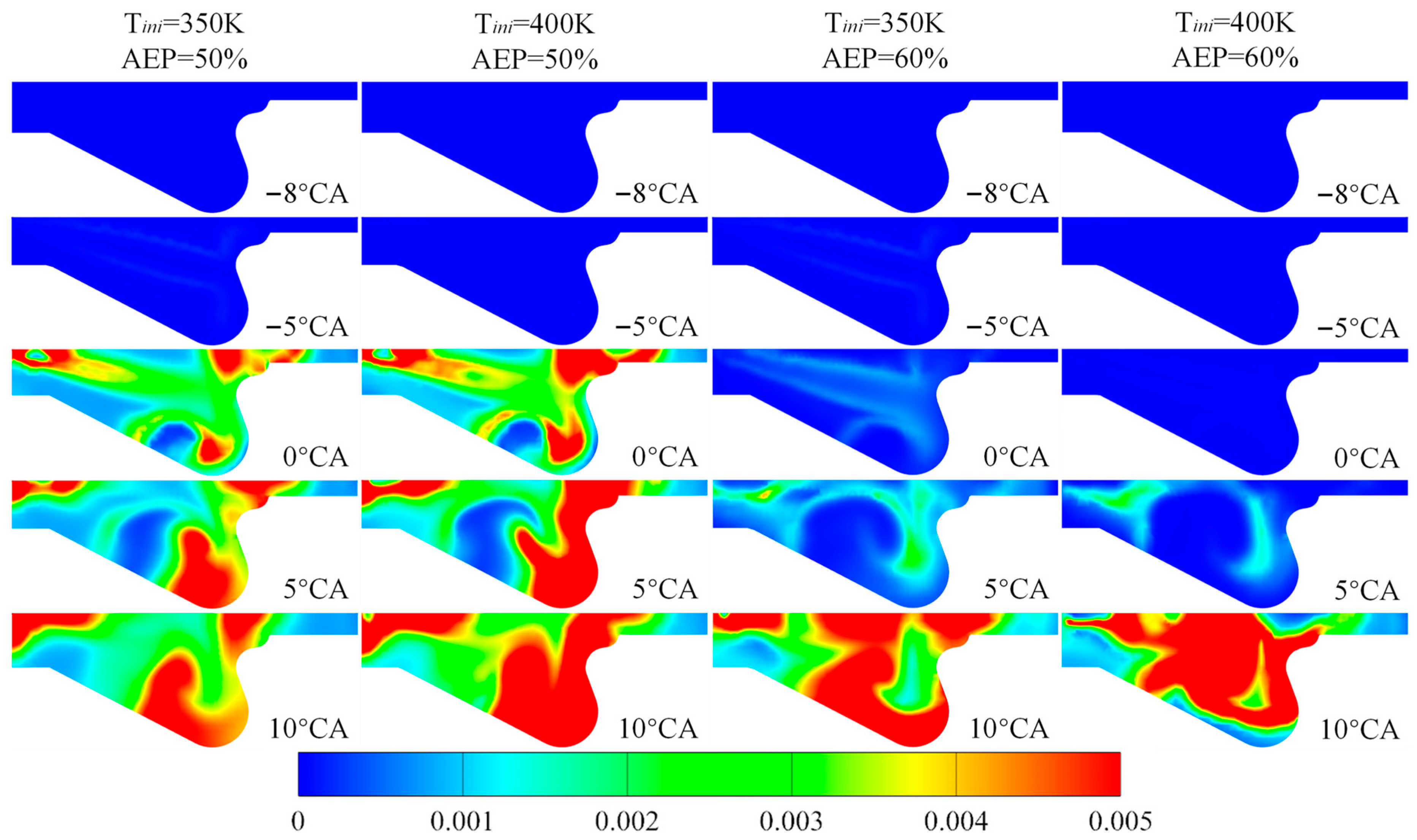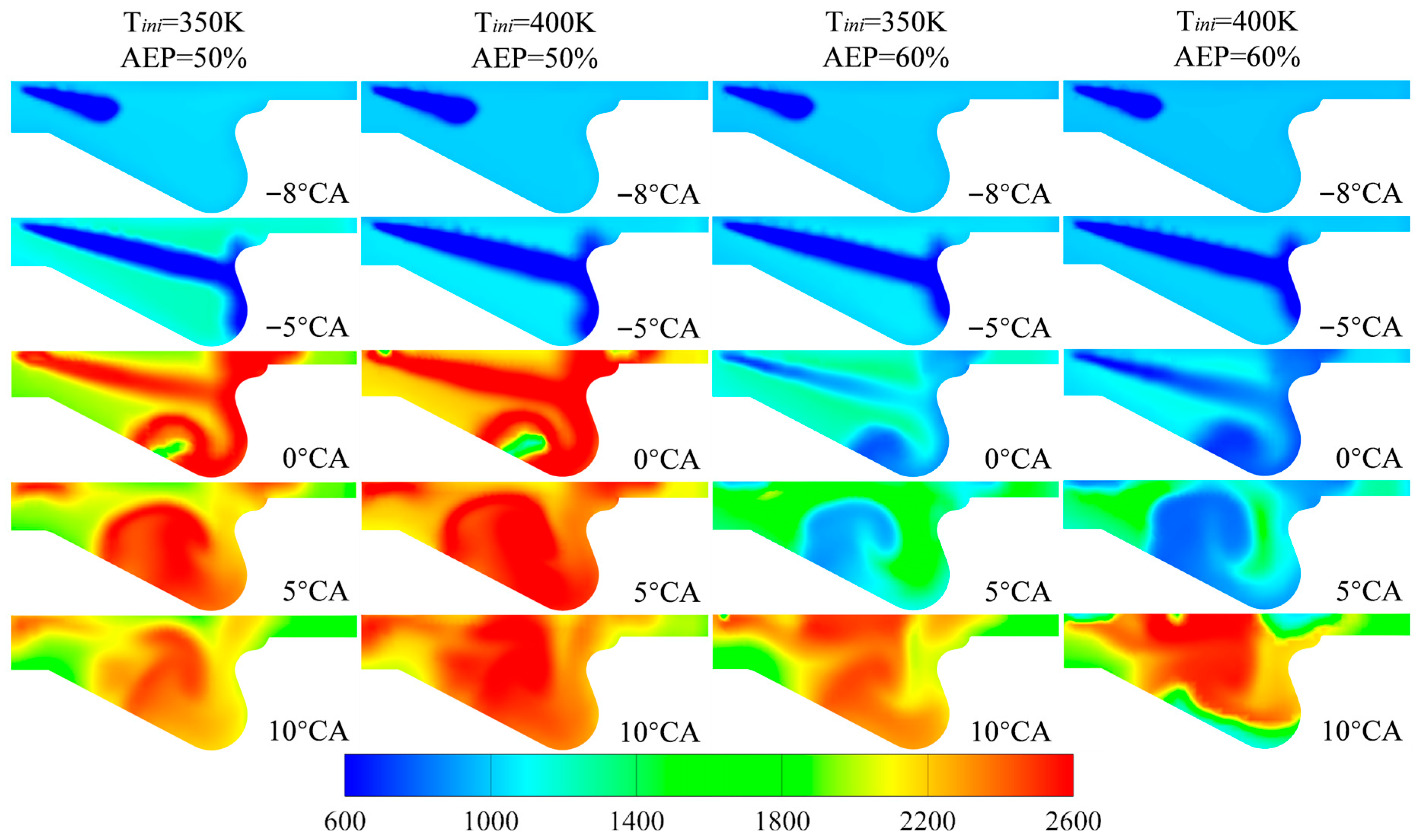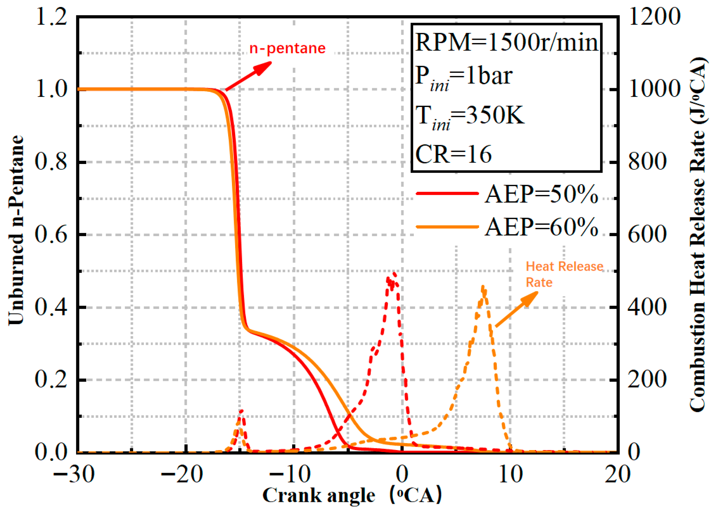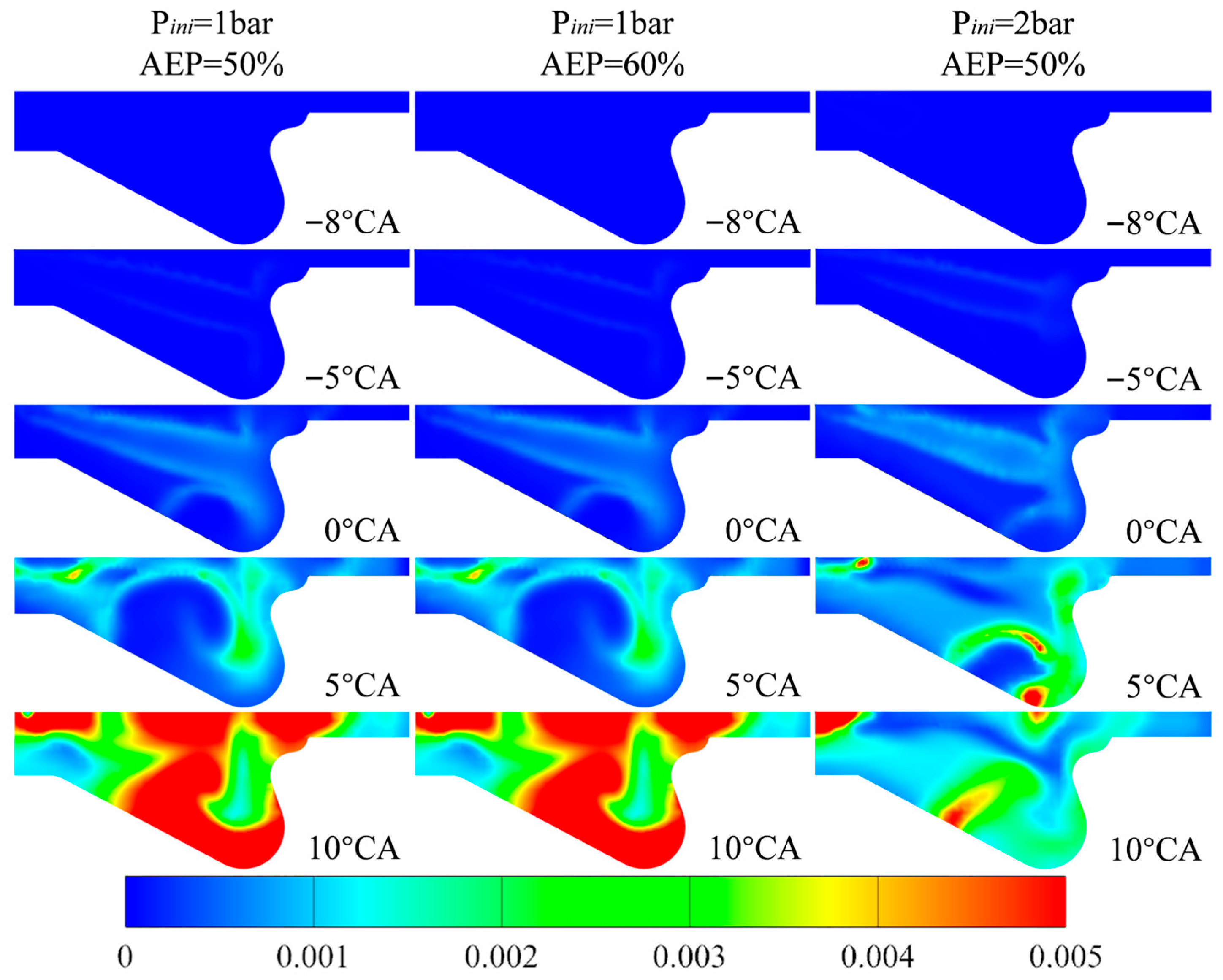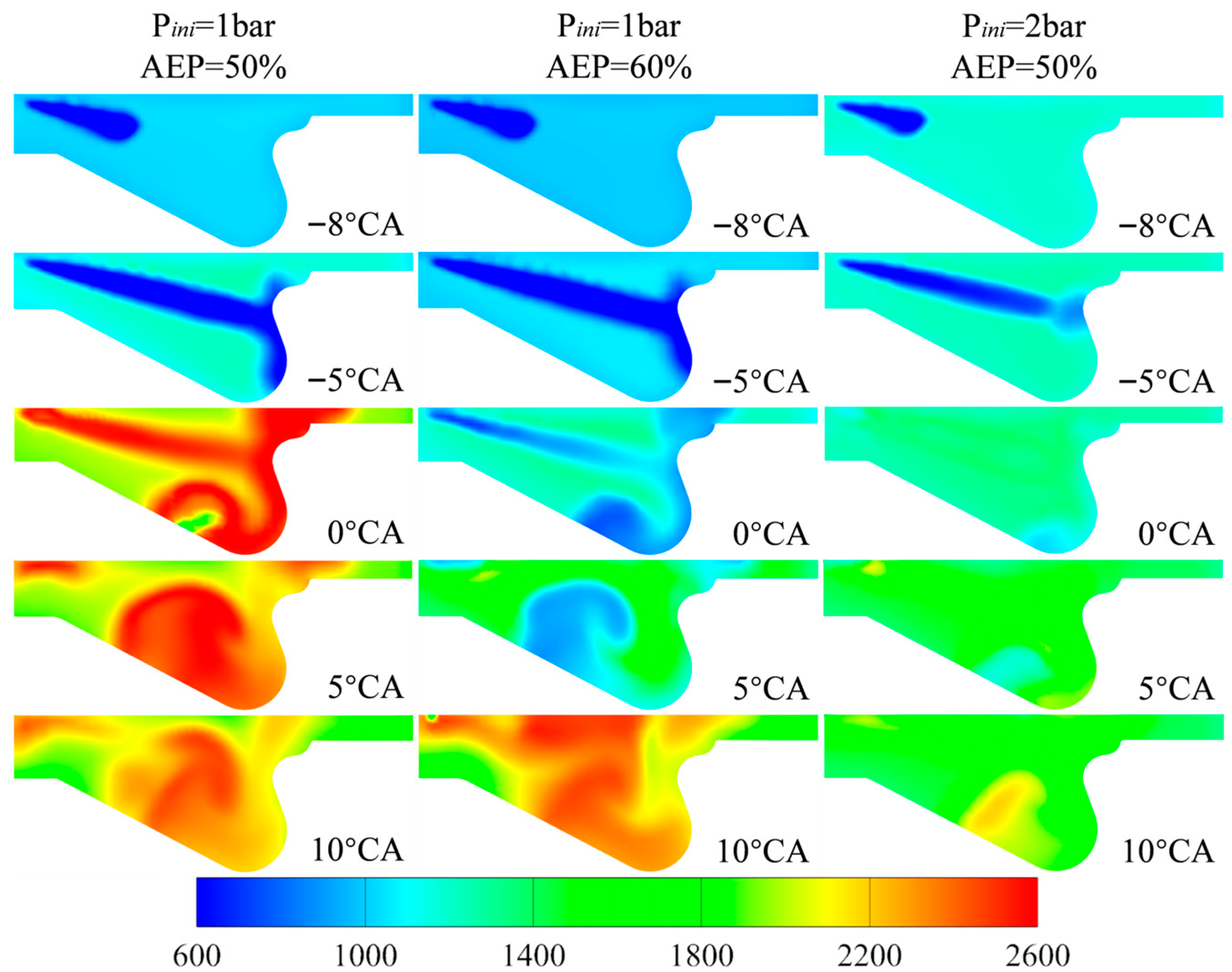 - An analysis of the impact of AEPs on combustion characteristics reveals that as the AEP increases, the ammonia ignition and combustion characteristics are markedly affected. At an AEP of 70%, significant misfire occurs, attributed to ammonia’s strong resistance to auto-ignition and its high evaporation latent heat.
