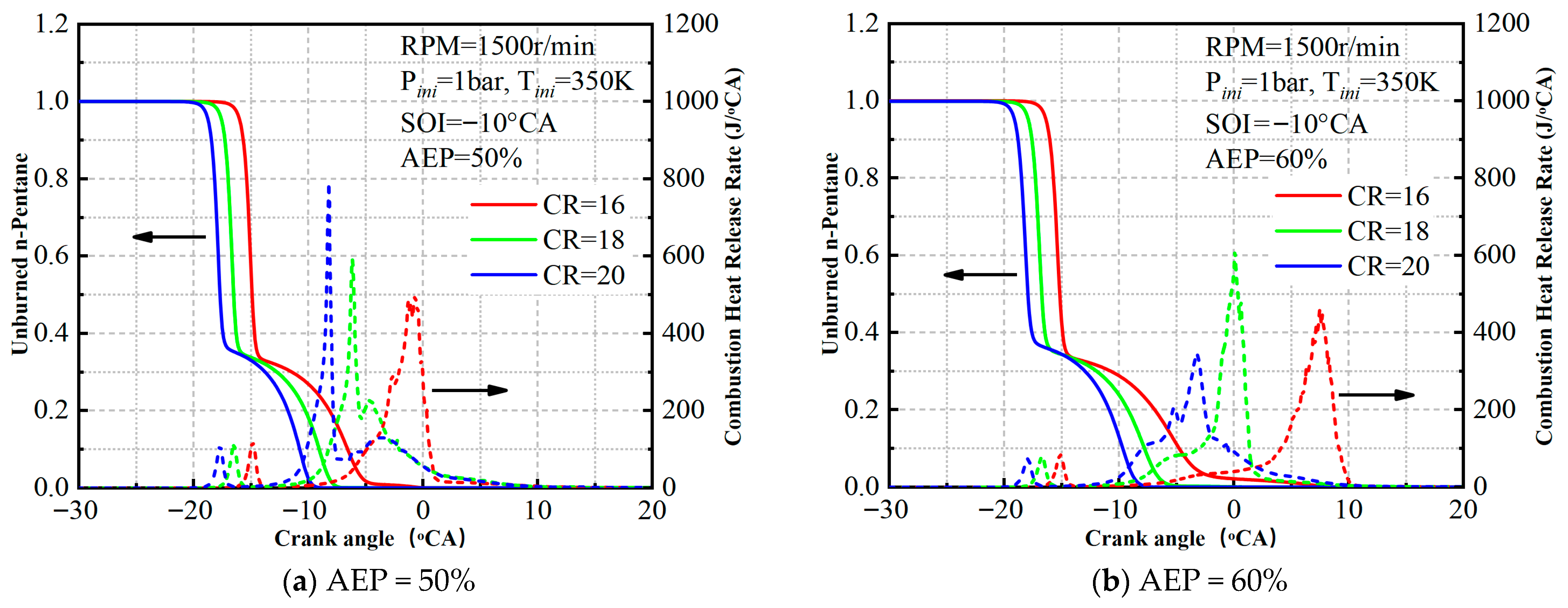 3.2. Effects of AEP on Combustion Characteristics at Various Compression Ratios (CRs)