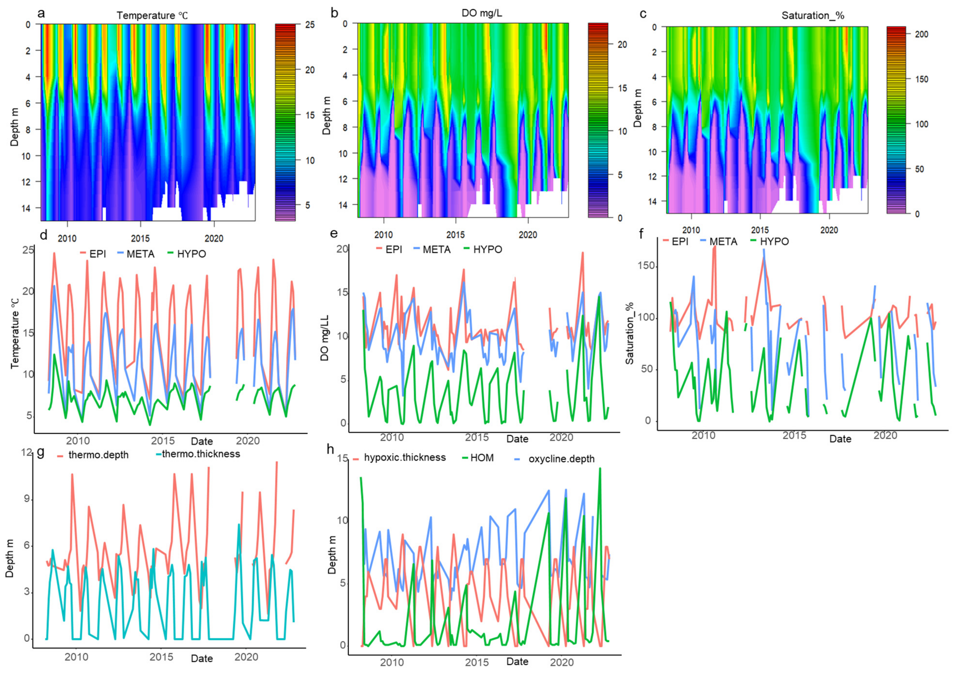 - Liu, M.; Zhang, Y.; Zhou, Y.; Shi, K.; Zhu, G.; Sun, X. Thermal structure controlled by morphometry and light attenuation across subtropical reservoirs. Hydrol. Process. 2022, 36, e14502. [Google Scholar] [CrossRef]