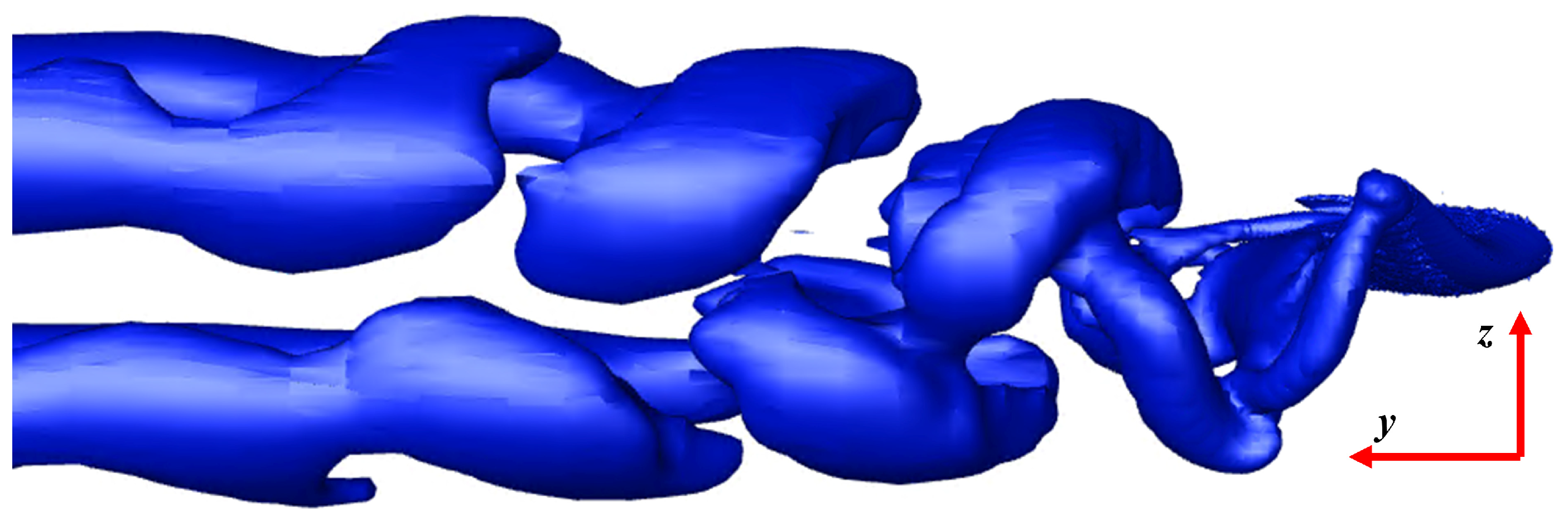 - Zhang, D.; Huang, Q.G.; Pan, G.; Yang, L.M.; Huang, W.X. Vortex dynamics and hydrodynamic performance enhancement mechanism in batoid fish oscillatory swimming. J. Fluid Mech. 2022, 930, A28. [Google Scholar] [CrossRef]