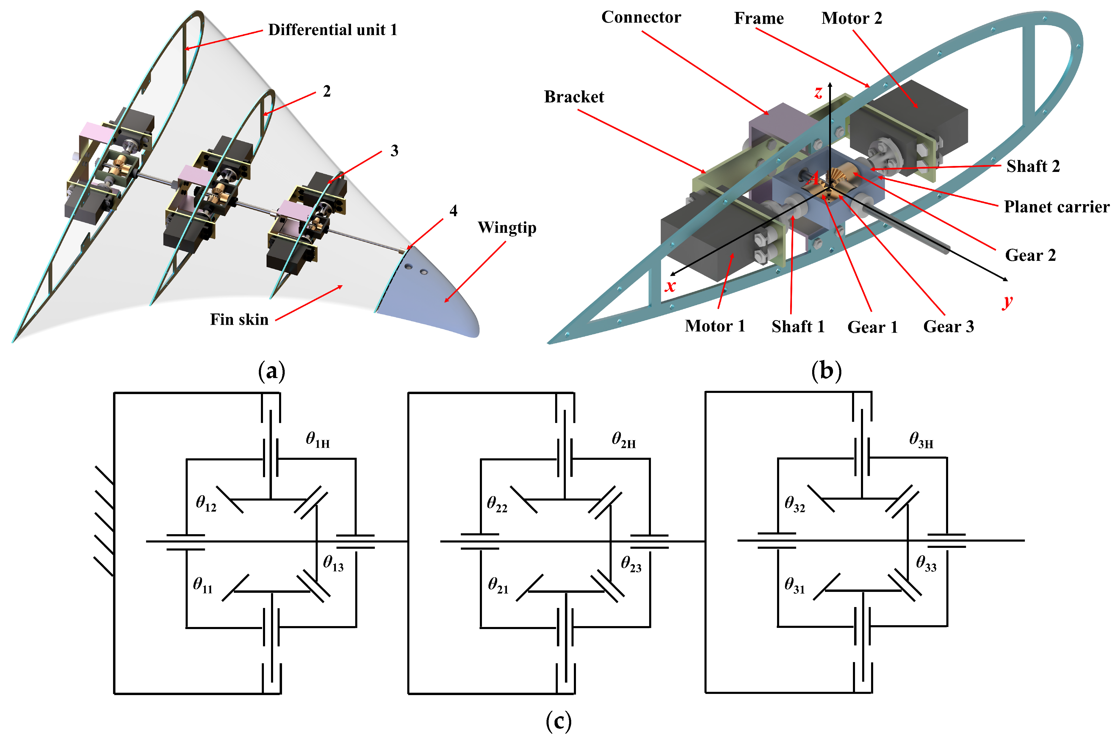 - The use of differential gear units as the drive mechanism, offering advantages over traditional linkage systems, such as two coupled motions, a compact structure, and ease of integration within the pectoral fin.