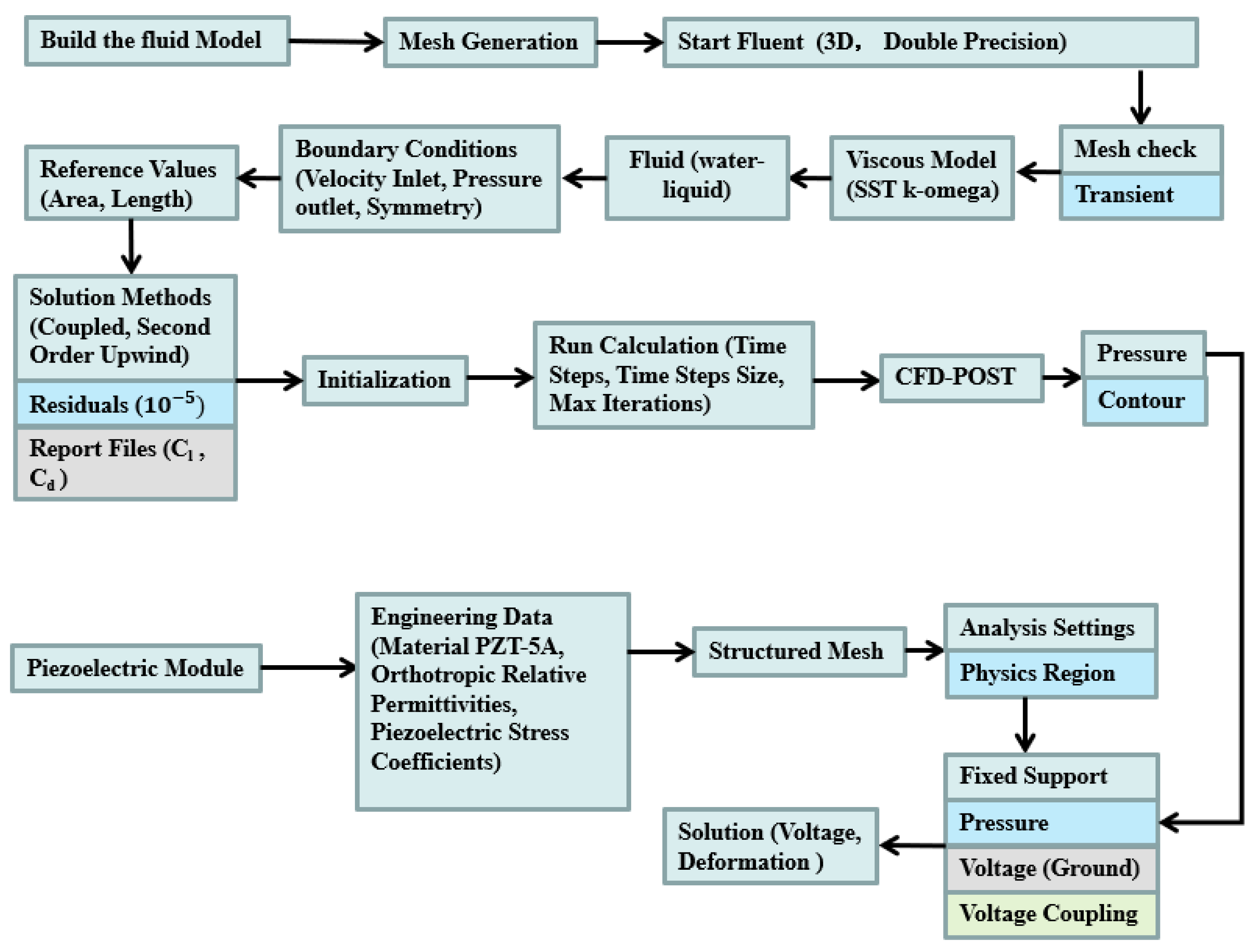 - Li, S.; Sun, S.; Cui, J. Fluid–structure interaction analysis of a piezoelectric wave energy converter positioned at the wave surface. Phys. Fluids 2025, 37, 013121. [Google Scholar] [CrossRef]