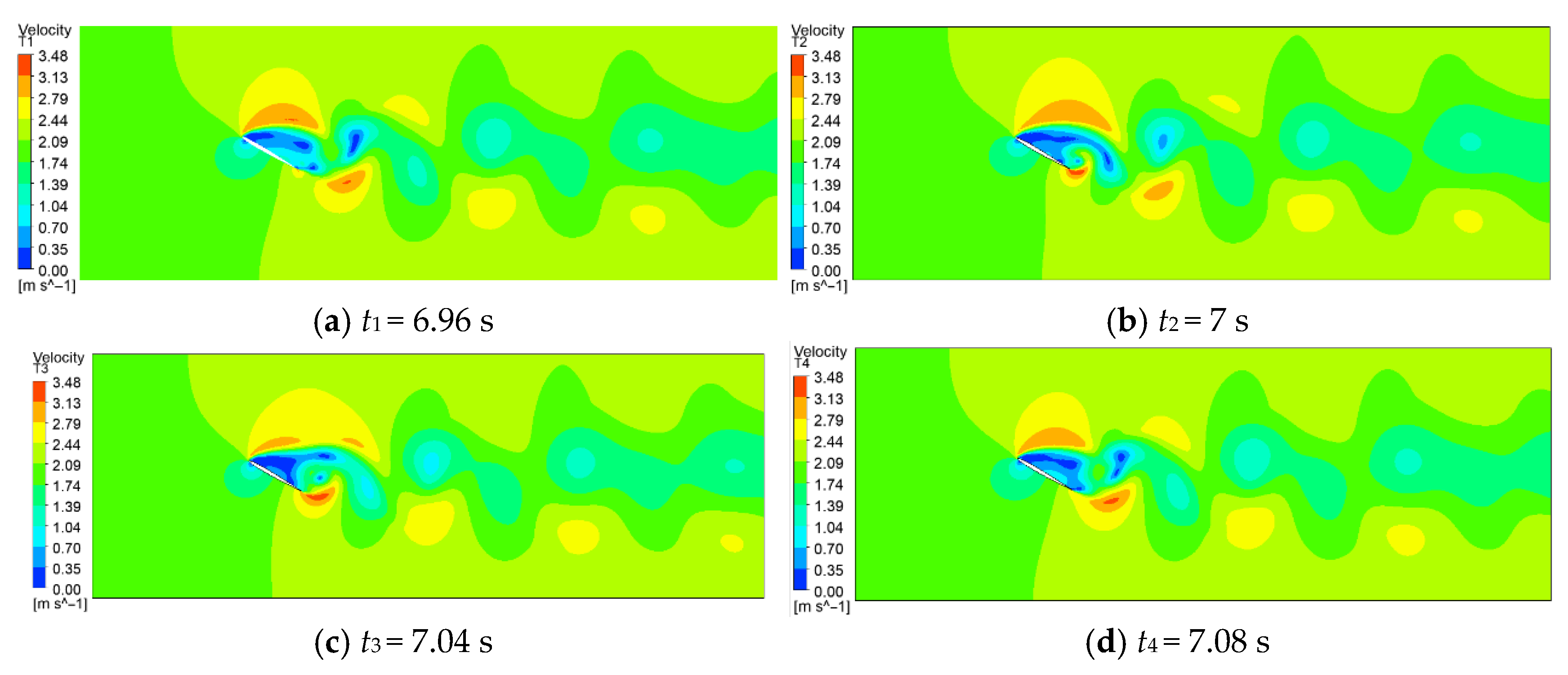 - Jamil, M.; Javed, A.; Shah, S.I.A.; Mansoor, M.; Hameed, A.; Djidjeli, K. Performance Analysis of Flapping Foil Flow Energy Harvester Mounted on Piezoelectric Transducer using Meshfree Particle Method. J. Appl. Fluid Mech. 2020, 13, 1859–1872. [Google Scholar] [CrossRef]