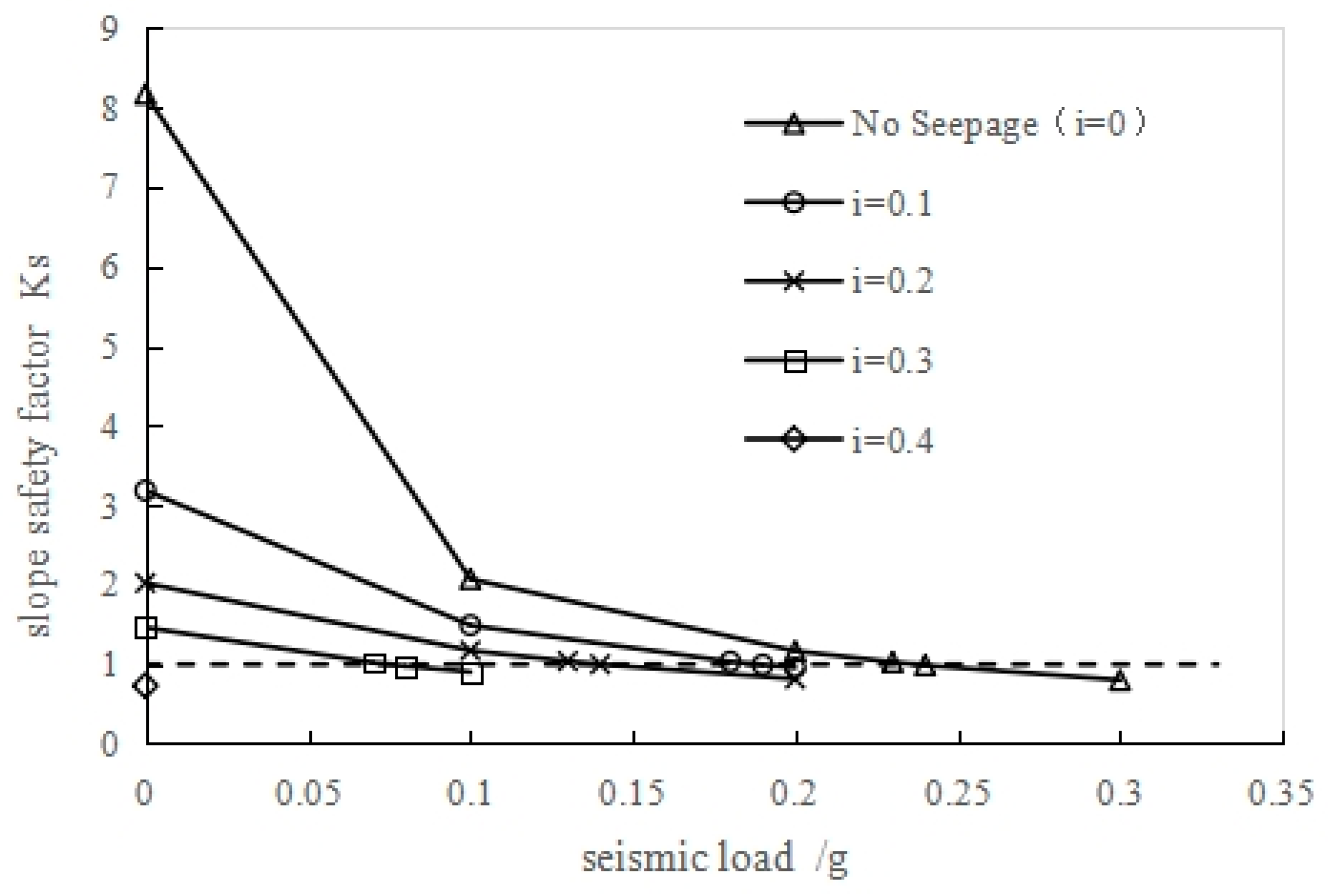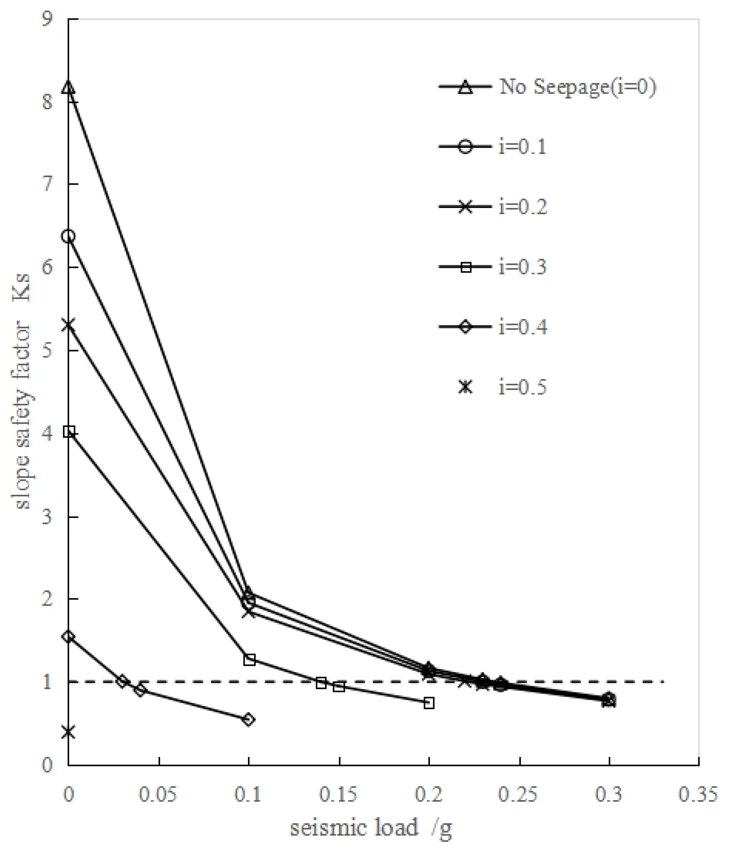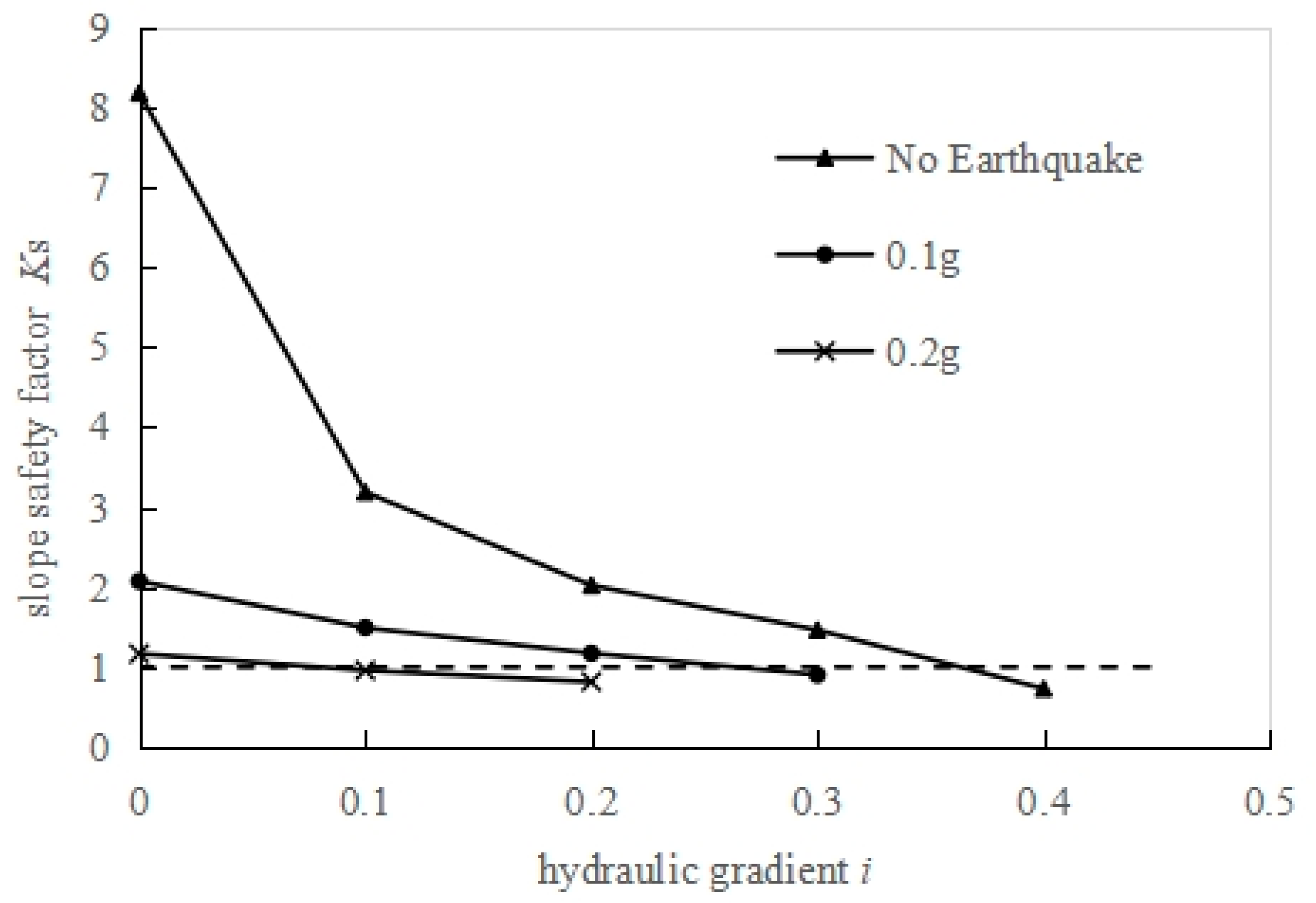 | Working Condition Number | Seismic Load | Hydraulic Gradient i | Seepage Velocity v (m/s) | Safety Factor Ks |
