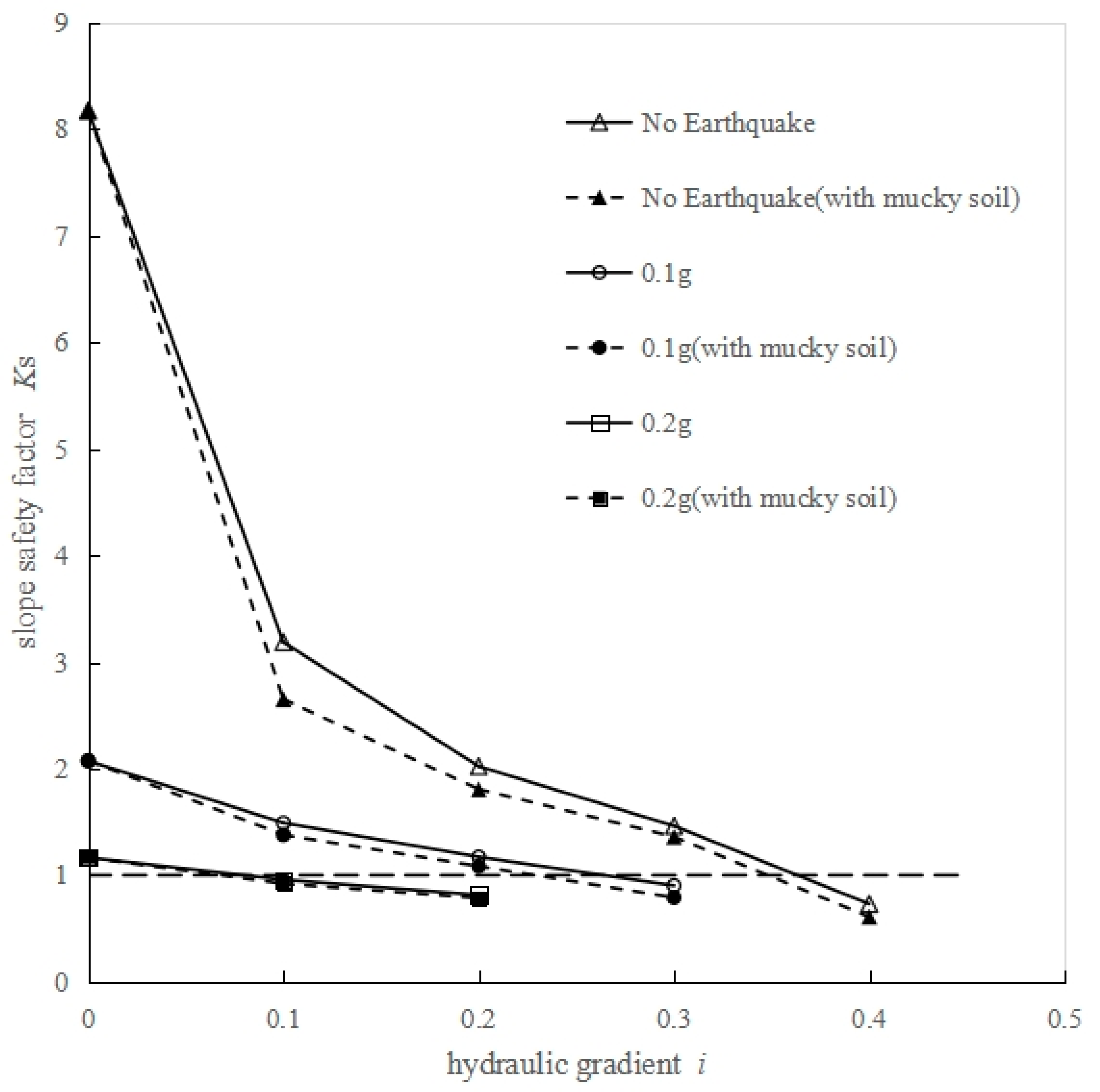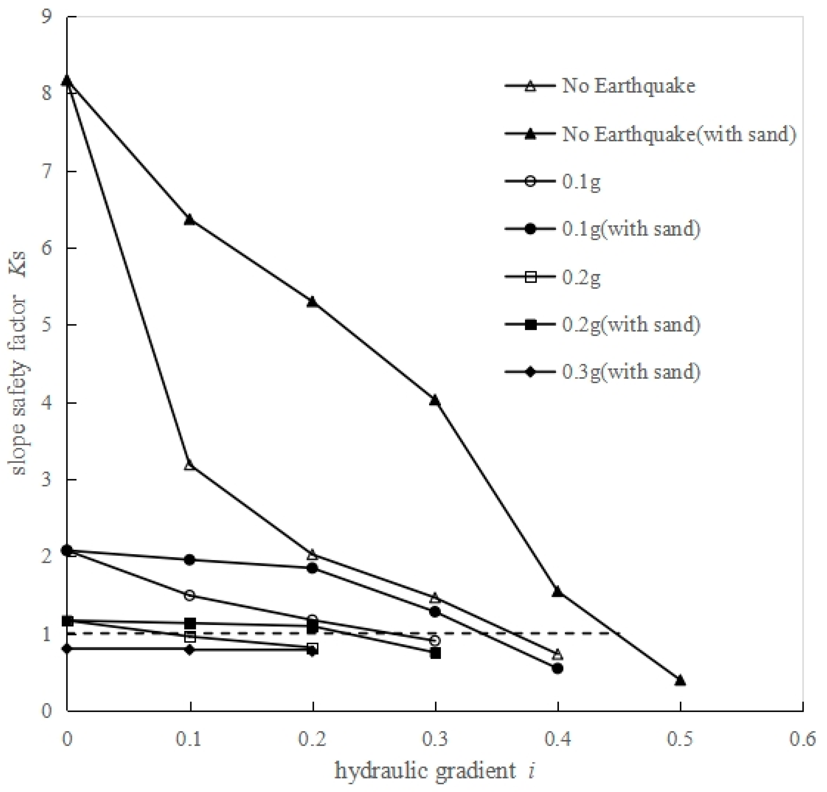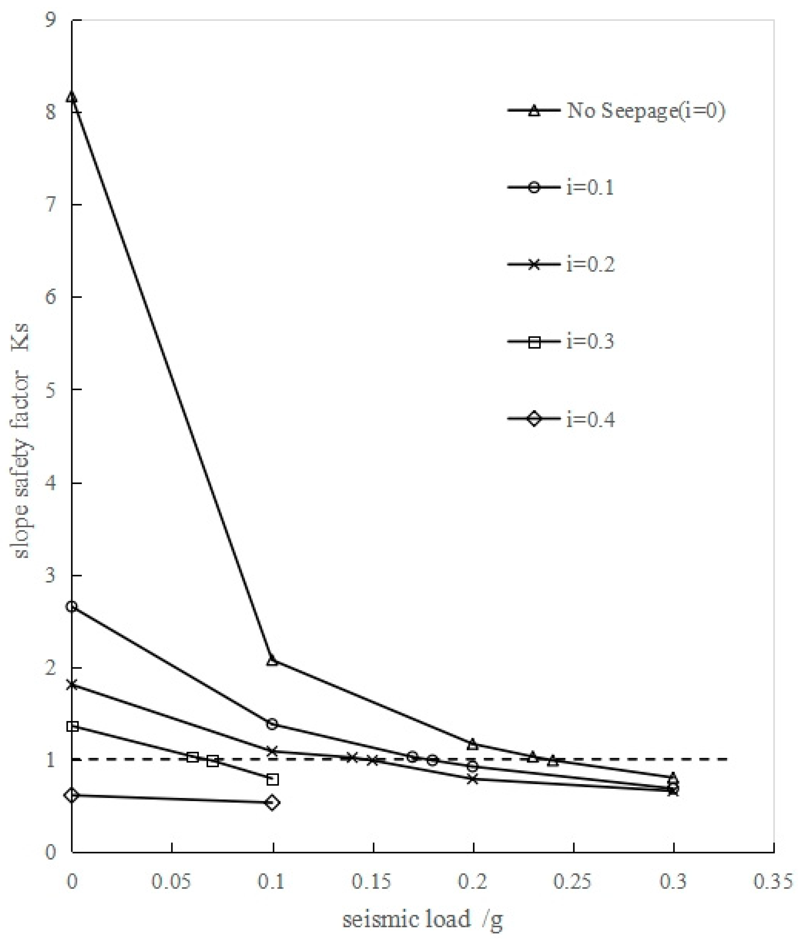 | Working Condition Number | Seismic Load | Hydraulic Gradient i | Seepage Velocity v (m/s) | Safety Factor Ks |