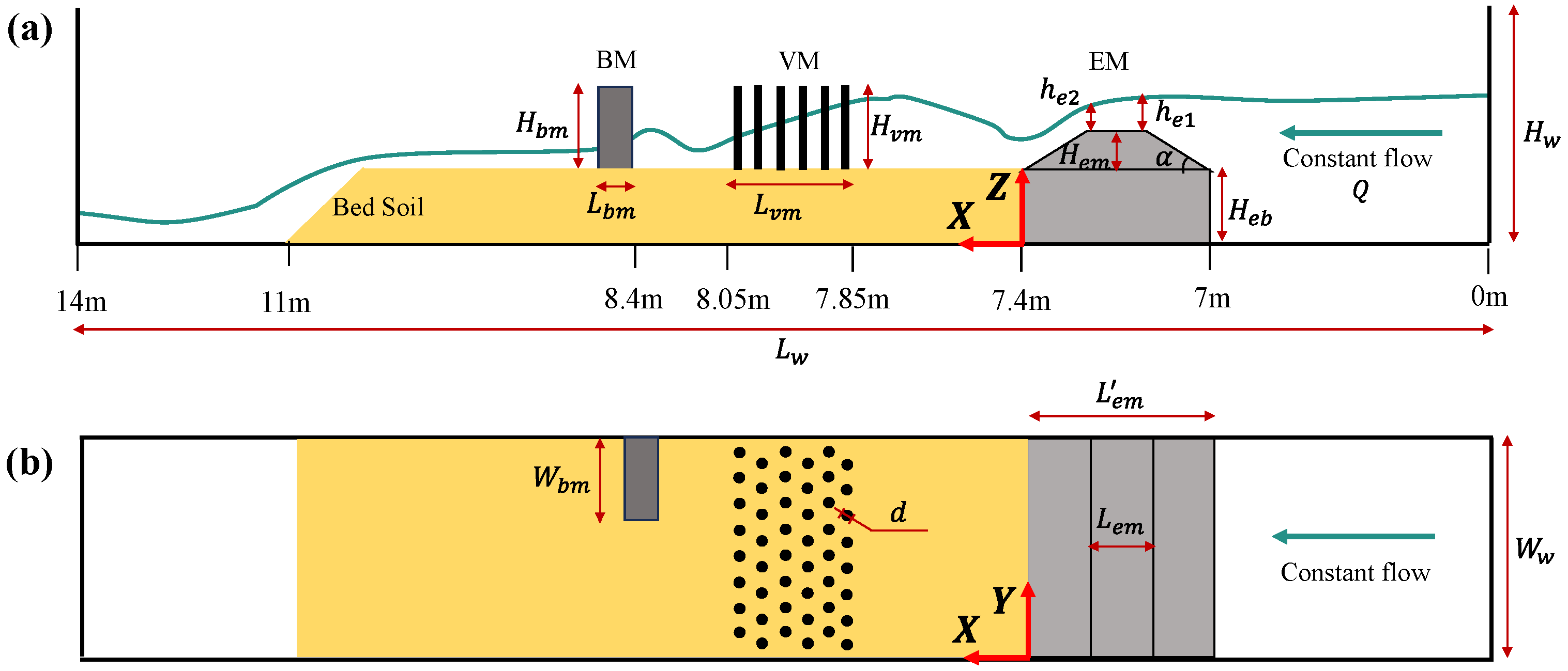 - Han, D.; He, Z.; Lin, Y.; Wang, Y.; Guo, Y.; Yuan, Y. Hydrodynamics and sediment transport of downslope turbidity current through rigid vegetation. Water Resour. Res. 2023, 59, e2023WR034421. [Google Scholar] [CrossRef]